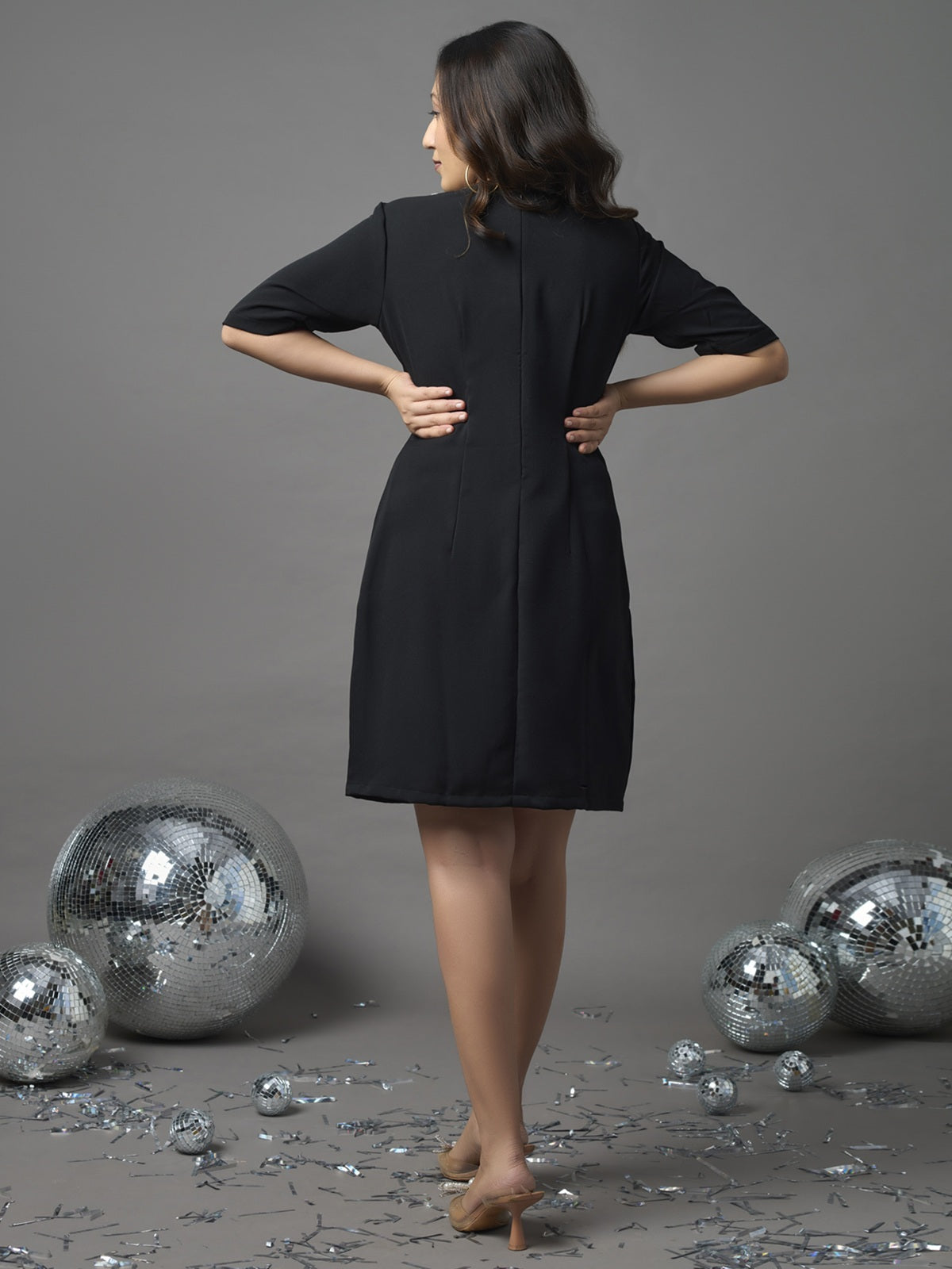 Elegance meets ease in this stylish black version of our bestselling short dress. Featuring diamond bows along the side seams and graceful elbow-length sleeves, it’s the perfect piece to slip into when you want sparkle with zero effort.