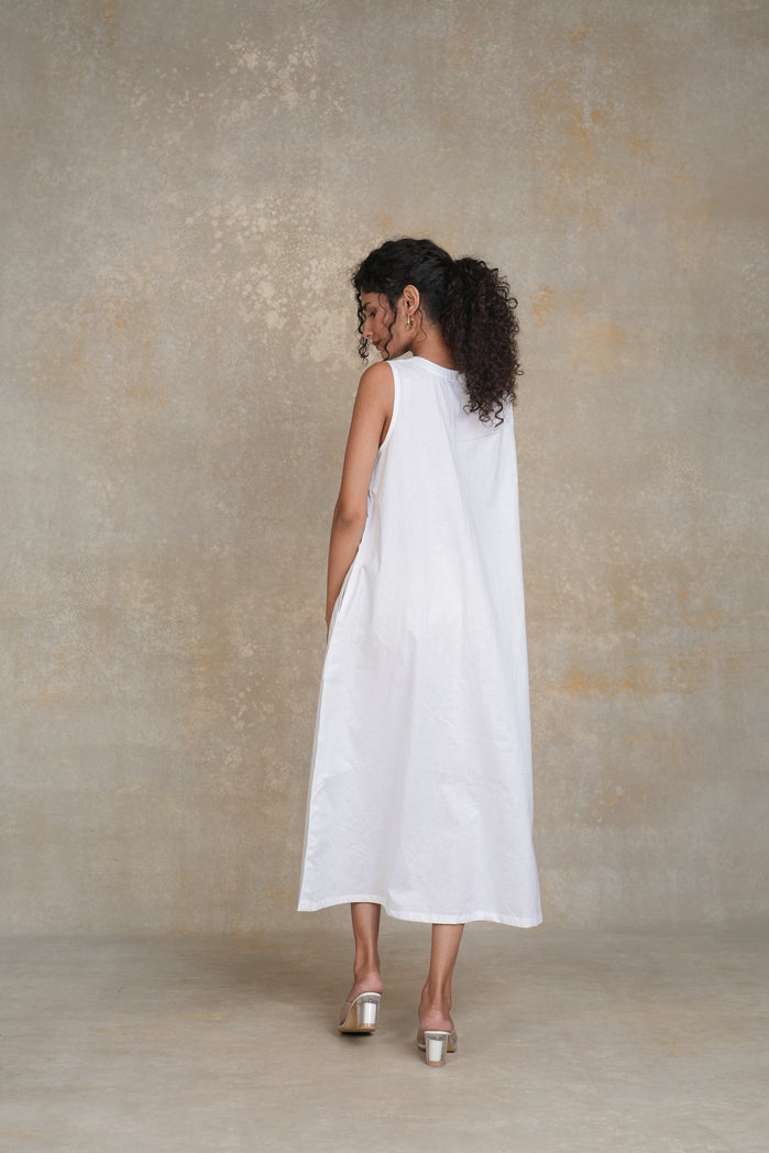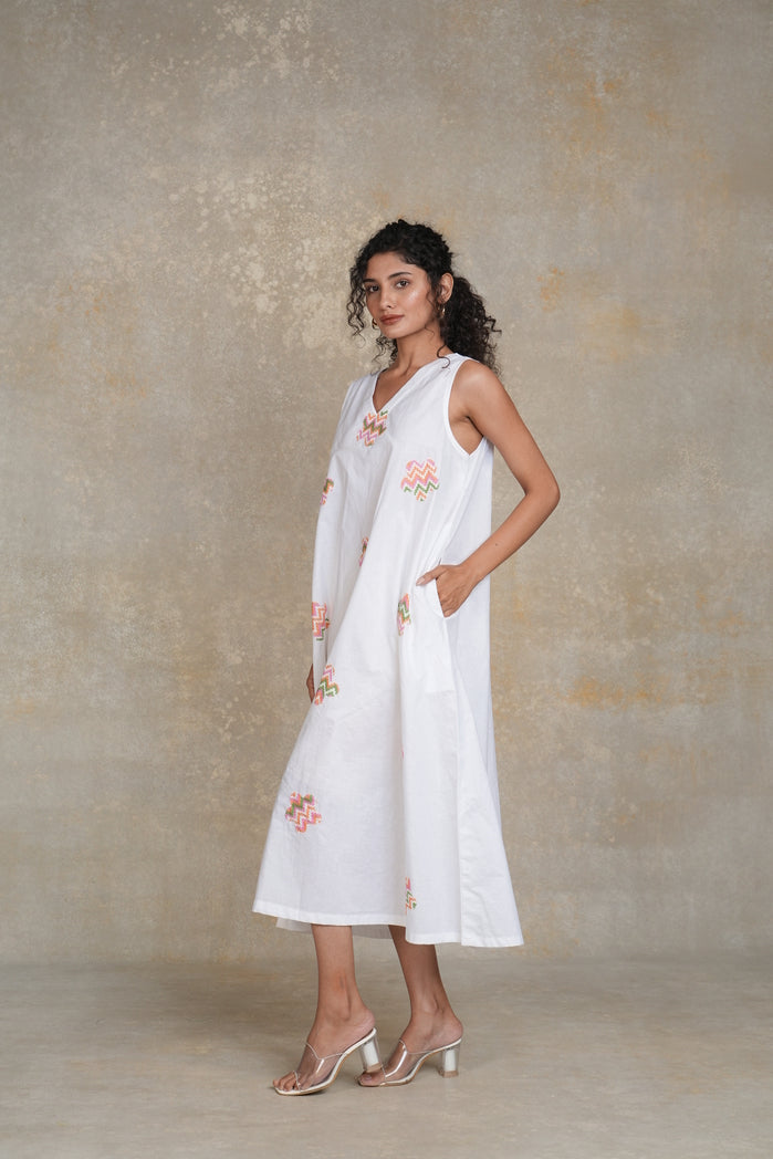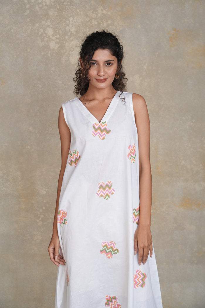The Cali Dress from Trabea’s Golden Hour collection is a white, sleeveless mid-length dress designed for women, featuring a flattering V-neck and colorful flower patches around the front. With its loose and relaxed fit, this summer dress for women offers both comfort and effortless style, making it perfect for casual outings, beach days, or summer gatherings