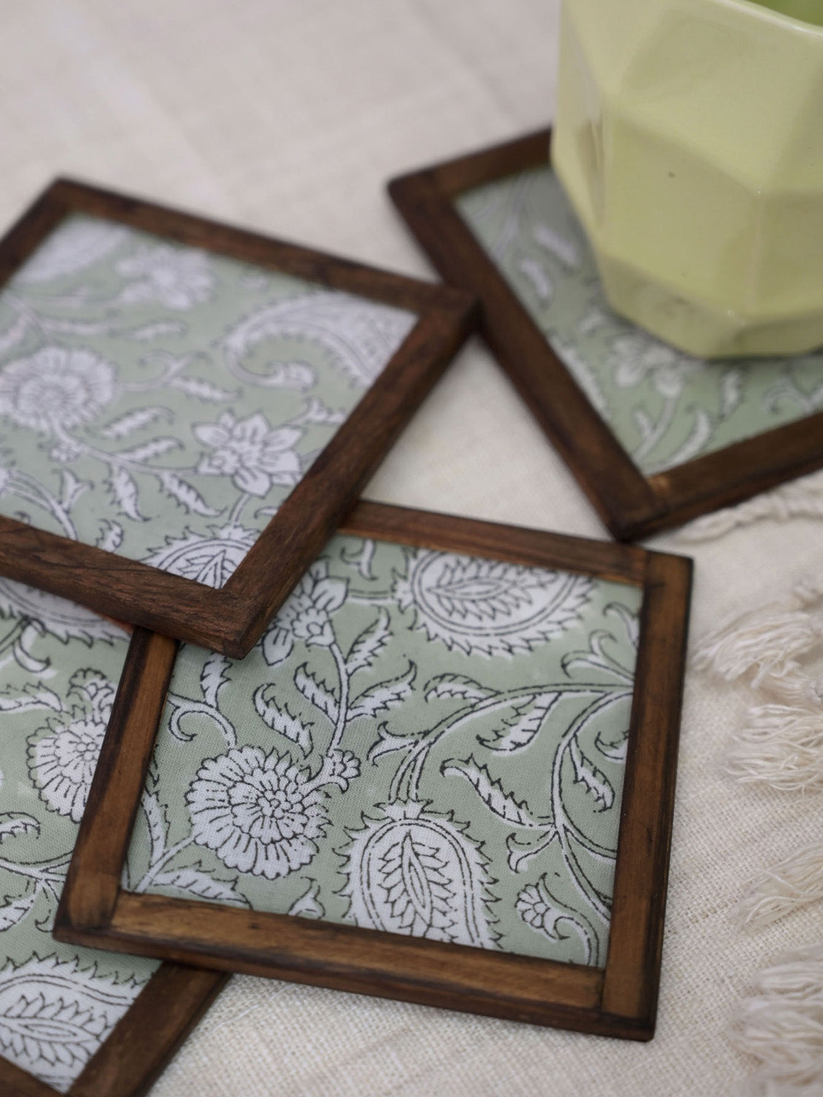 Handwoven cotton coasters that bring stories to life during conversations, while also evoking a sense of peace and coziness. Share intimate moments with loved ones over coffee, letting the block-printed floral garden designs inspire deep connections. Elevate your table setting with these charming coasters, perfect for adding a touch of warmth to your home decor.