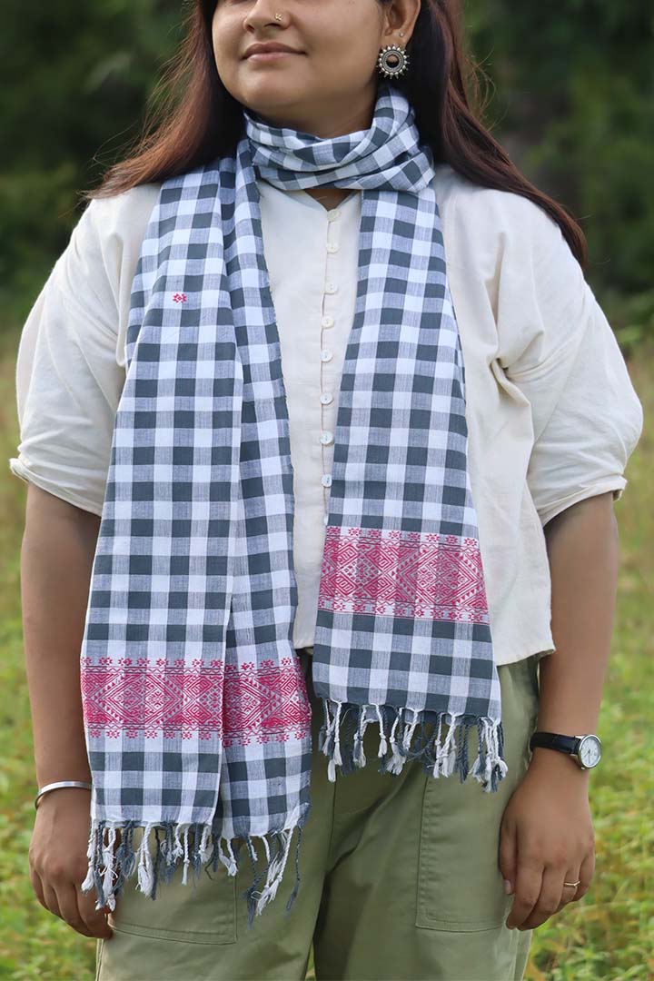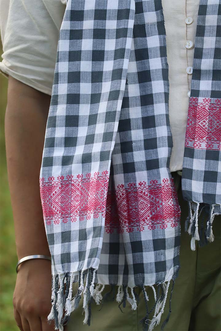 This is a checked pattern stole, traditionally handwoven by the Mising tribe women in Majuli. the motifs are usually inspired by the local flora, fauna & landscape imitating the flowers, ferns, trees, butterflies, animals, birds, and waterbodies. Traditional looms in Majuli are manual, throw shuttle looms. The motifs are manually inserted using the extra weft technique which is almost like embroidery on the loom.