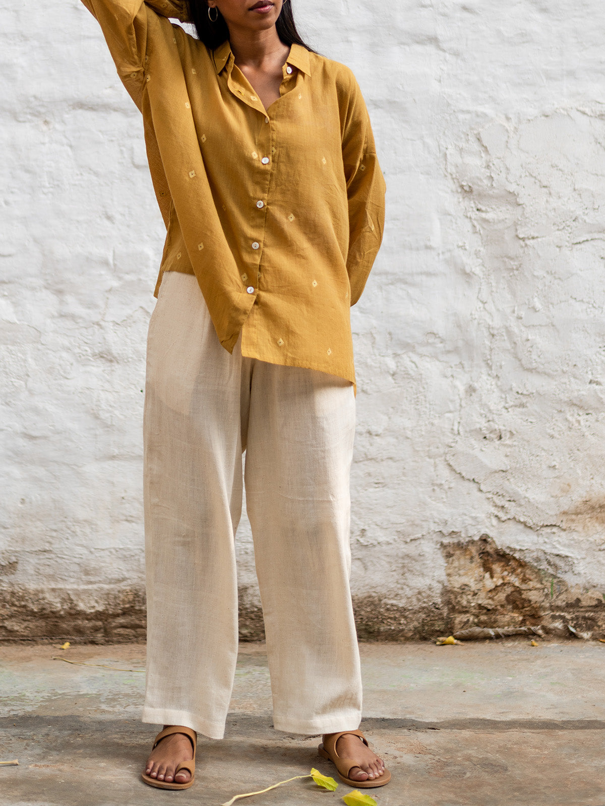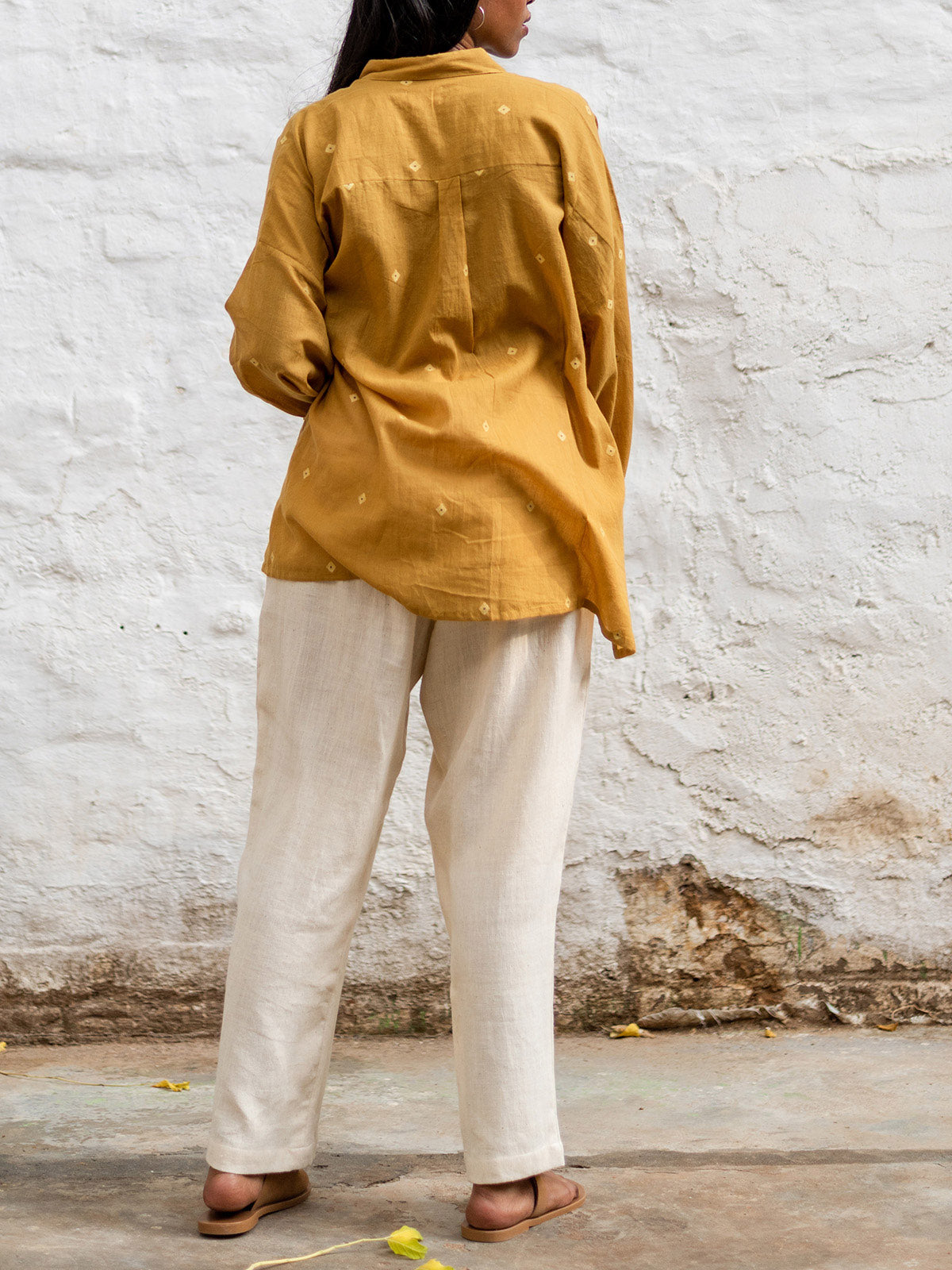 Introducing our signature big-shirt, adorned with diamond-shaped Jamdani motifs and delicate hints of Indigo. This remarkable piece is naturally dyed using marigold leaves, showcasing a commitment to eco-friendly practices. The oversized design features full sleeves, an uneven hem, and drop shoulders, combining comfort and style effortlessly. Meticulously woven with skilled craftsmanship, this shirt exudes an air of elegance and uniqueness.