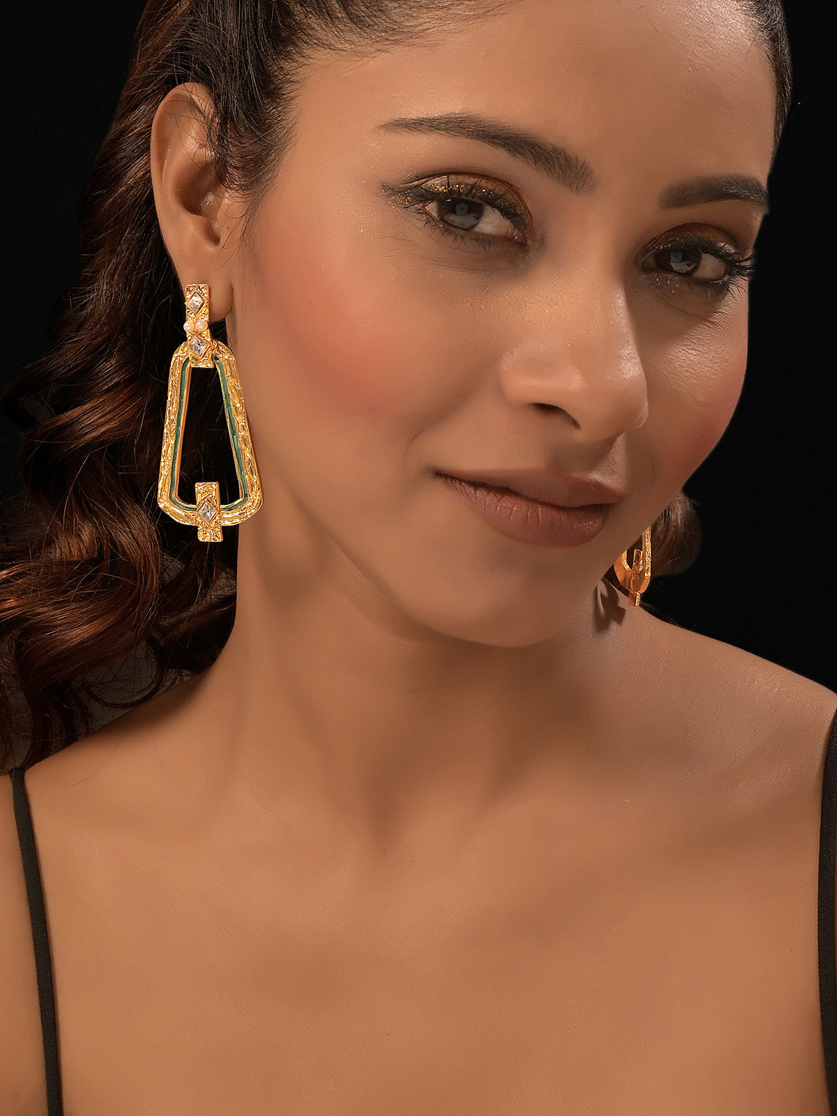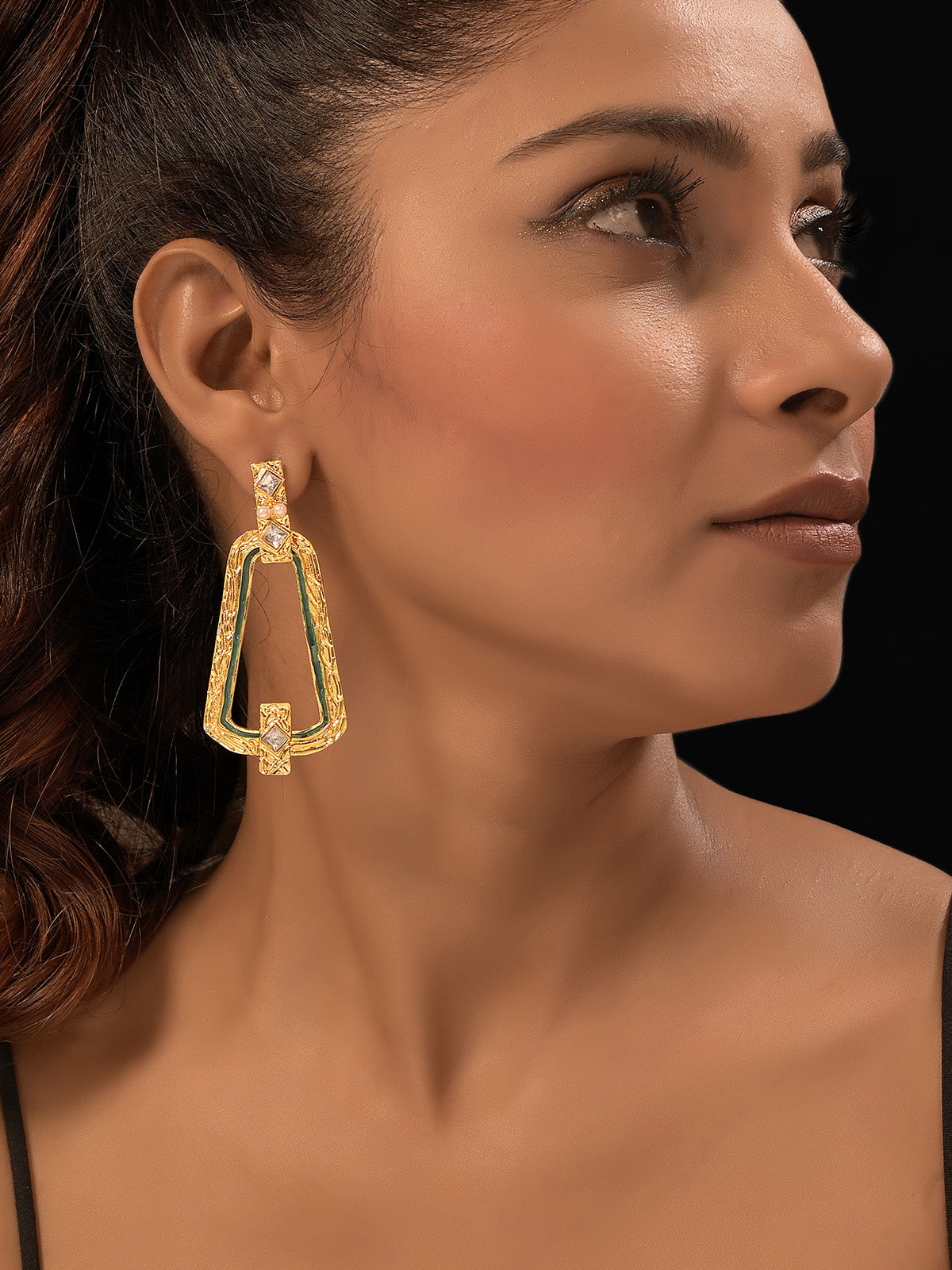 Cressina Earrings are irresistible. Stylish and sleek, they are absolutely perfect to pair with bracelets, choker or ring. Marvelously lightweight, Cressina Earrings are textured and finely handcrafted in 18K Gold plated brass.