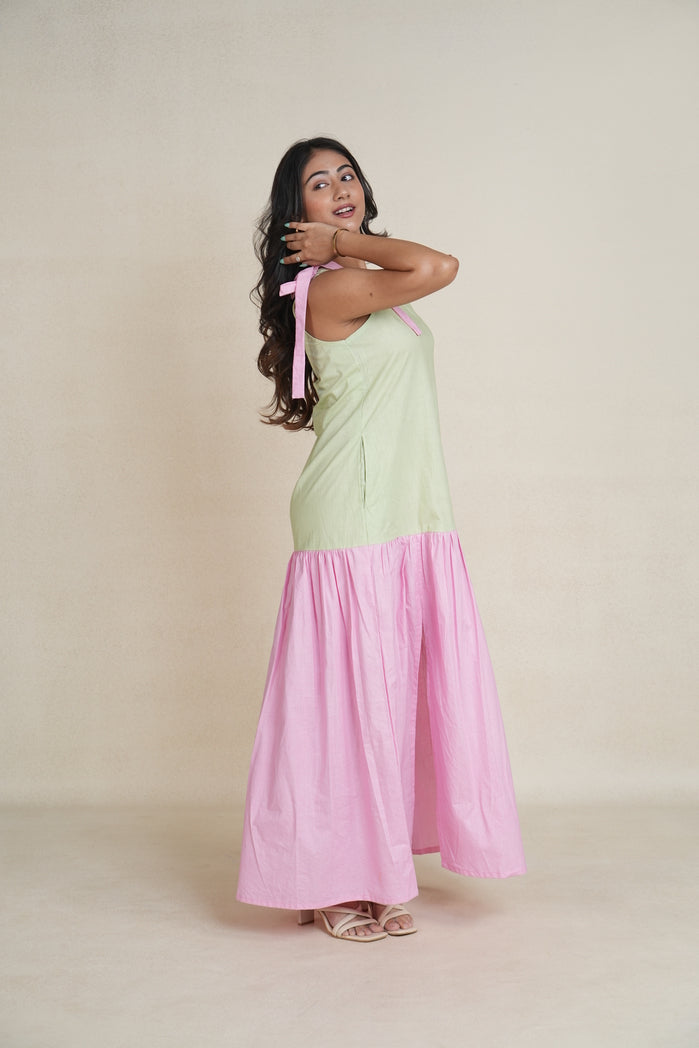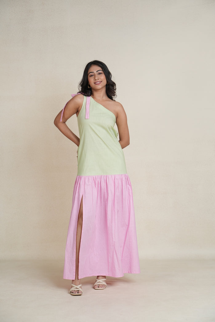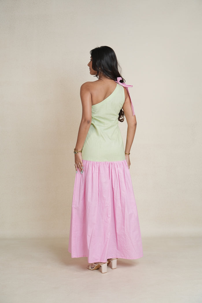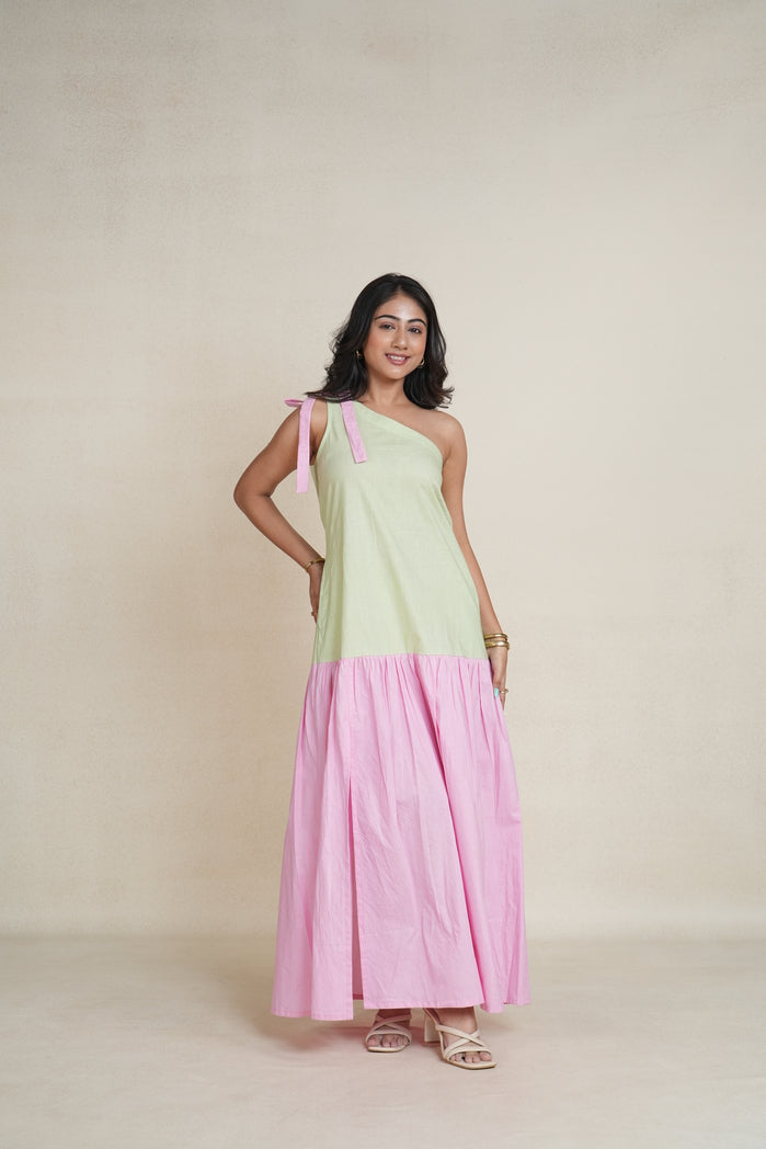 The Dali Dress from Trabea’s Golden Hour collection is a playful one-shoulder dress designed for women, featuring a soft pastel green bodice complemented by a flowing pink gathered skirt. The delicate shoulder tie detail adds a charming touch, giving it the perfect summer vibe. This dress for women is ideal for casual outings, summer parties, or vacations, offering both comfort and style.