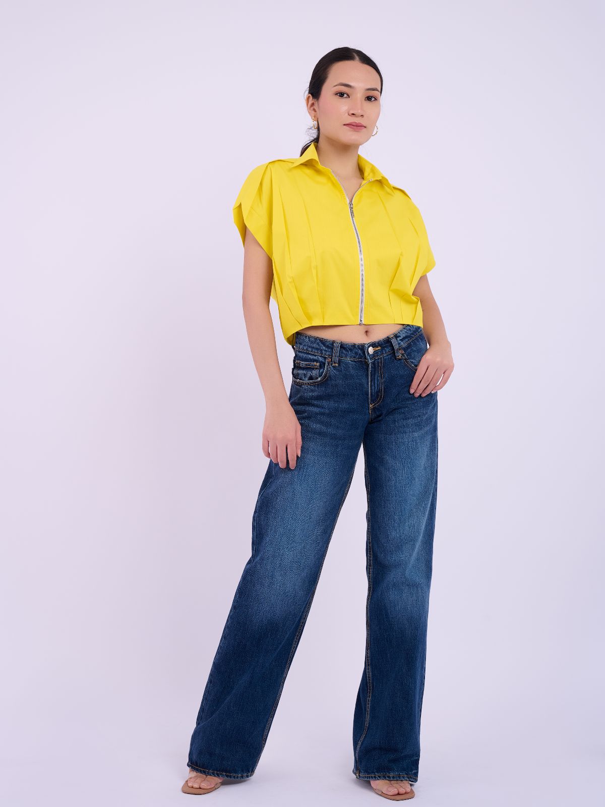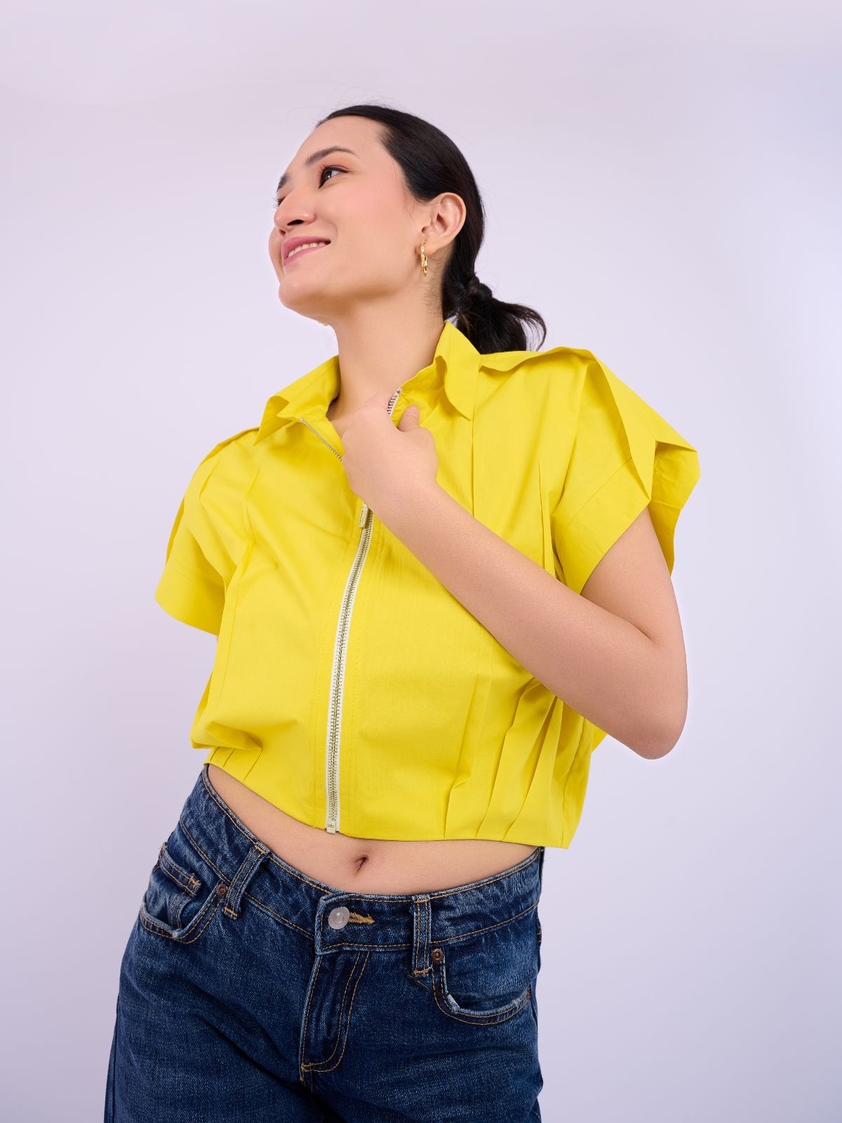 Bright, bold, and unapologetically fun — the Daphnie Crop Top in Lime is your summer statement piece. Crafted from crisp cotton poplin, this zip-up crop top features a structured collar, relaxed short sleeves, and a flattering cinched hem for that effortlessly cool silhouette.