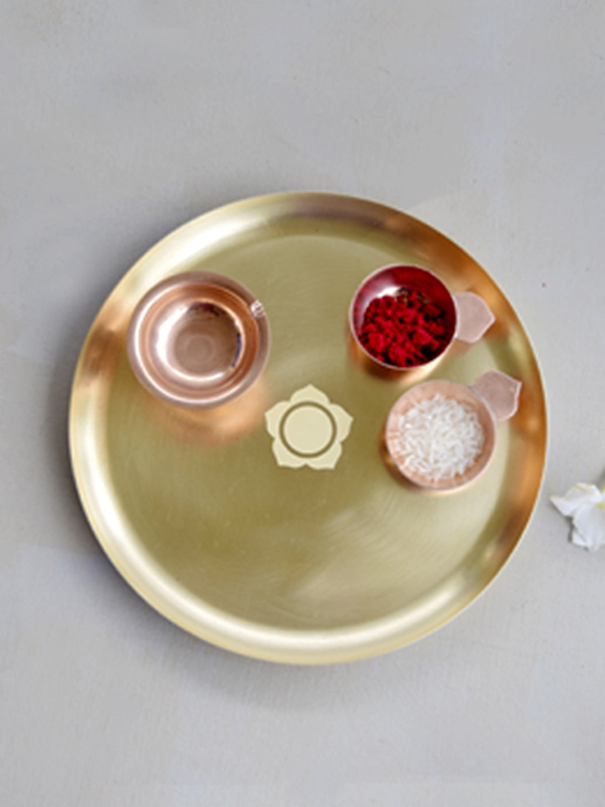 The soft and dull finish of Brass stands for grace, quietude and explores the divinity within oneself. The healing motif at the center of the platter has been designed as the focus point for inner quests and growth. This platter is the perfect accessory to gift to loved ones or enhance the décor of your own prayer nook. The Divinity platter in Brass also makes for an ideal housewarming gift.