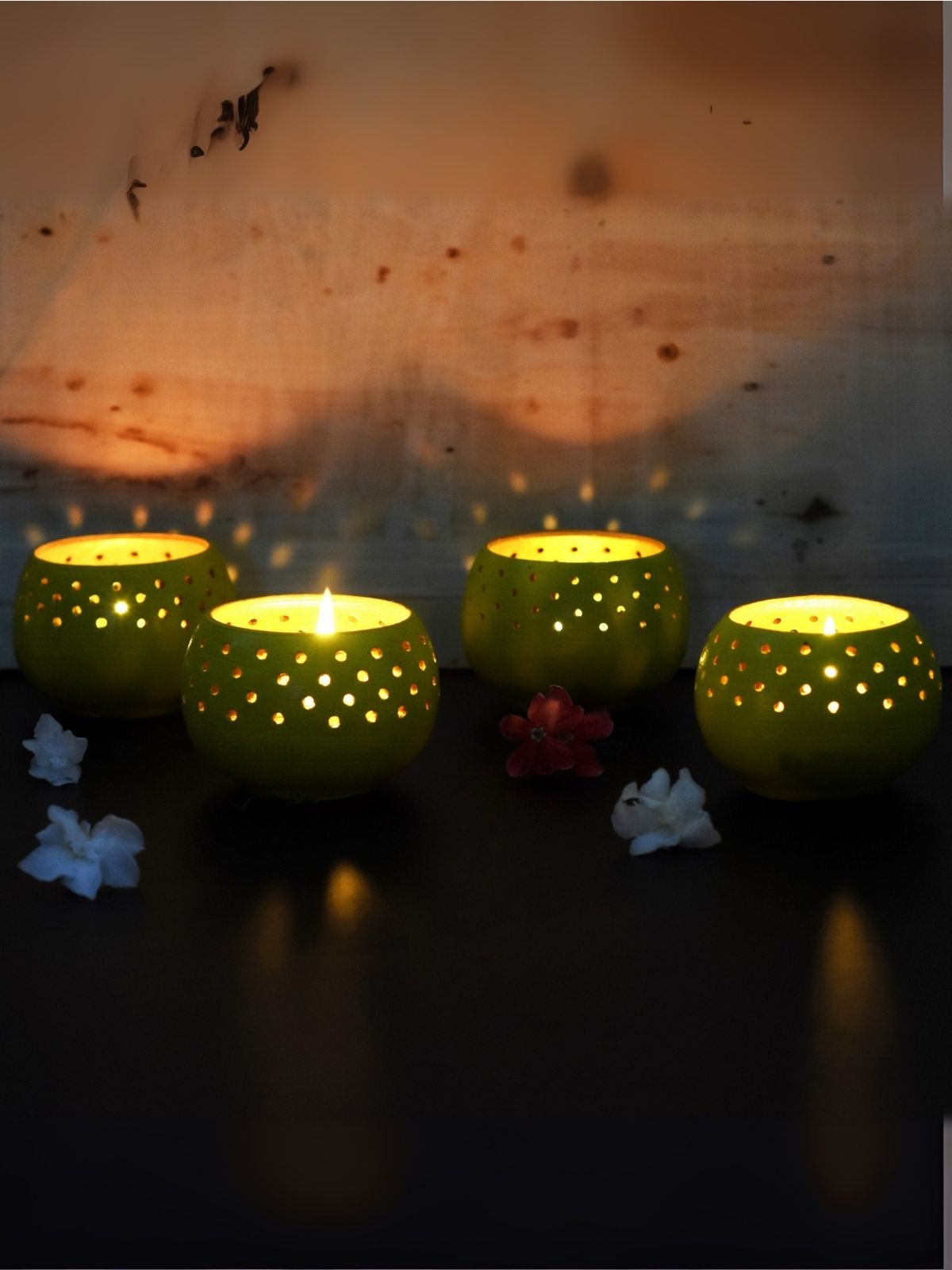 Fresh and playful, this set of four lemon‑green terracotta domes features golden interiors to amplify the glow. With complimentary tealights, each artisan‑made holder casts delicate patterns—perfect for bright, modern tablescapes and festive gatherings.