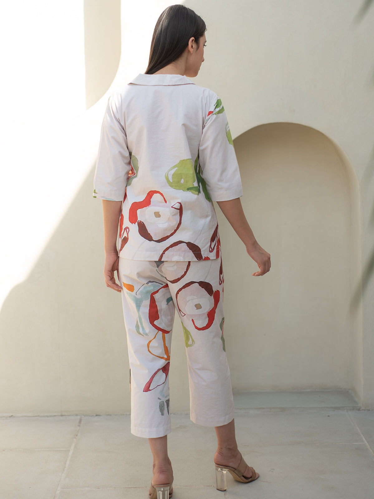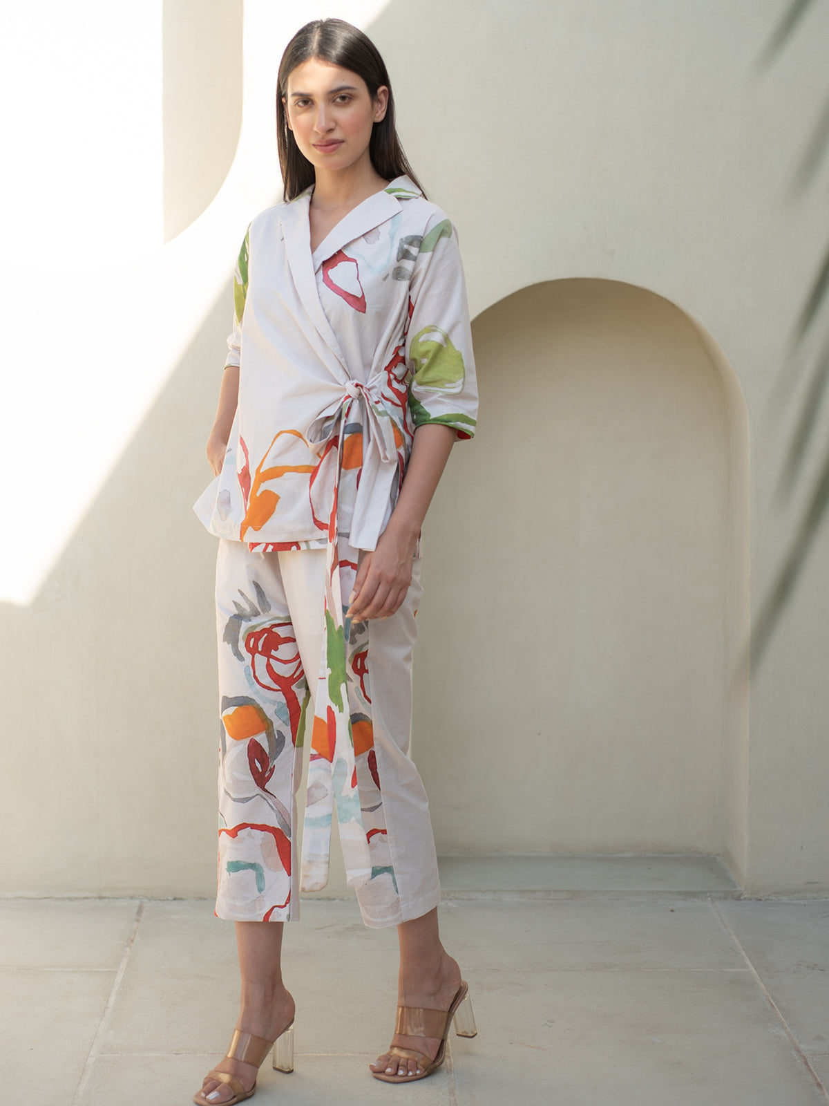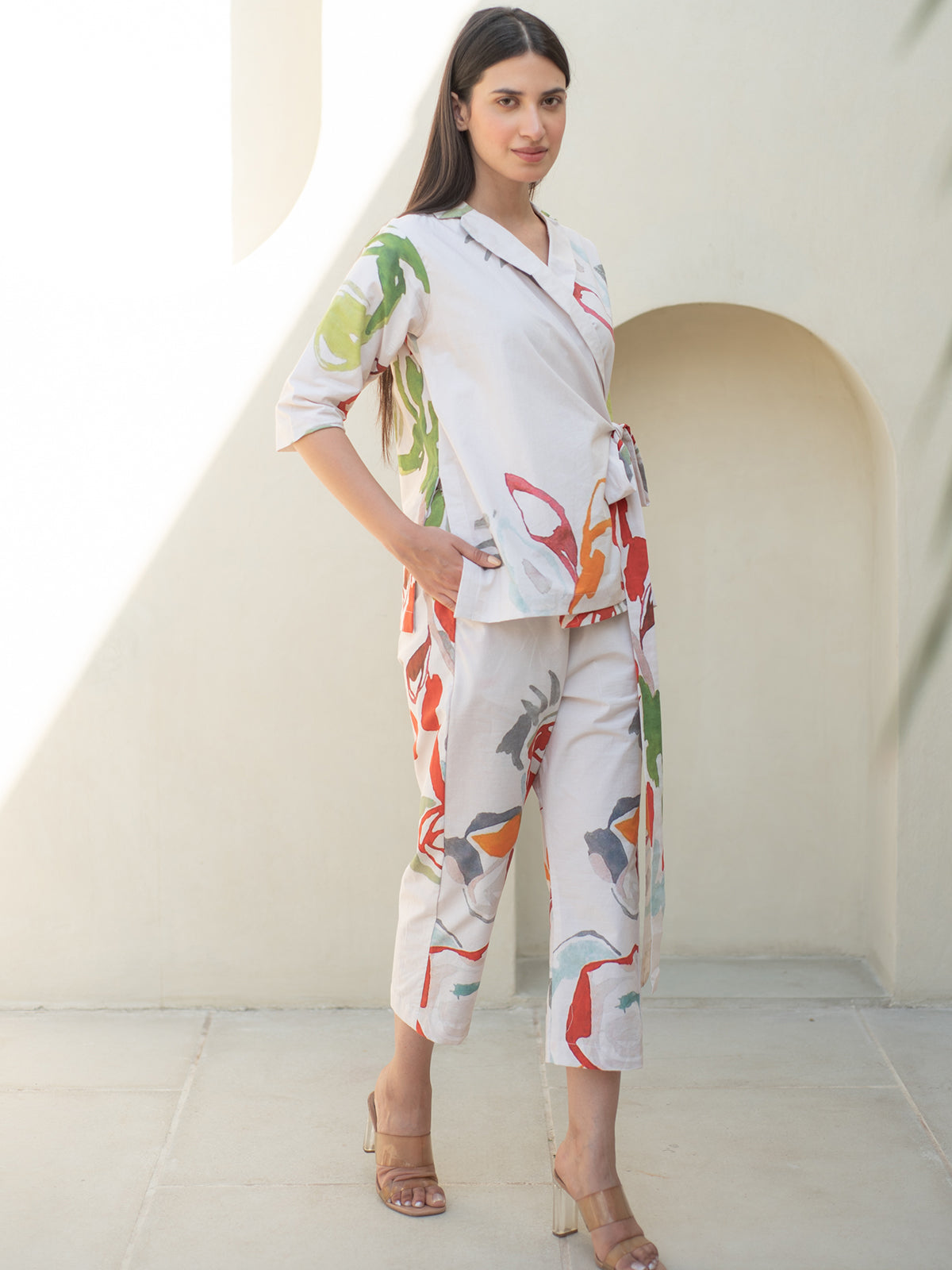 Delicate floral digital prints define this elegant two-piece cotton set. The jacket is styled with a collar overlap neckline and 3/4 sleeves, exuding charm and grace. The pants feature practical pockets and a fully elasticated waist, making it both functional and stylish.