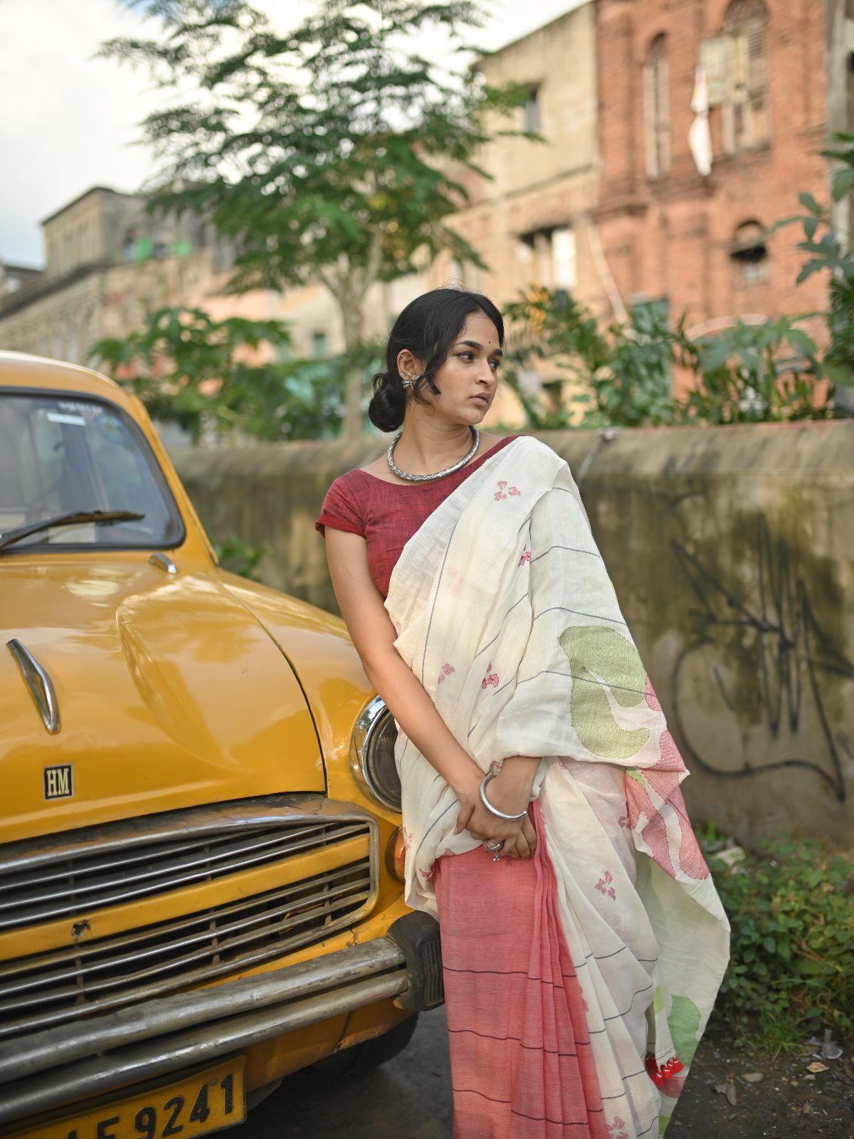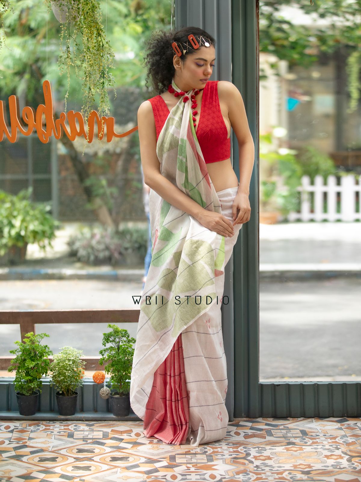 Crafted through traditional Jamdani weaving, this linen-cotton saree exemplifies artisanal textile mastery. The pristine white fabric features an elegant hibiscus motif adorning the pallu, while delicate red petal patterns grace the entire body. A sophisticated choice for those who appreciate handwoven heritage textiles and timeless botanical design.
