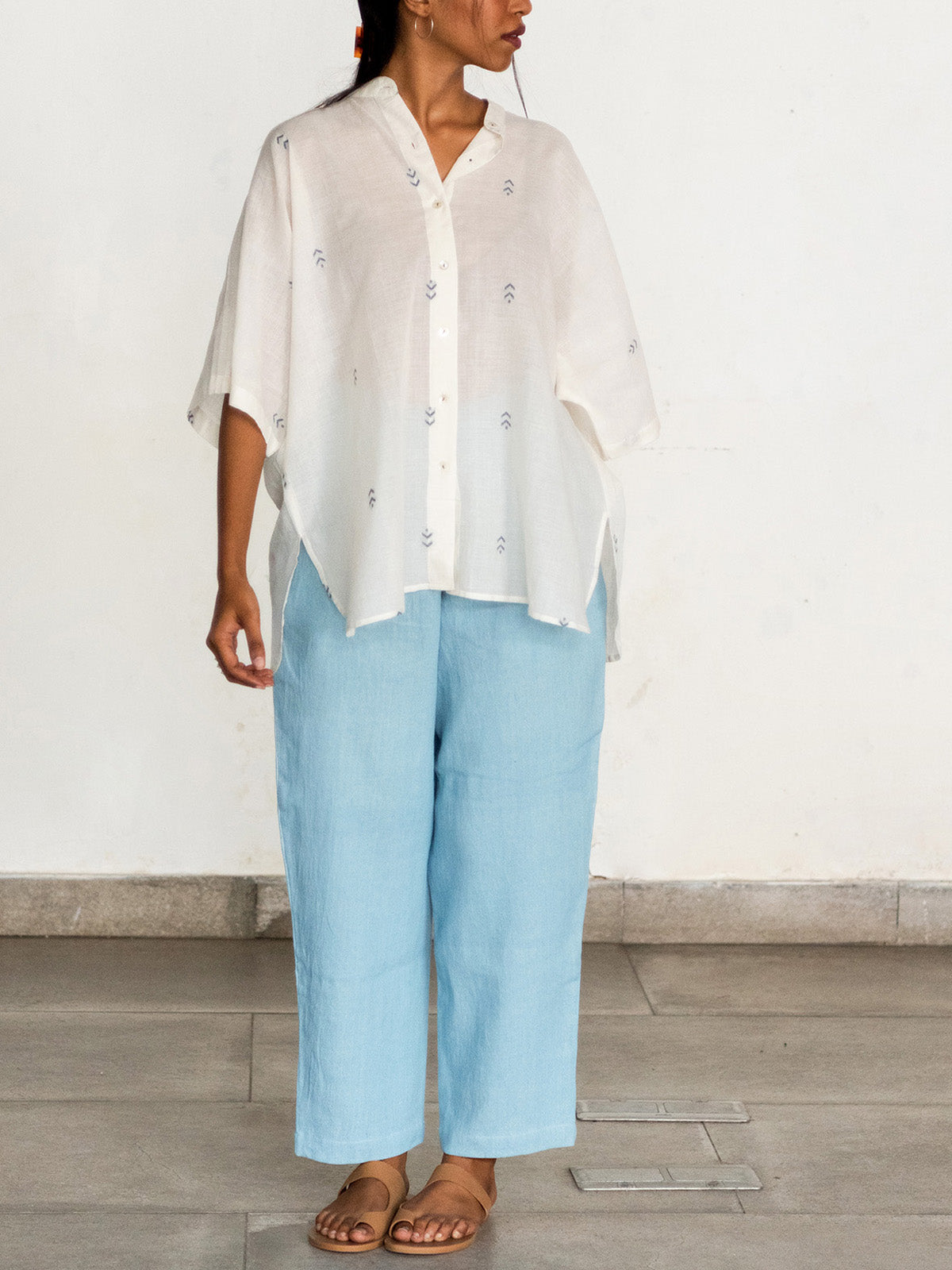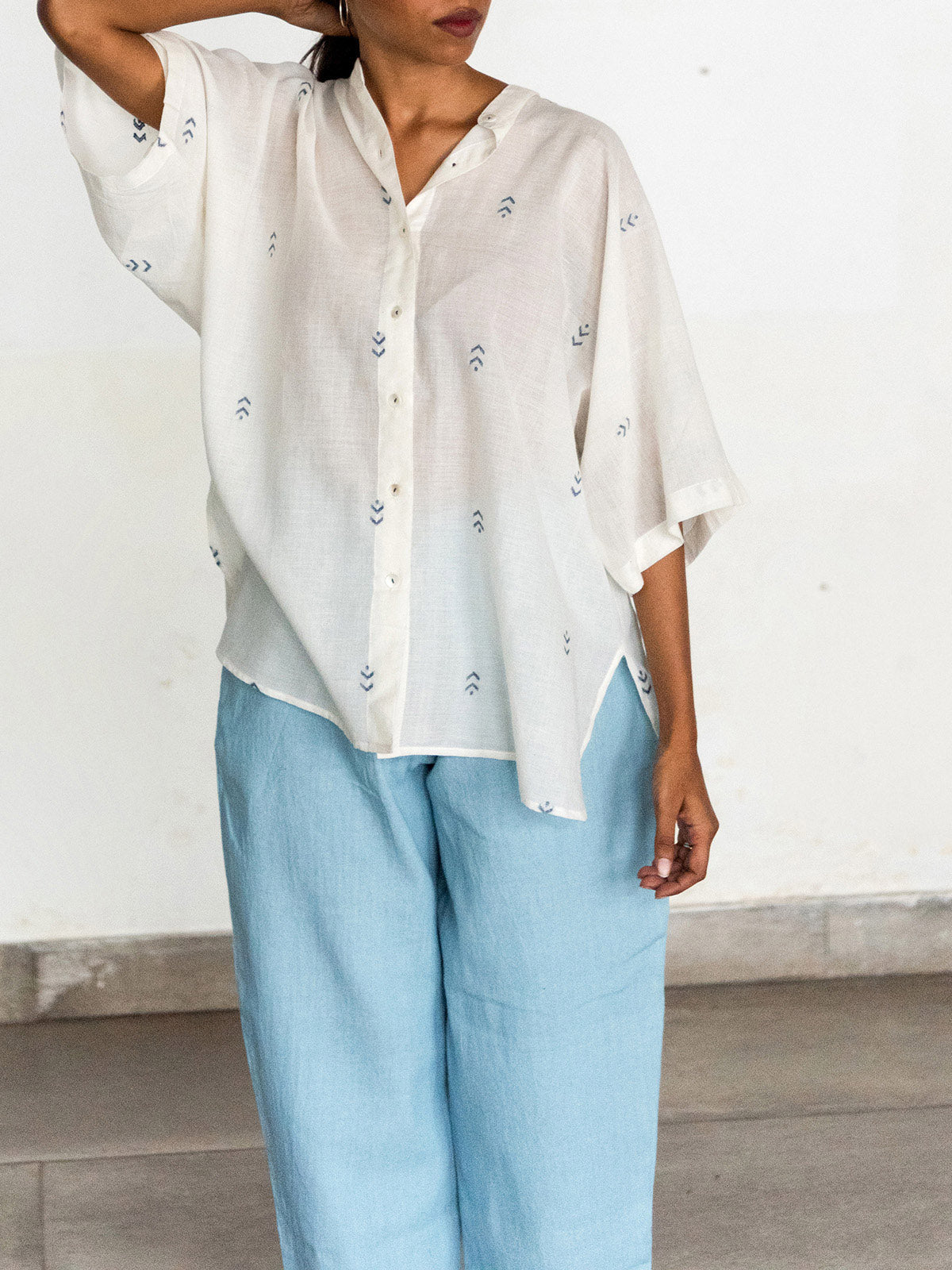 Introducing an exquisite oversized shirt with intricate Jamdani motifs in Indigo delicately arranged on kora khadi cotton. This shirt features a stylish kimono sleeve design, complemented by a Mandarin collar, curved hem, and box pleat details, adding an extra touch of elegance. Available in dual sizes, it ensures a perfect fit for different body types. Meticulously woven with expert craftsmanship, this shirt embodies the beauty of traditional weaving techniques. Embrace the allure of this woven masterpiece and elevate your fashion statement with its timeless charm.