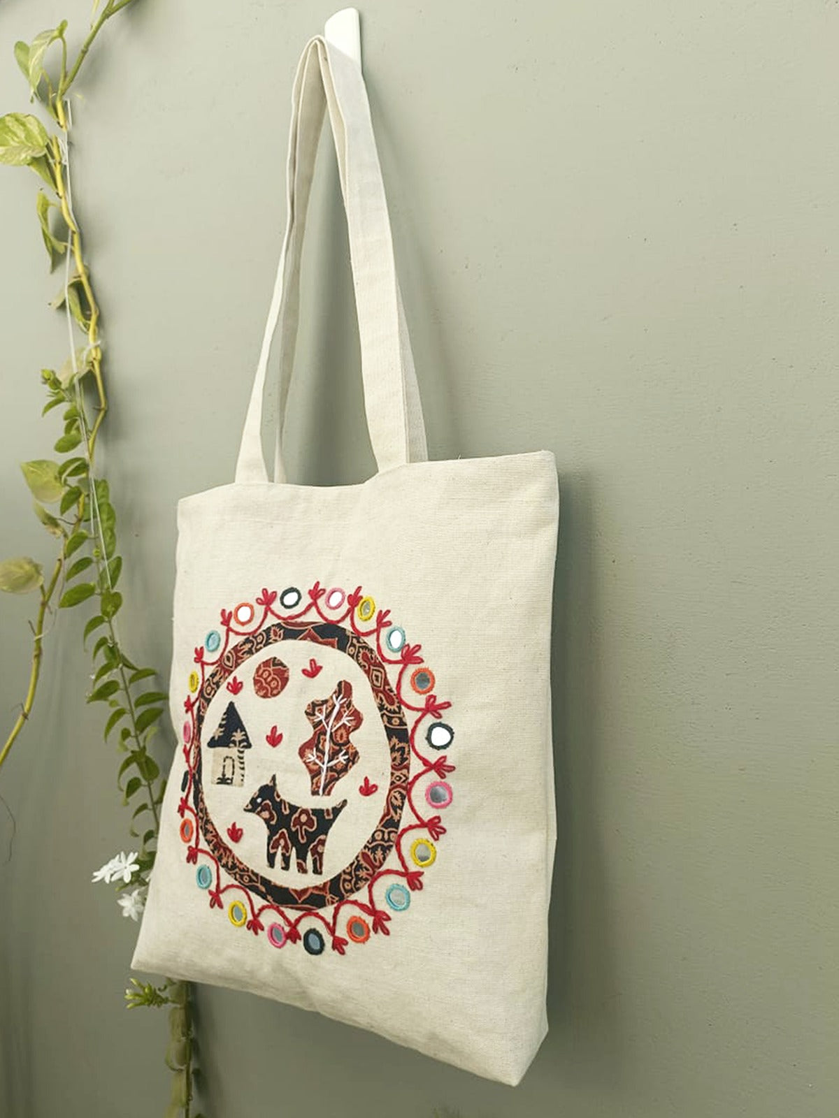 This off-white canvas tote bag features a bold circular hand-embroidered motif inspired by tribal and folk art, showcasing elements like a tree, house, and animal in earthy red, black, and mustard tones. A perfect blend of tradition and utility for everyday use.