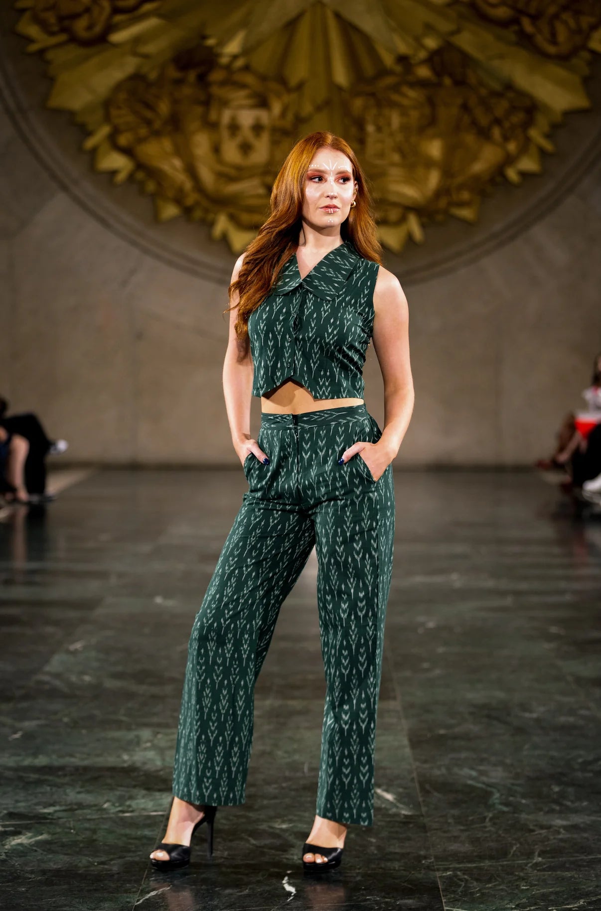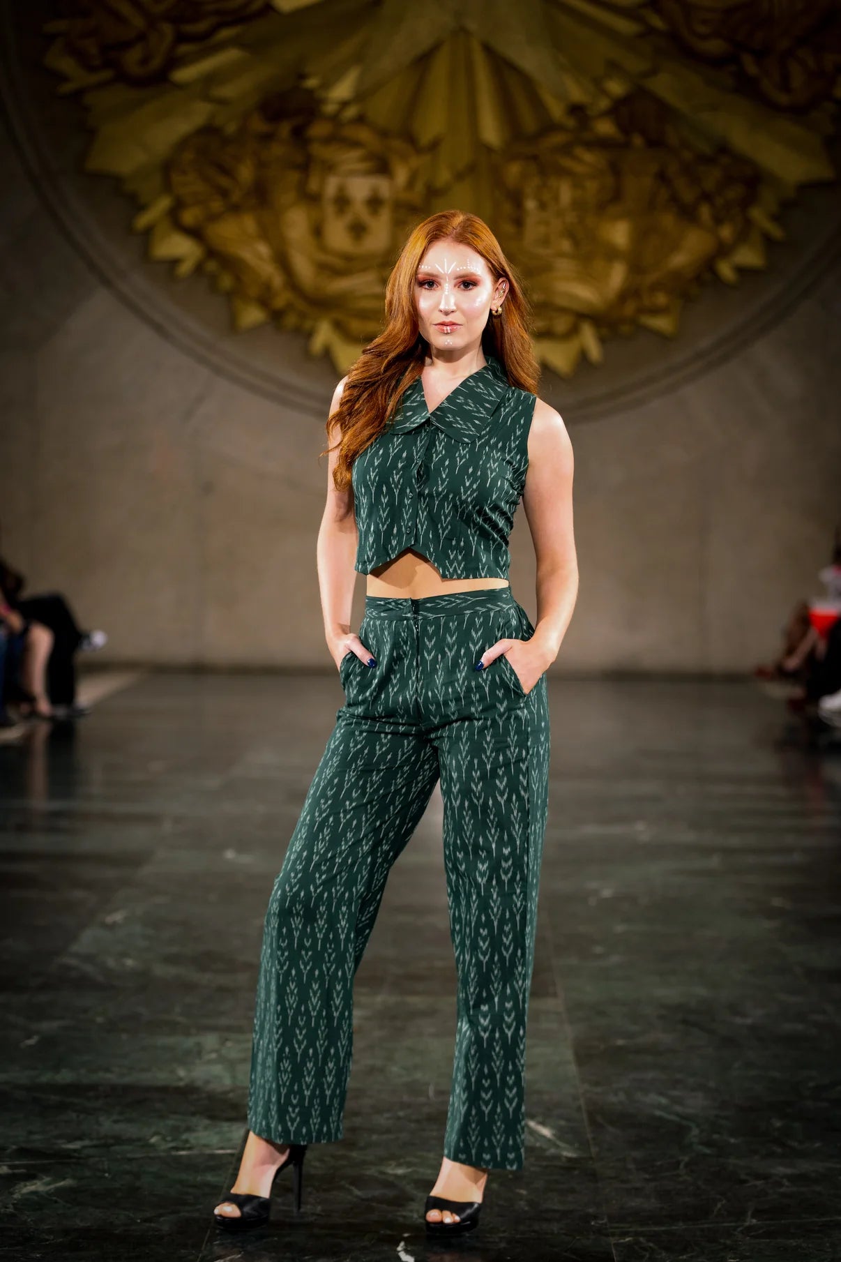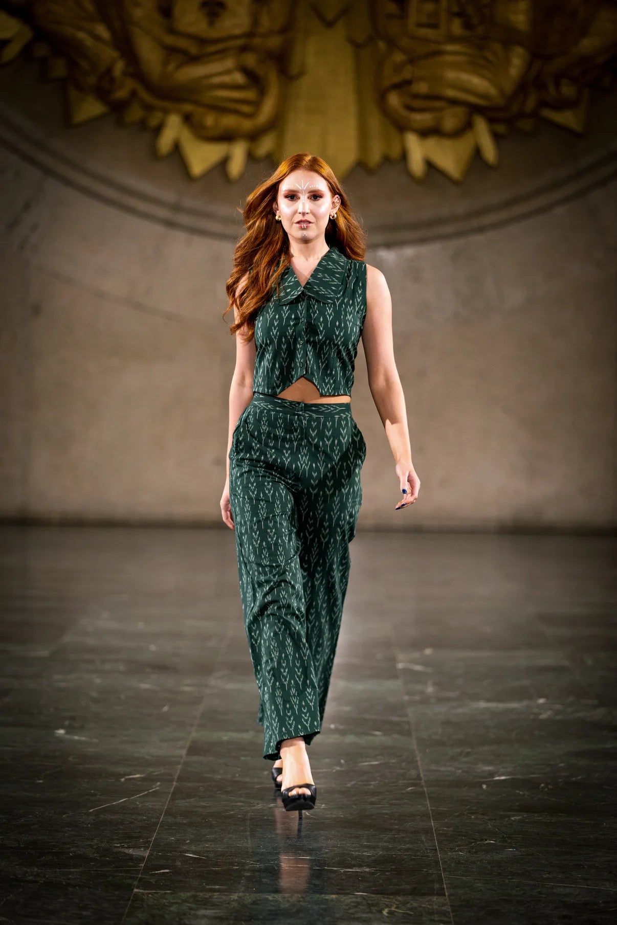 Sharp yet easygoing, this coord set features a sleeveless flat-collared top paired with sleek trousers, all in a rich emerald green hue. Crafted from handwoven cotton Ikat sourced directly from Pochampally’s renowned weaving families, this set seamlessly blends artisan craftsmanship with modern minimalism – an everyday essential elevated to statement status.