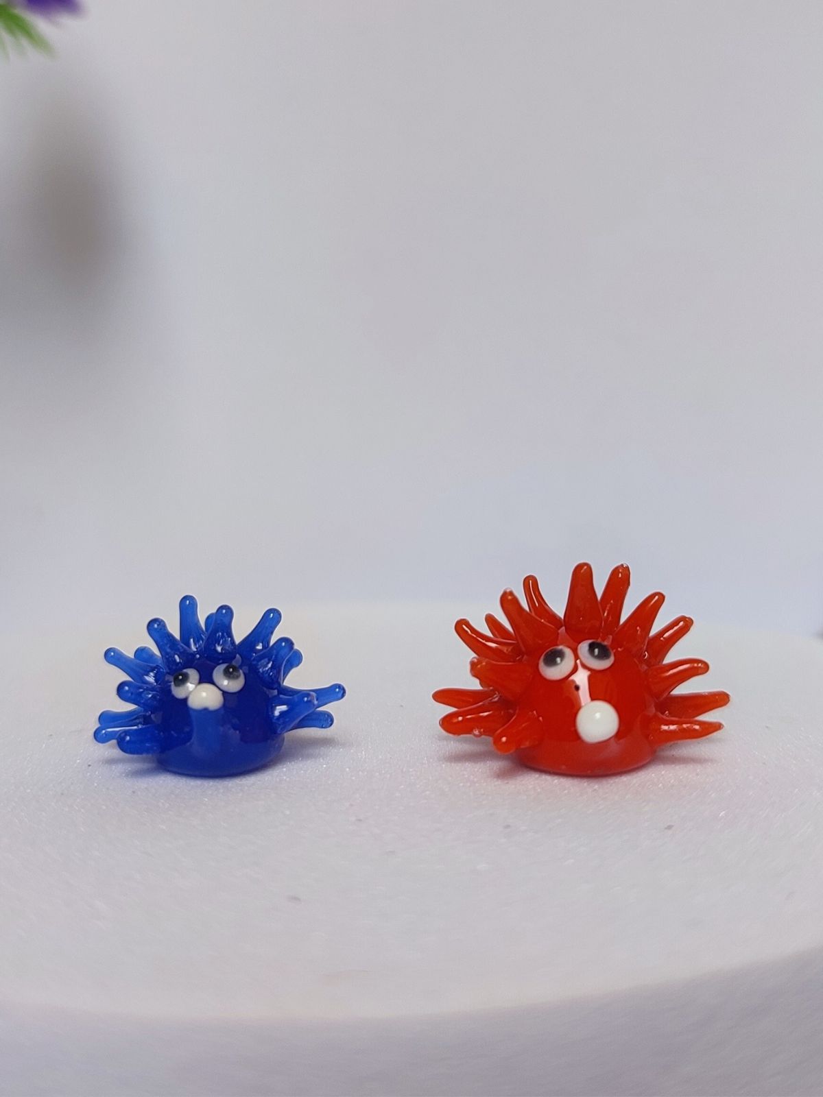 This colorful pair of miniature glass porcupines is handcrafted using flame-blown borosilicate glass. With their spiky bodies and big expressive eyes, they add a fun, artistic vibe to shelves, desks, or collector corners.