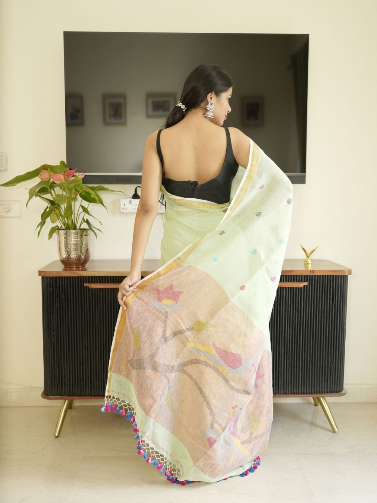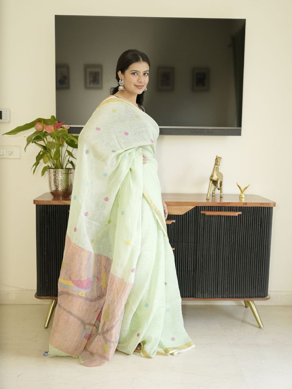 Crafted from premium linen, this striking green saree showcases the timeless artistry of Paithani hand embroidery. Each intricate stitch reflects traditional craftsmanship, creating a sophisticated piece that seamlessly transitions from formal occasions to refined everyday wear. The natural fabric drape combined with detailed embellishment delivers both comfort and understated luxury.