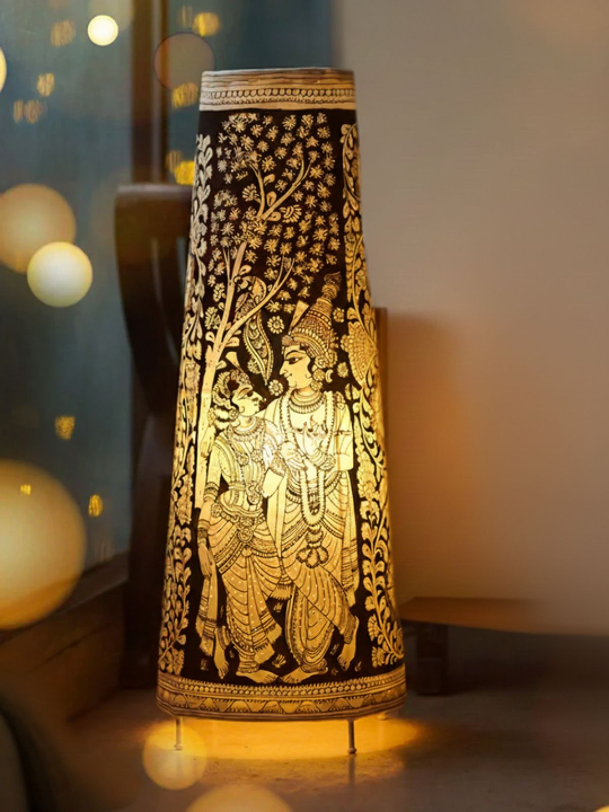 Rendered in elegant monochrome, this lamp portrays a serene scene of Lord Krishna and Radha under a flowering tree. The intricate white patterns on a black background highlight delicate foliage and expressive figures, reminiscent of classical Pattachitra or Kalamkari art. This piece adds a spiritual and sophisticated charm, making it perfect for serene corners or prayer spaces.