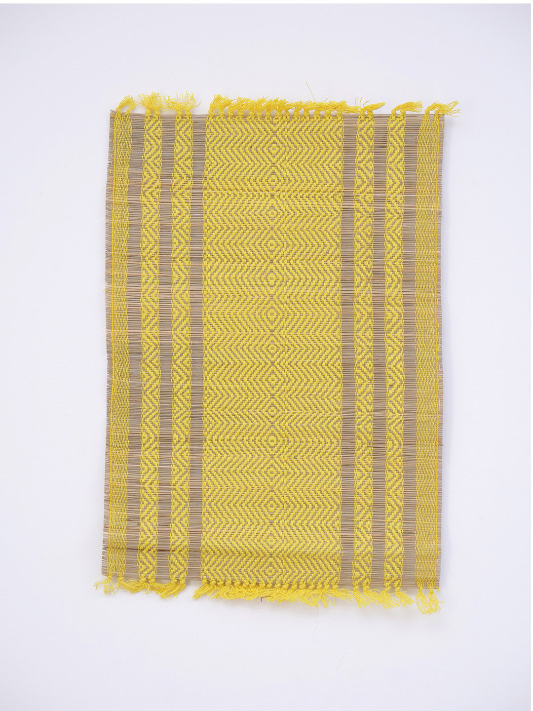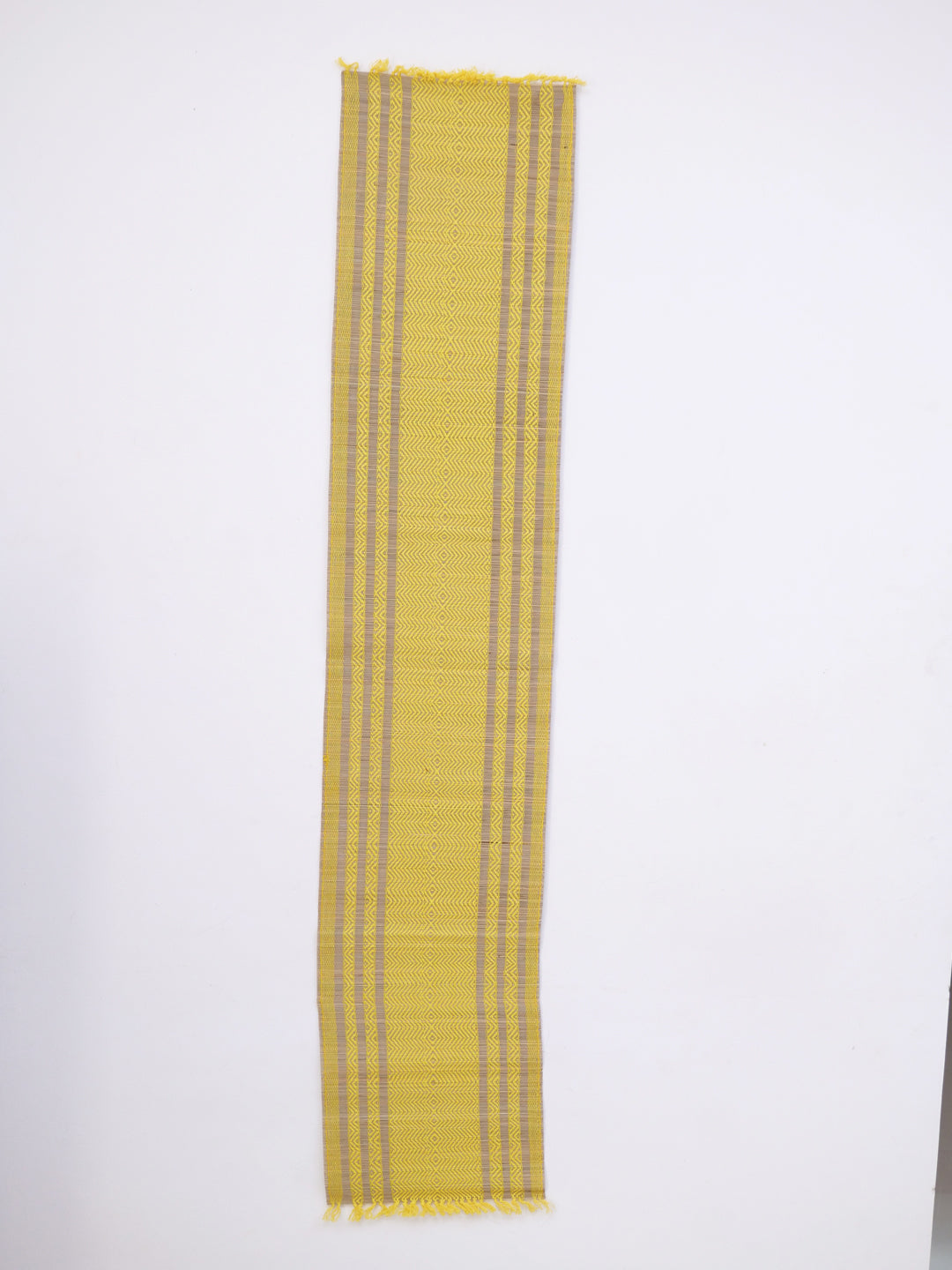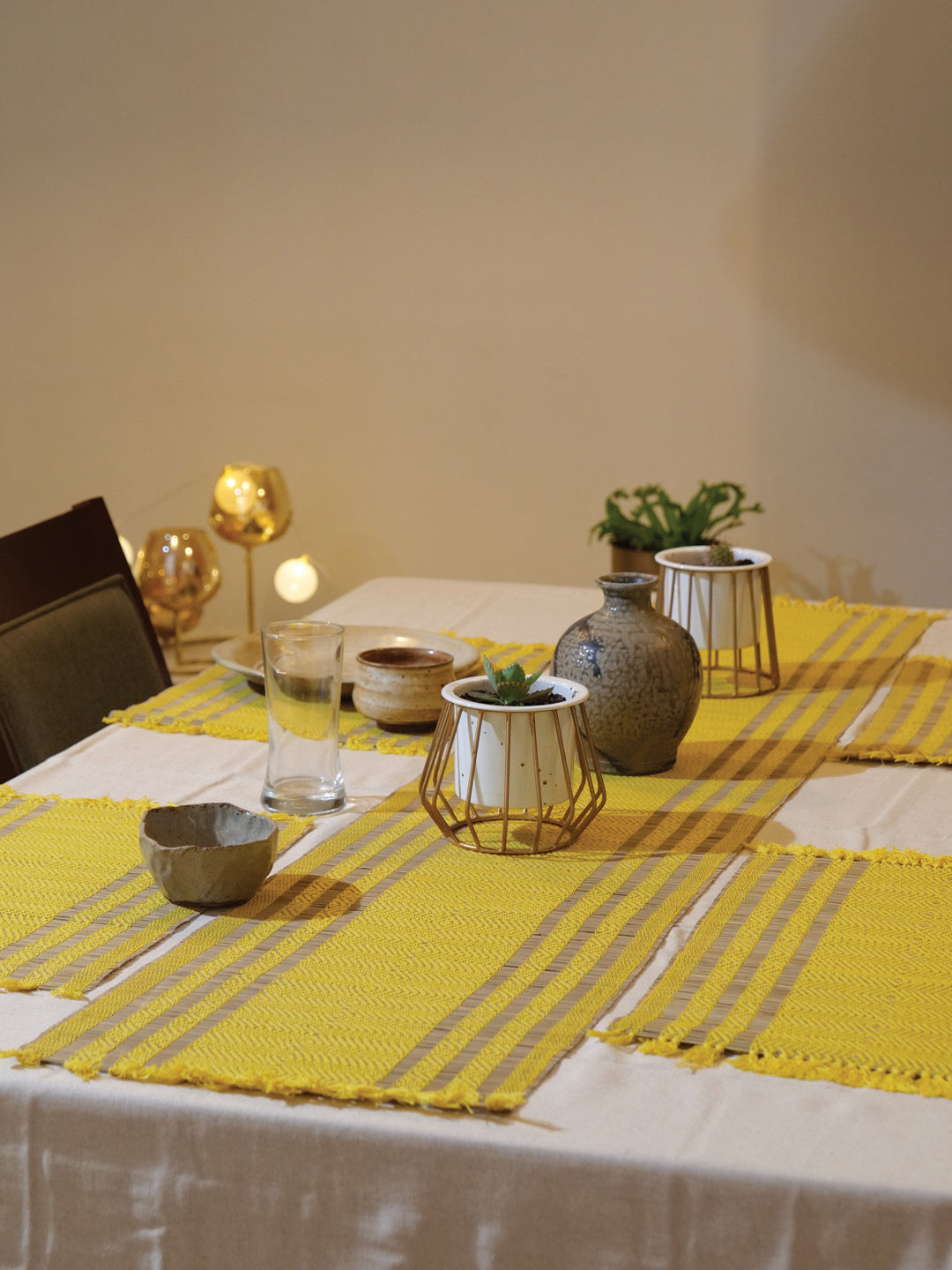 Enrich your dining table with tradition and elegance using the Diamon golden yellow handcrafted Madhukathi table mats, set of 6 table mast and a runner. Every item is woven meticulously using the ancient technique of madurkathi grass mats, spotlighting the heritage of artisanal craftsmanship.