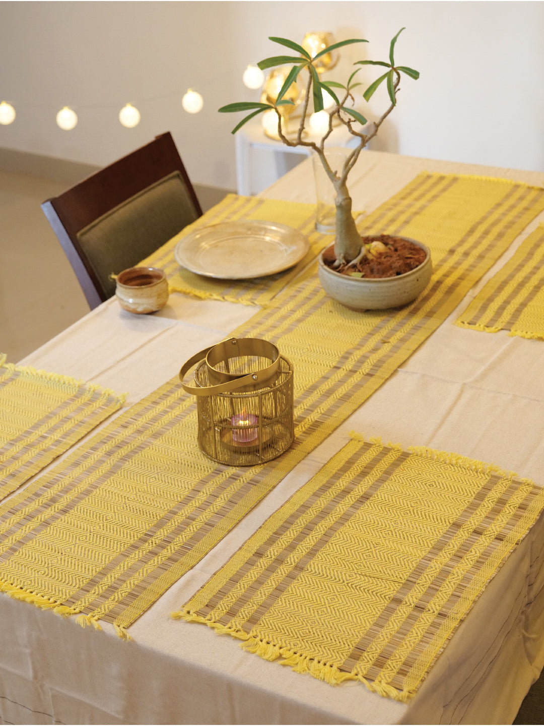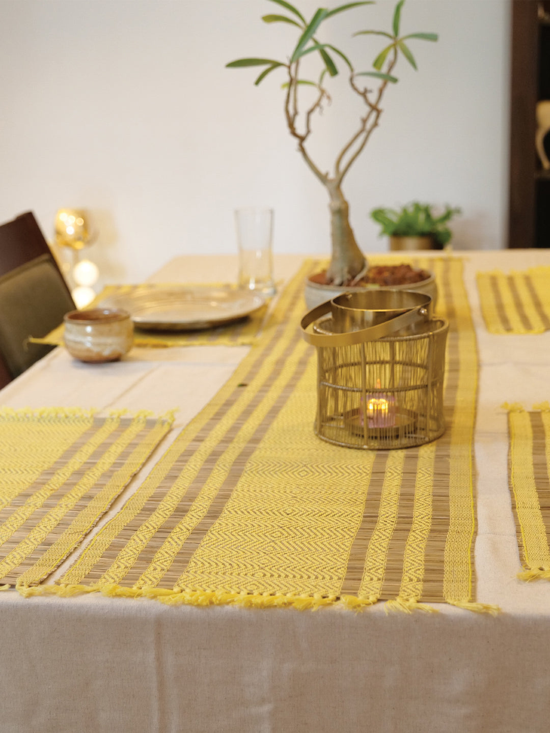 Transform your dining table into an exquisite display of tradition and elegance with the handcrafted Madhukathi table mats, set of 6 table mats and a runner. Each piece is meticulously woven using the age-old technique of madurkathi grass mats, showcasing the rich heritage of artisanal craftsmanship.