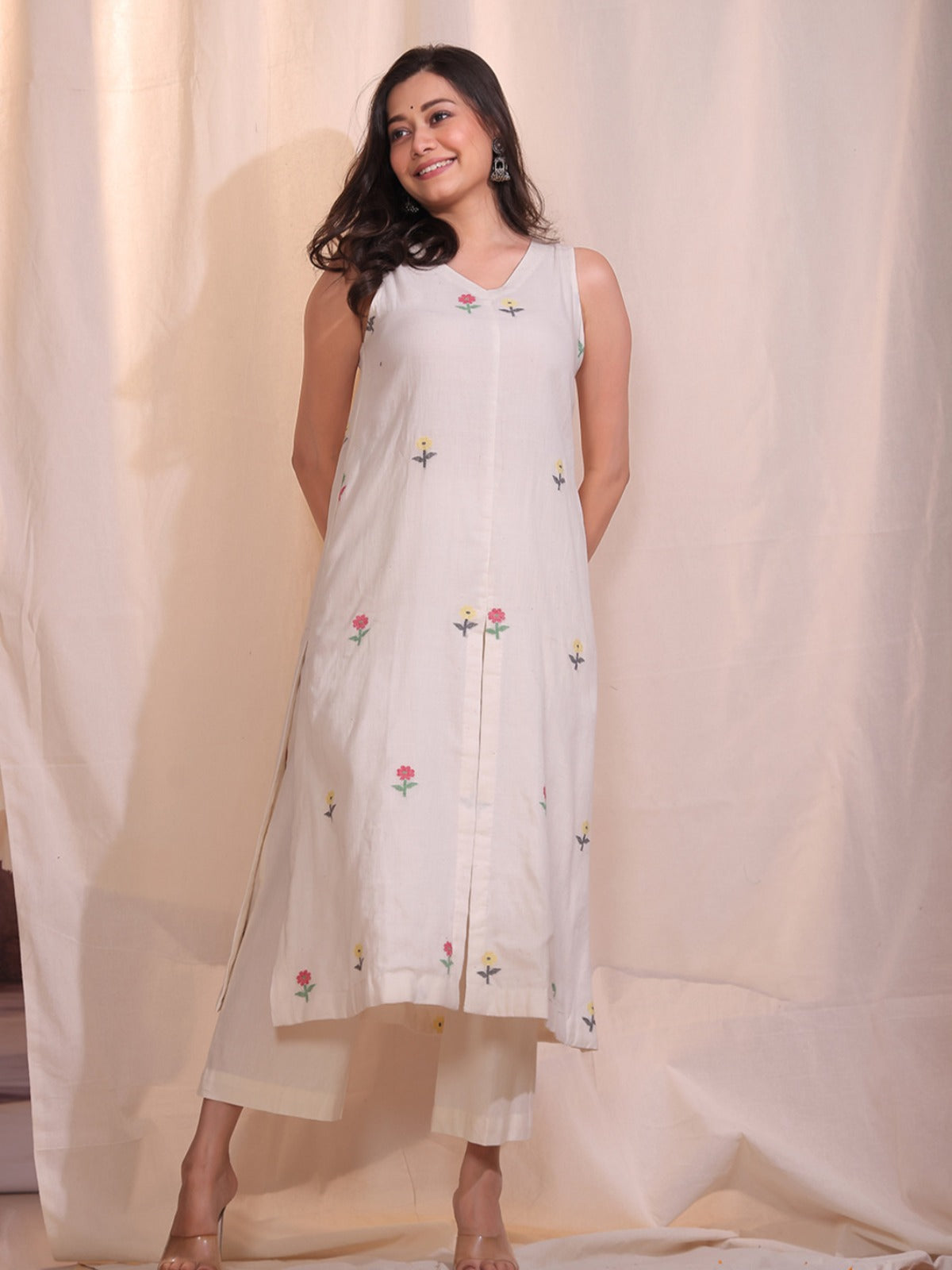 Cream Pure Cotton Jamdani Kurta Set with handwoven floral motifs brings effortless elegance and charm. Made from soft, breathable cotton, it ensures comfort while reflecting timeless craft. A versatile ensemble, ideal for casual outings or semi-formal occasions, it beautifully blends traditional artistry with modern sophistication.