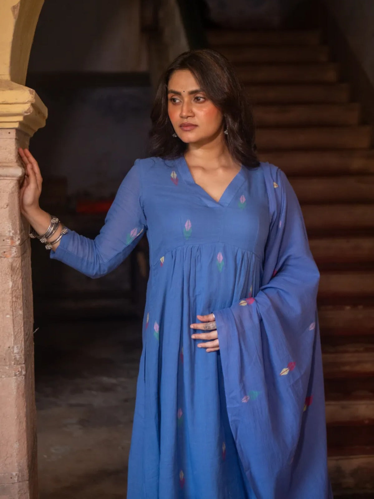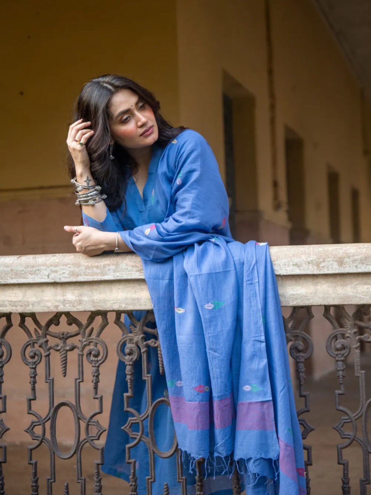 Handloom Sky Blue Pure Cotton Jamdani Kurta Set With Dupatta