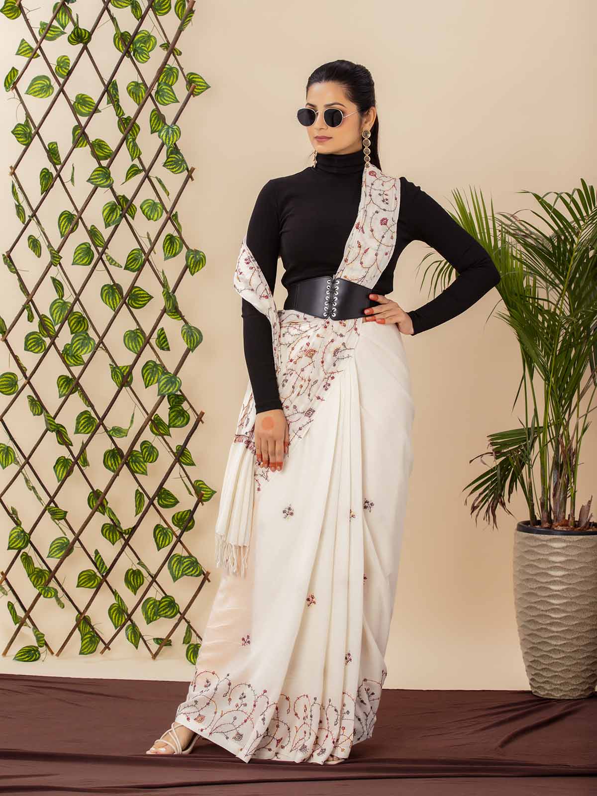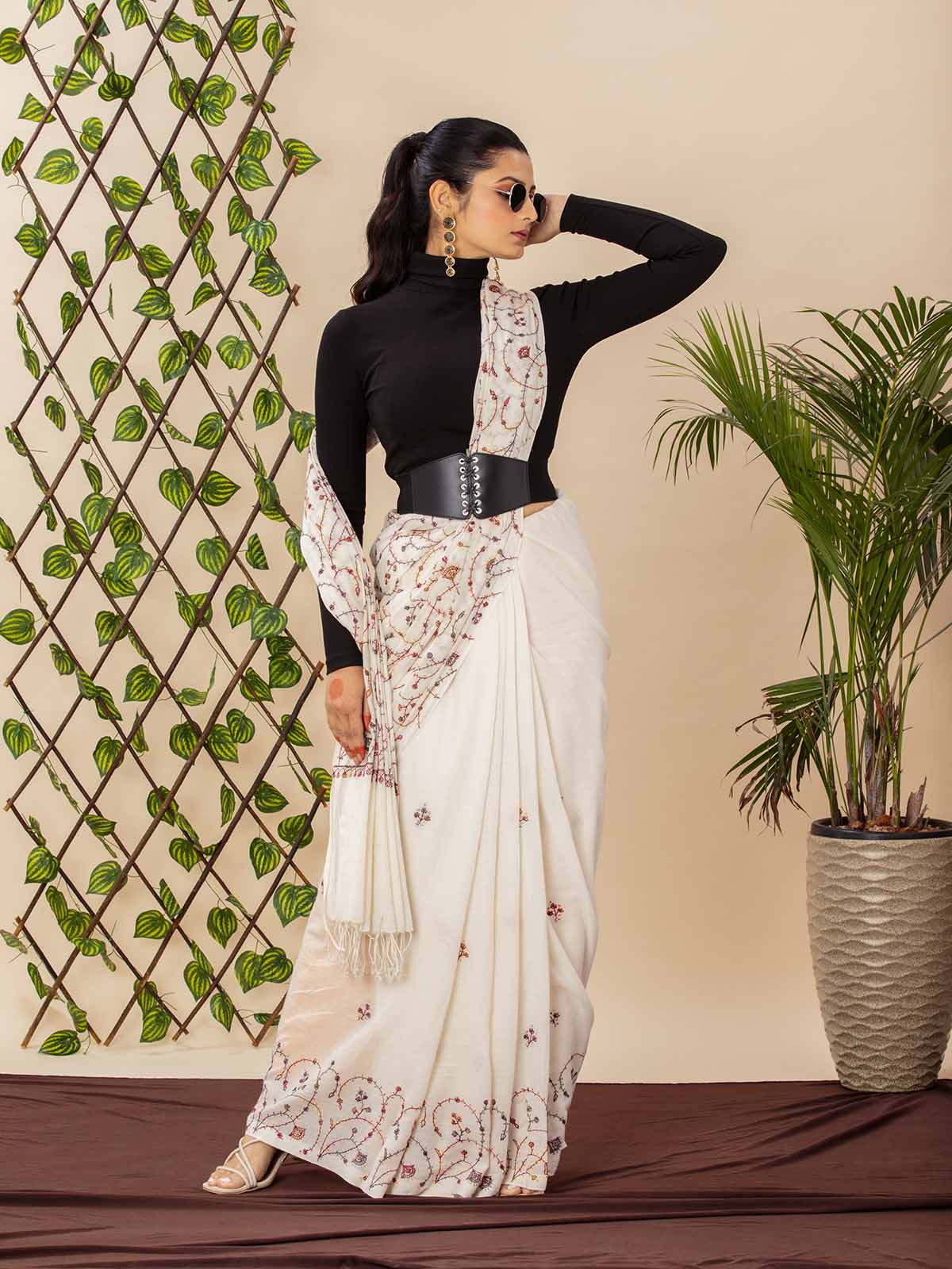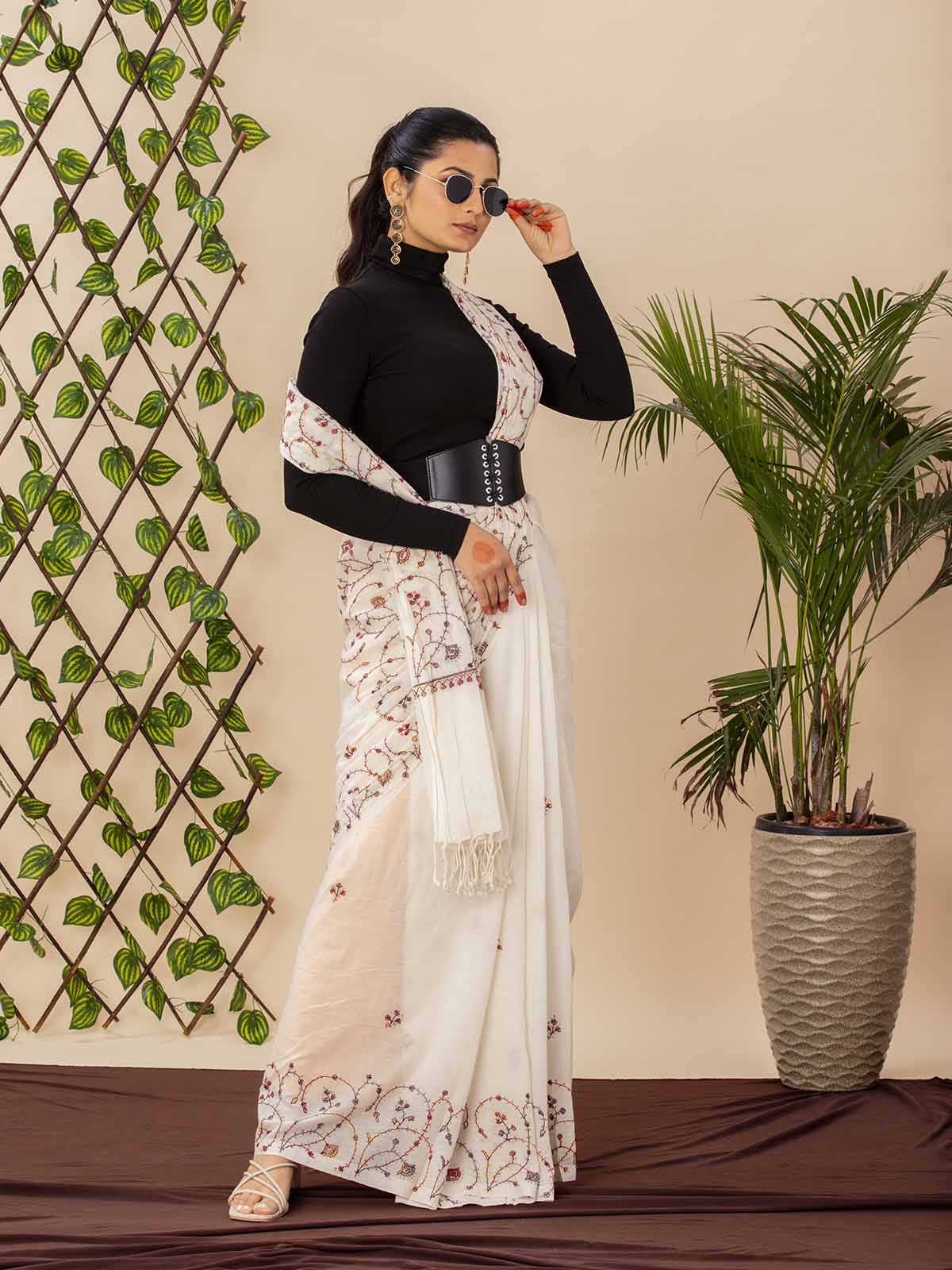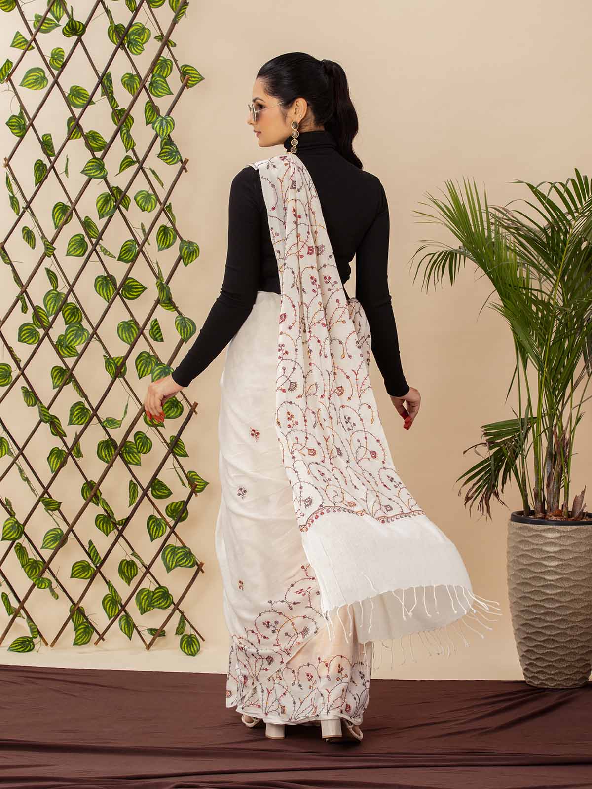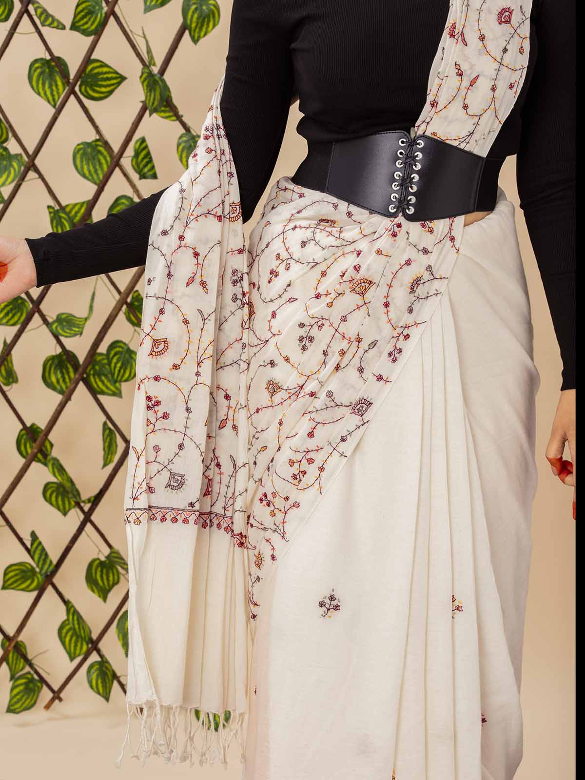 Celebrate the charm of handcrafted elegance with this ivory khadi cotton saree, intricately adorned with traditional sozni embroidery in rich shades of rust, maroon, and charcoal. The delicate vine motifs and fine detailing speak of artisanal finesse, adding subtle sophistication to this breathable, all-season drape.The saree features minimal scattered embroidery on the body and detailed work along the pallu, making it perfect for both understated festivities and conscious everyday elegance. It’s paired with a matching blouse piece, allowing versatility in styling.Naturally graceful, heritage-rich, and modern in appeal.
