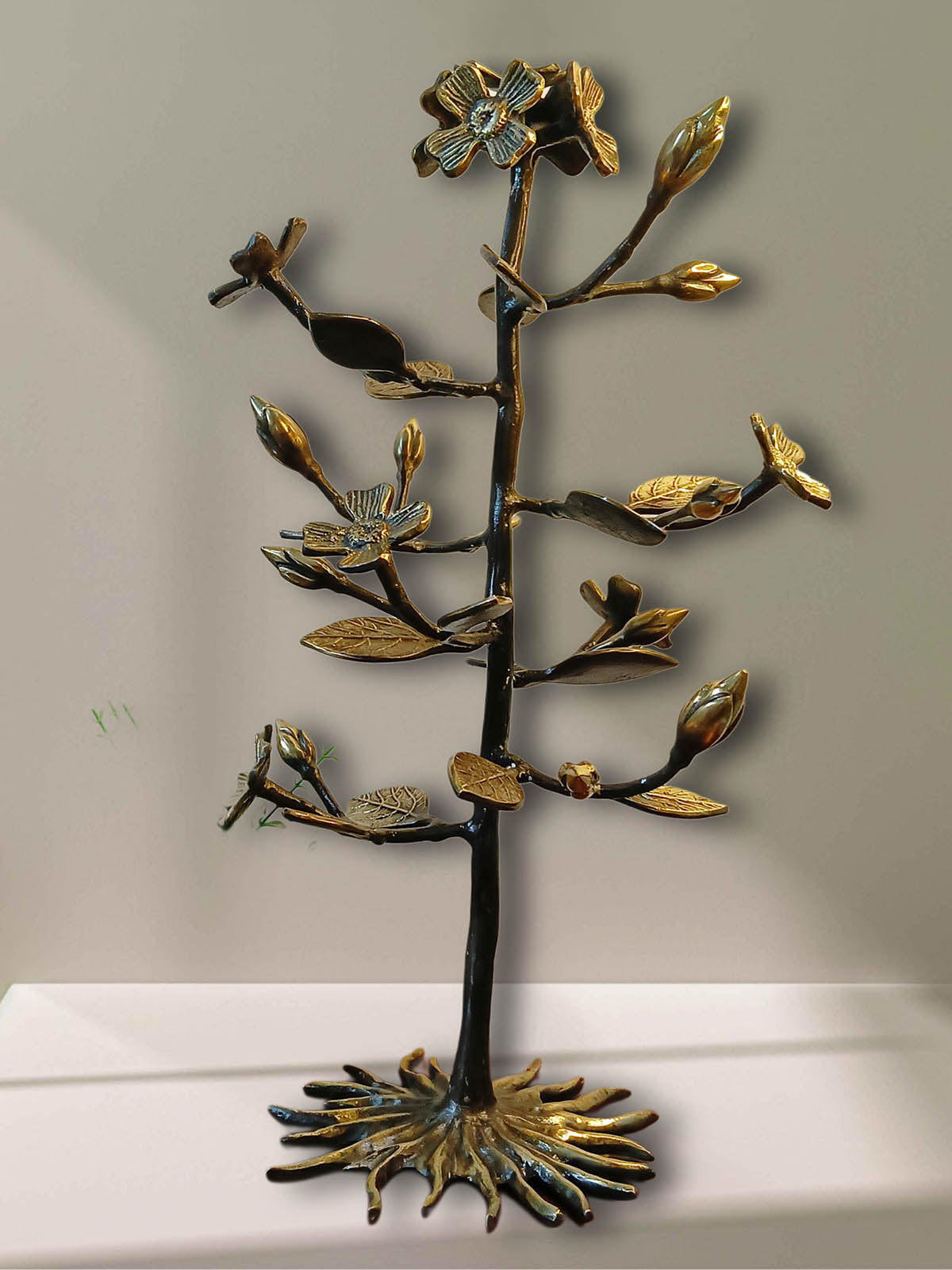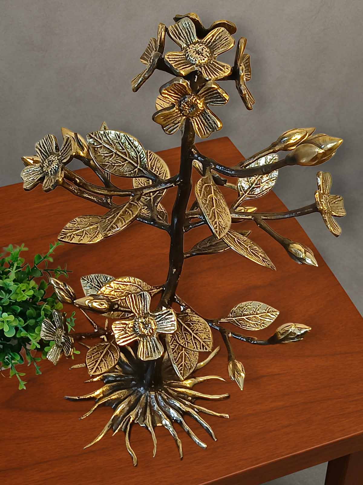 This is a stunning brass décor piece inspired by the traditional trees of India. Crafted with intricate detailing, it features clusters of buds and leaves blossoms in antique gold and black finish. A symbol of growth and grace, this sculpture brings a harmonious blend of elegance and traditional artistry to your