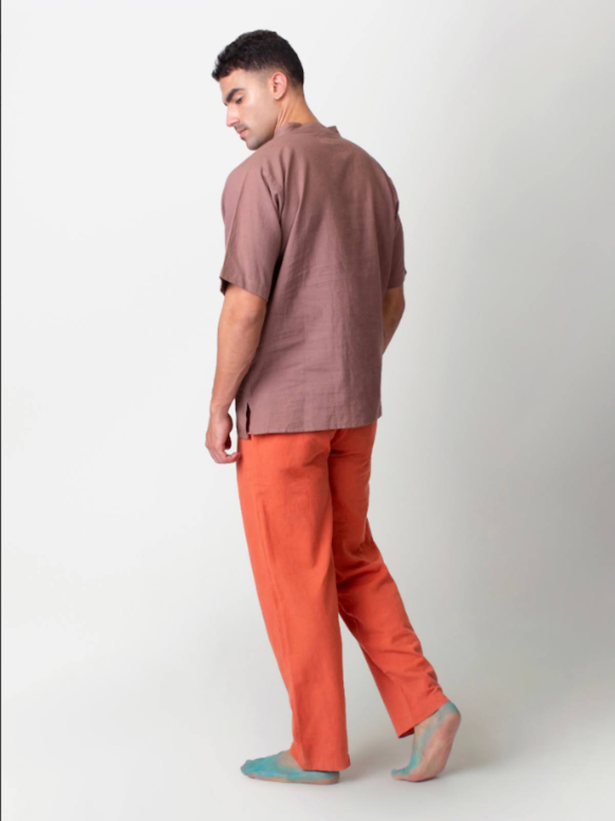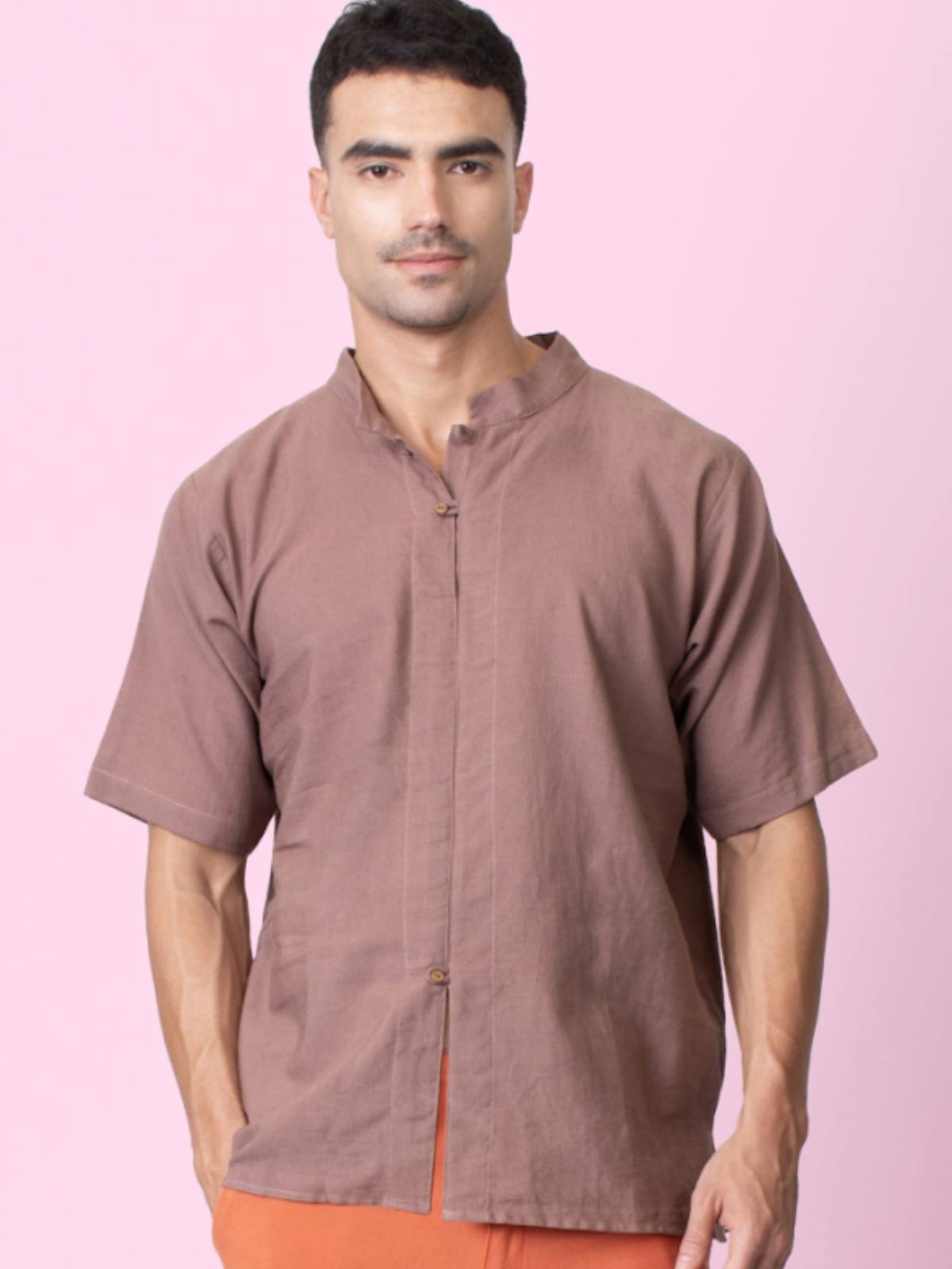A relaxed regular fit made for everyday ease. Features handcrafted wooden loop buttons, half sleeves for comfort, and front and side slits for free movement. Finished with a subtle embroidered patch on the sleeve for a unique touch.
