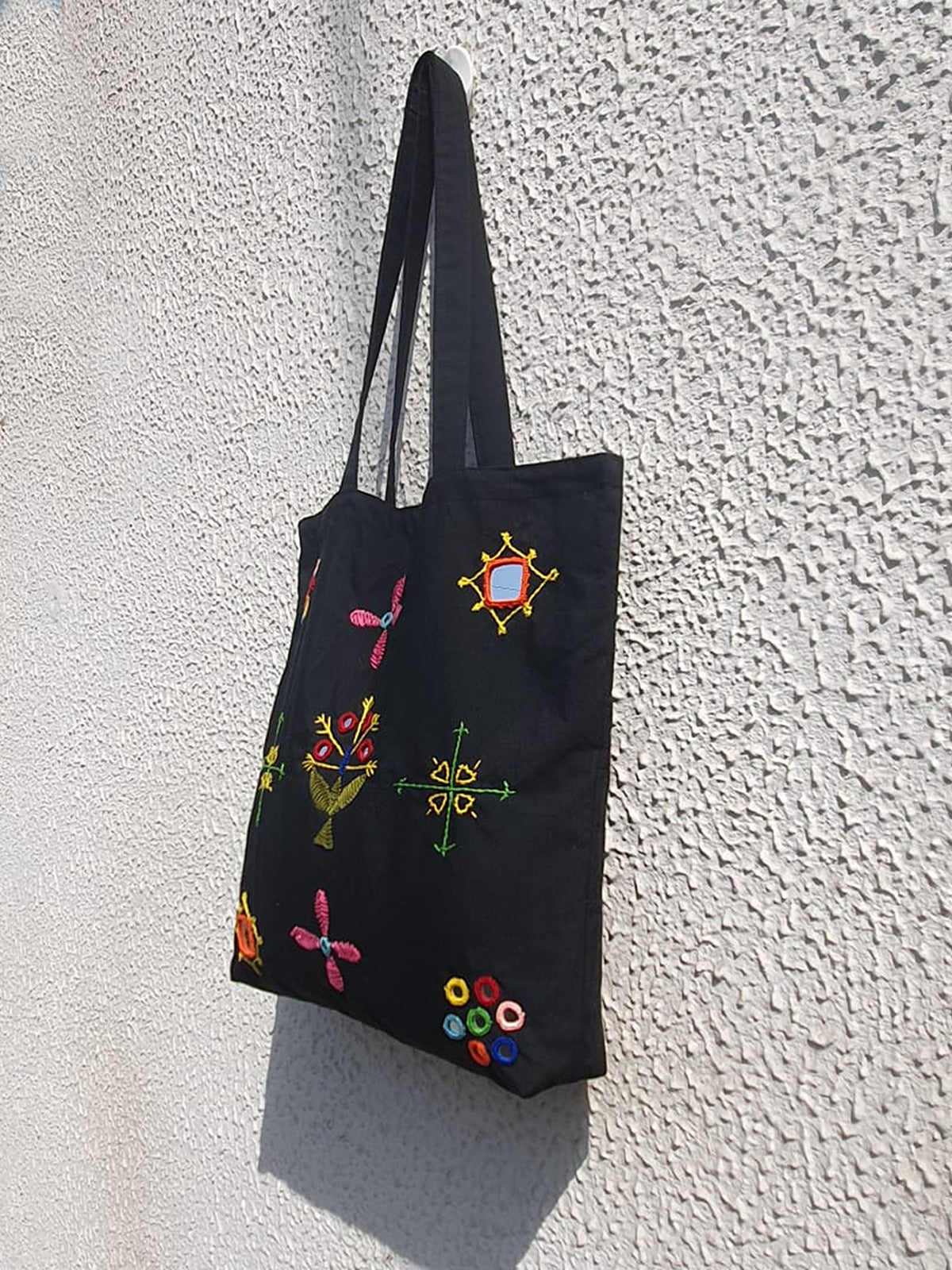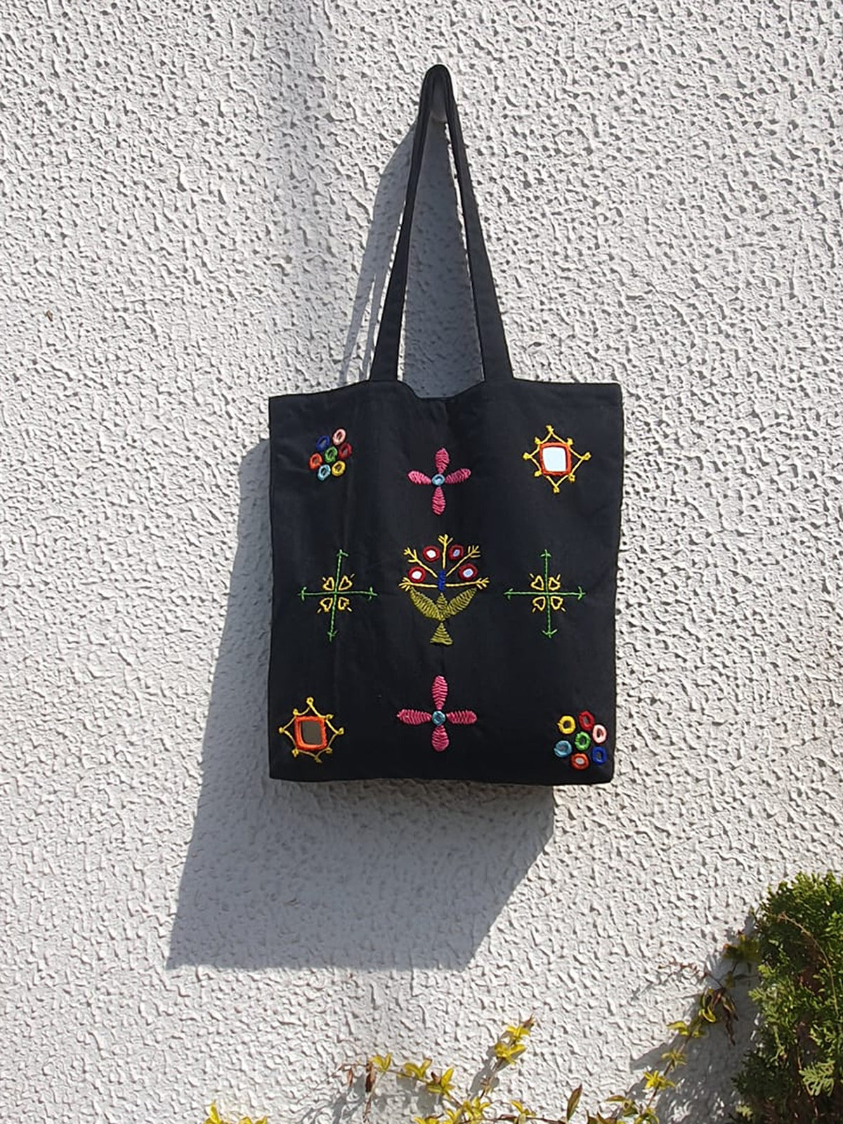 This black cotton tote bag features bold and colorful hand-embroidered geometric and floral motifs inspired by traditional kutch embroidery. With vibrant threadwork in pink, yellow, green, red, and black, it adds a pop of personality to everyday carry.