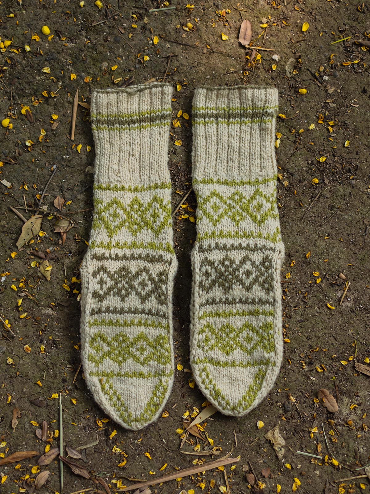 Extra thick, warm woollen socks with beautiful, unique motifs. These socks are knit by the shepherding community of Lahaul with their own wool which they handspin on the wooden takhli. Handspun and handknit by our women artisans, each pair is individual in design and colour. Orders will be based on colourway and size, and patterns may vary from the one shown in picture.