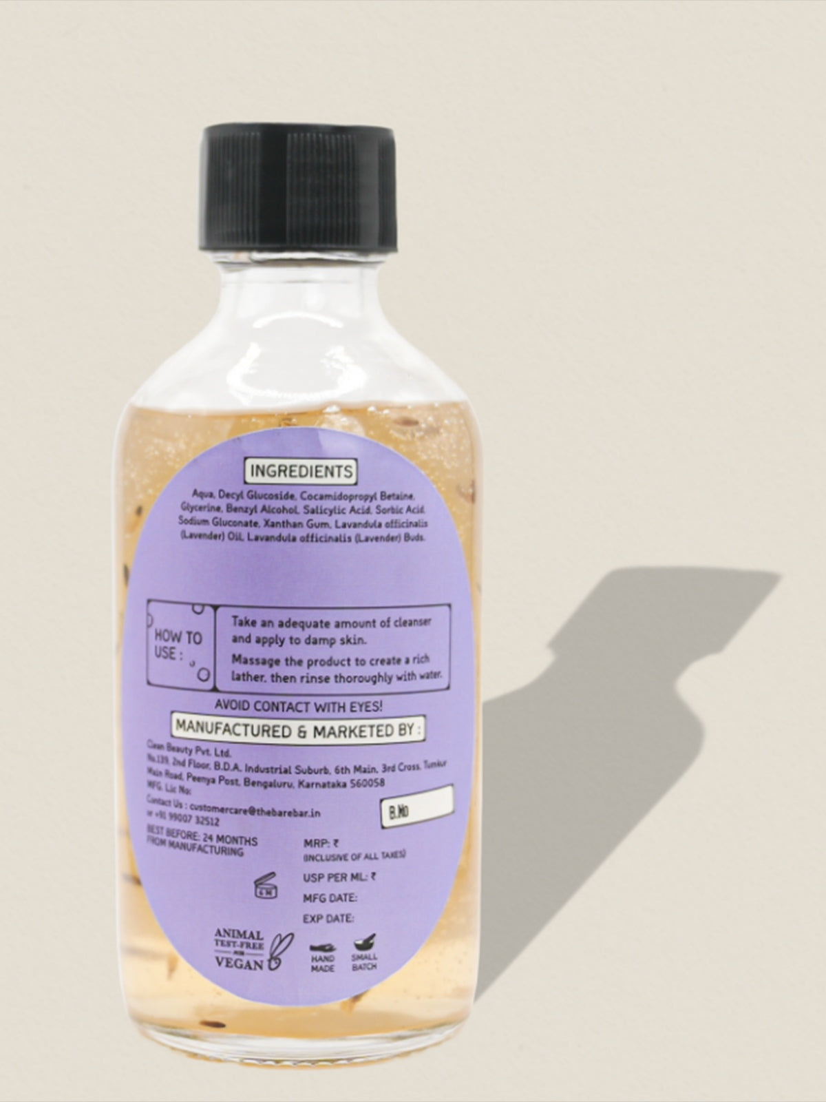 - Key Ingredients : Aqua, Decyl Glucoside, Cocamidopropyl Betaine, Glycerine, Benzyl Alcohol, Salicylic Acid, Sorbic Acid, Sodium Gluconate, Xanthan Gum, Lavandula Officinalis (Lavender) oil, Lavendulan angustifolia (Lavender) buds