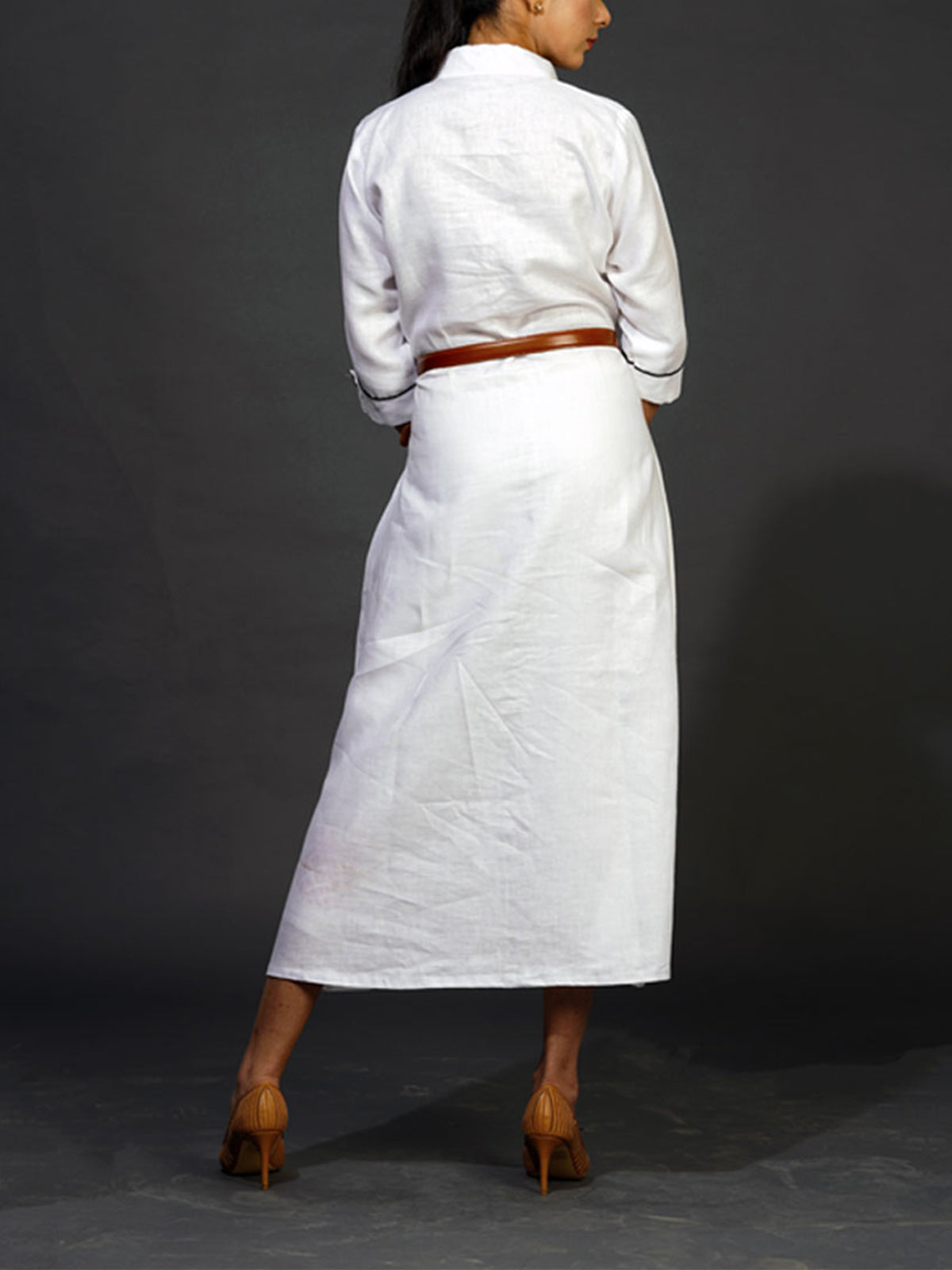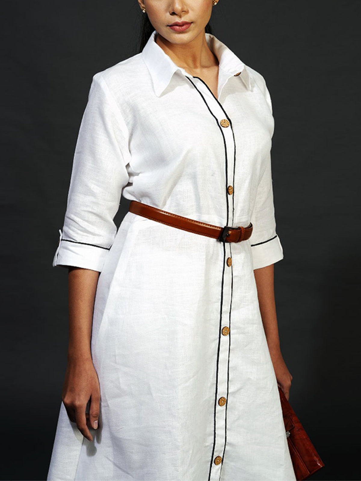 Introducing the Linen Shirt Dress in White, a classic piece featuring black piping and anti-gap wooden buttons. Crafted from 100% handwoven luxury linen fabric, this dress offers a breathable, comfortable fit perfect for all-day wear. With its mid-length sleeves and timeless design, it's ideal for effortless and stylish dressing.
