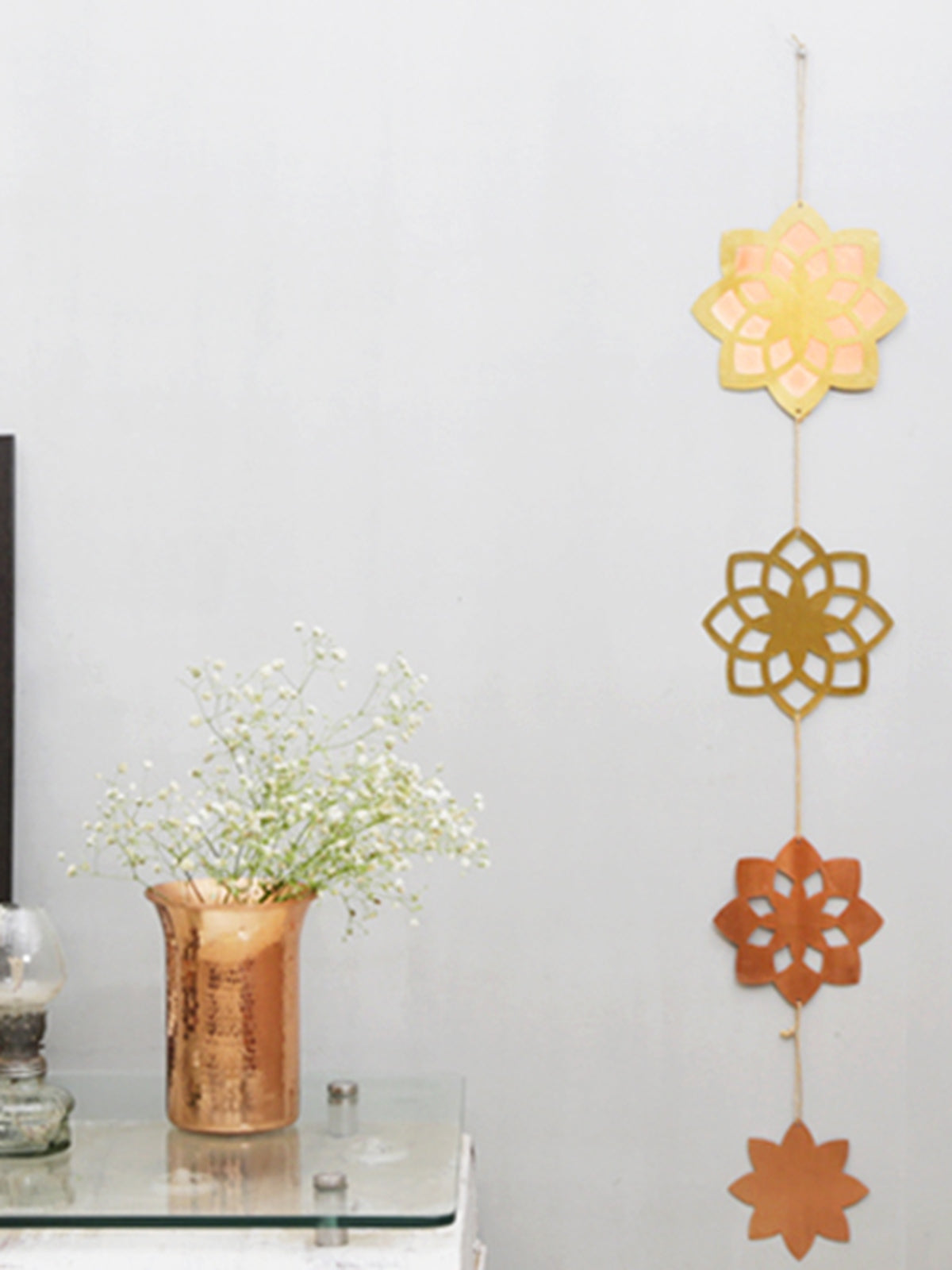 Instantly add warmth to any wall in your home with our stylized floral decor. This hanging wall décor with the stylized Lotus motif will add warmth with its metallic tones and brighten up any space with its sheen. Can be used as a meditation/yoga accessory too