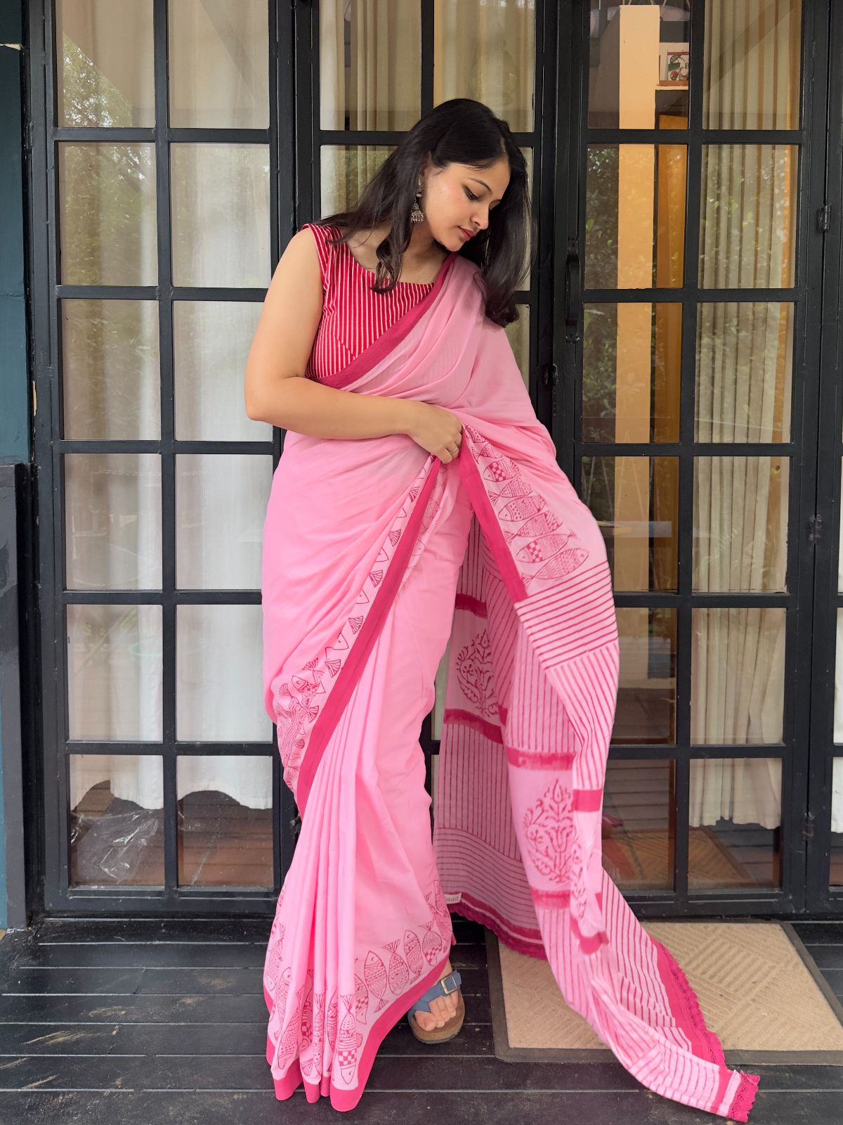 Looking for something that's one-of-a-kind, classy, stylish, and effortless to wear? Introducing Manchalli: a beautifully crafted pink saree with a fish print. Made from soft mul mul cotton, this saree is perfect for any occasion. Adorned with premium pure cotton lace on the pallu, Manchalli is sure to make you stand out.