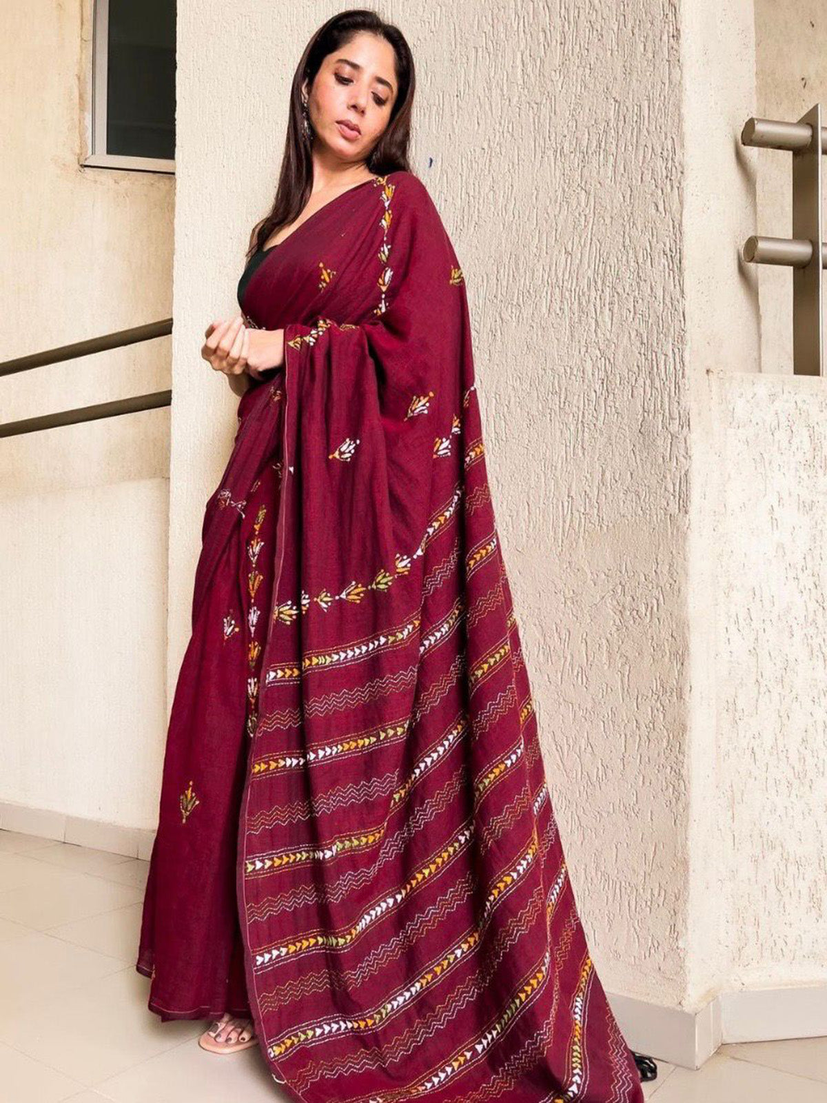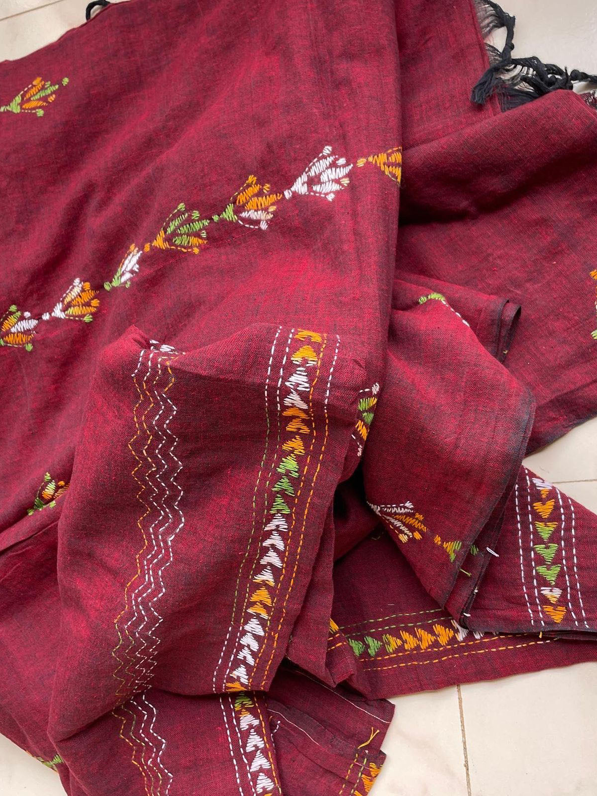 Hand embroidered Kantha Saree on a soft Mulmul Cotton. A comfort wear for your wardrobe that is made right from our heart.