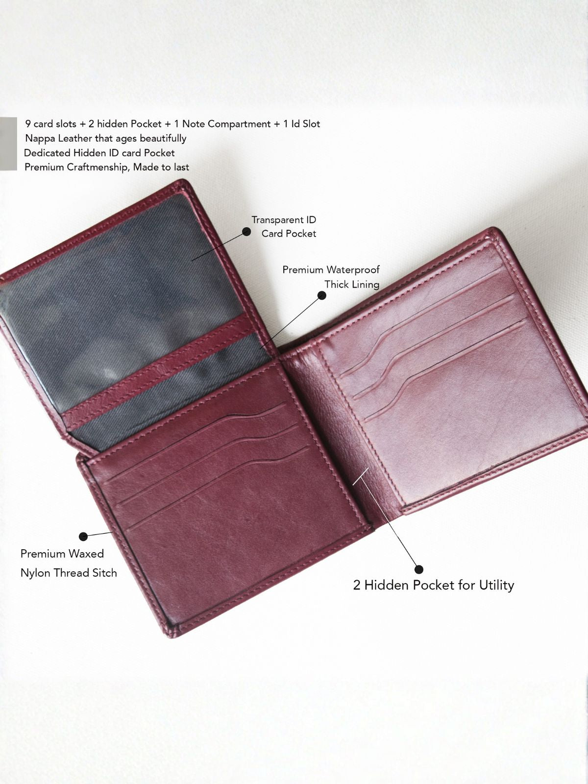 Luxurious Burgundy bifold wallet crafted in premium Nappa leather. Features 9 card slots and a dedicated ID space, offering ample storage for everyday essentials. Sleek, slim, and highly functional, this wallet combines modern elegance with practicality, making it ideal for travelers or professionals who appreciate refined organization and sophisticated design.