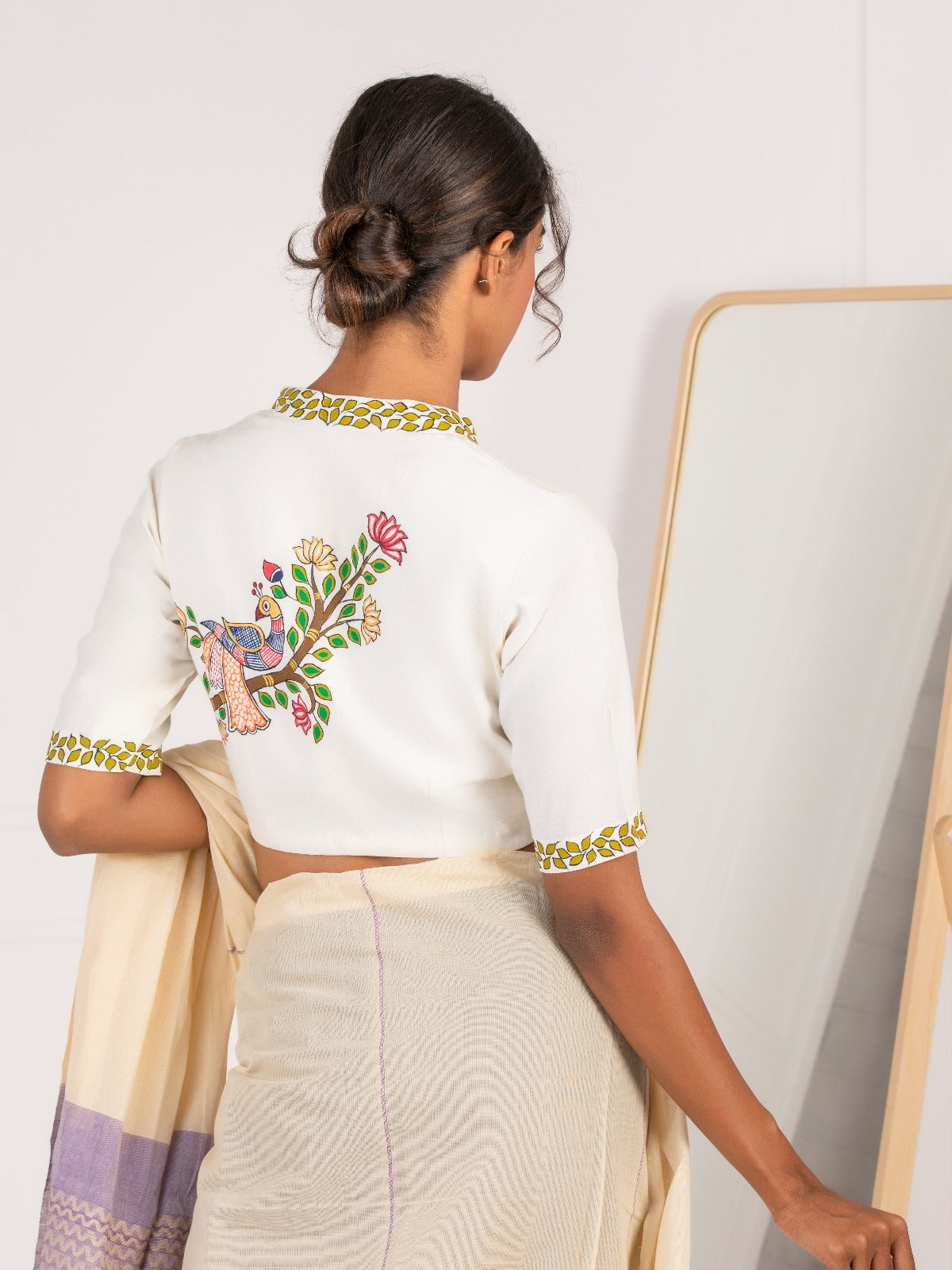 MayurAngan blouse showcases handpainted peacock motifs, representing grace and beauty. Crafted on pure fabric, each piece is a one-of-a-kind creation blending intricate detailing with timeless tradition. Perfect for pairing with saris or skirts, this blouse celebrates Indian craftsmanship while adding artistic charm and sophistication to your wardrobe’s most cherished outfits.
