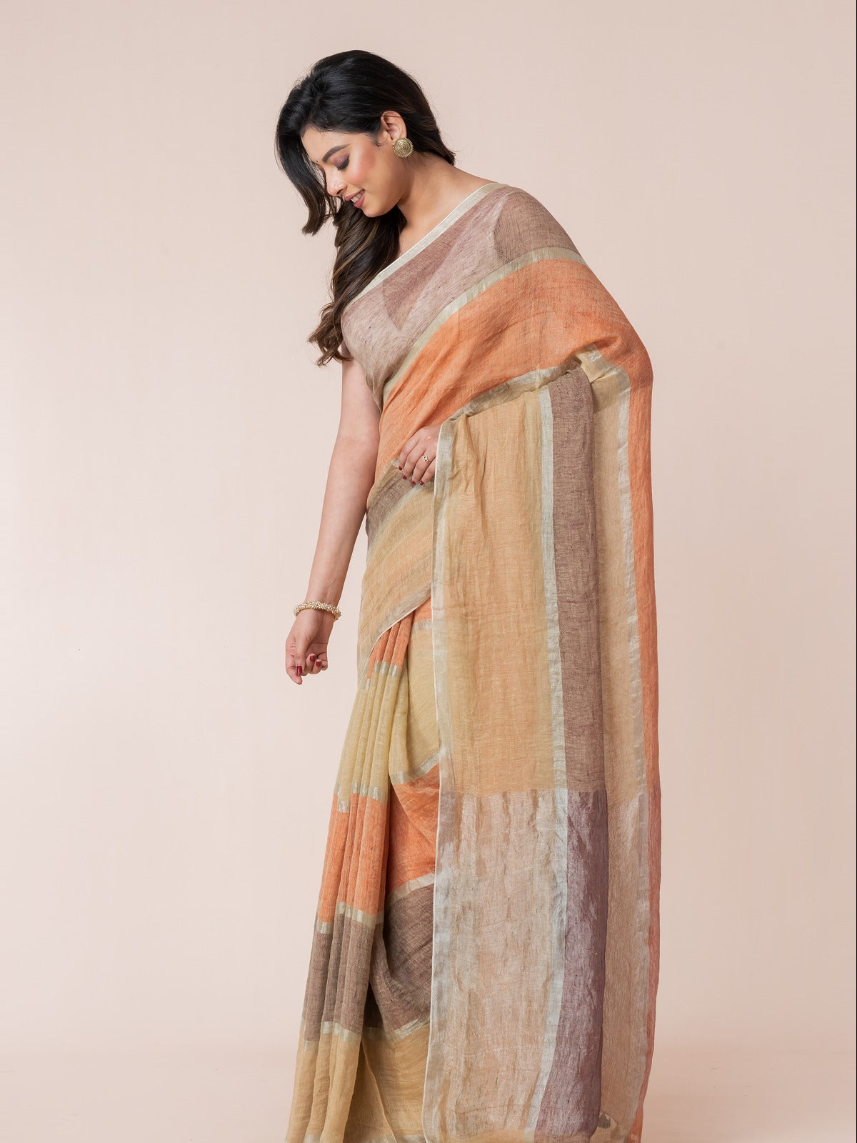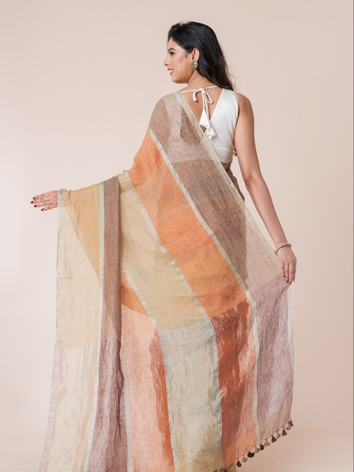 Soft, breezy, and effortlessly chic—this linen saree is designed to make festivities feel light and graceful. With its airy drape and subtle sheen, it complements joyful evenings, dance floors, and daytime celebrations alike. A perfect mix of comfort and glamour, it’s your go-to piece for modern festive elegance.