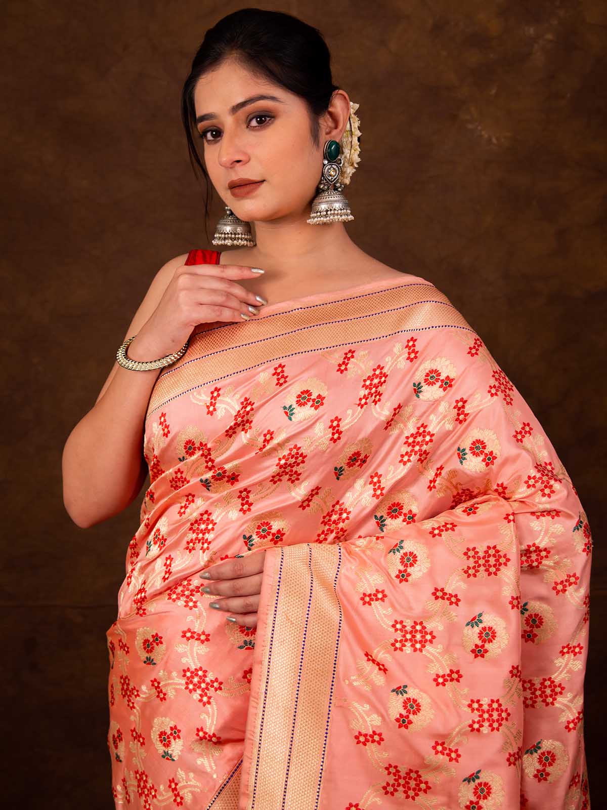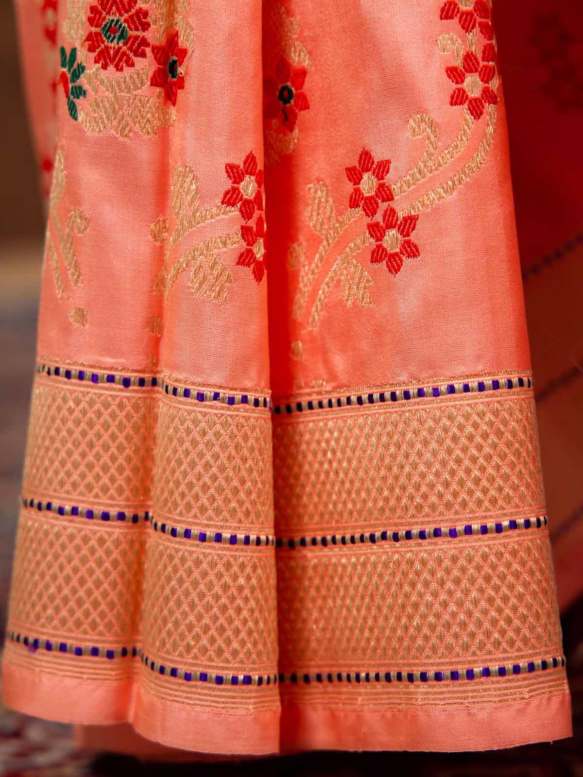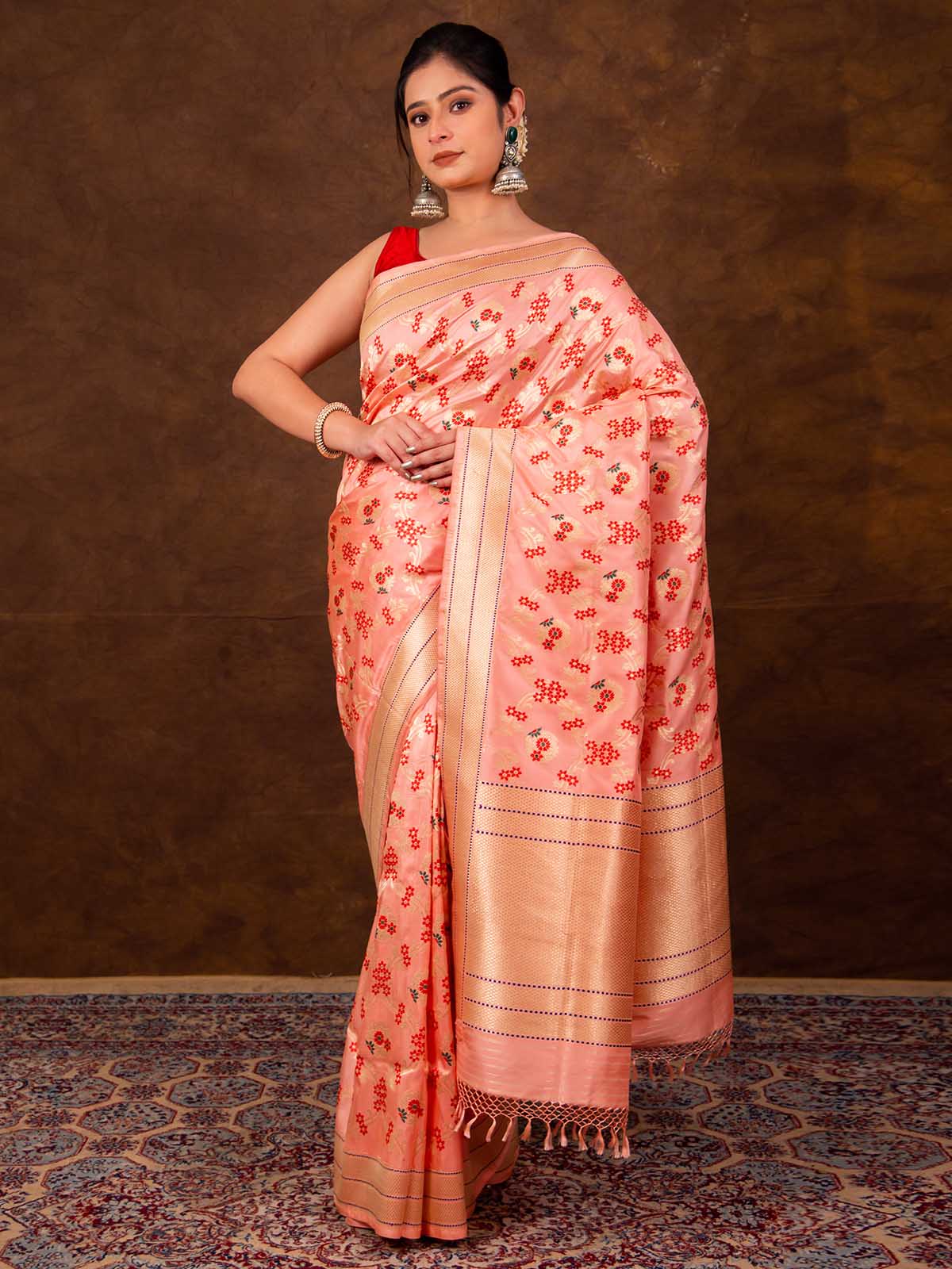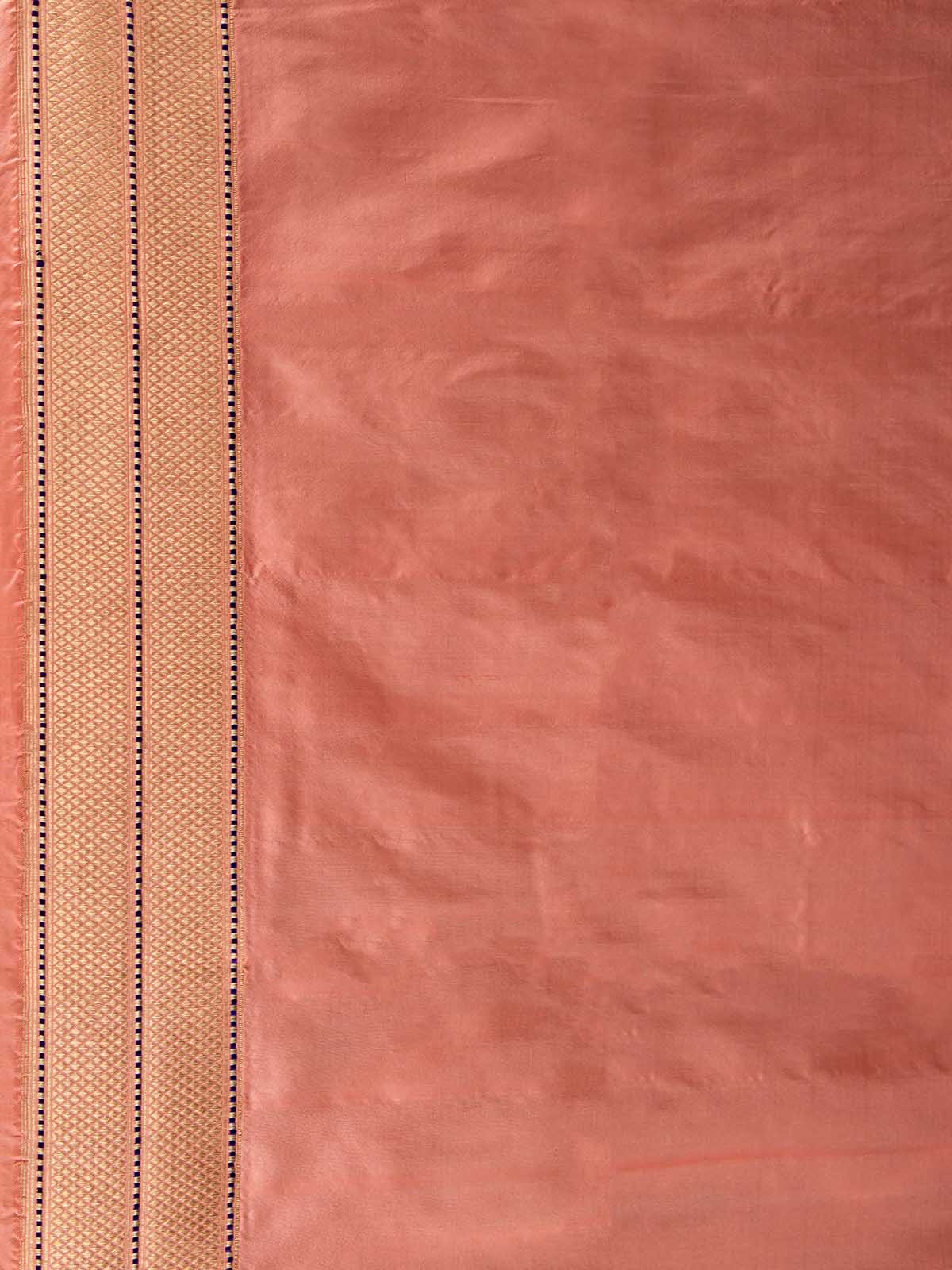 The saree in stunning Peach pink features the enduring Kadwa weave with exquisite Meenakari work. This elaborate Kadwa (Kadhua) technique involves hand-weaving each motif separately, creating a robust and striking pattern on the fabric. Made from soft, pure Katan Silk, it showcases a beautiful silk body in the finest Kadhua style, complemented by a geometric border, pallu, and contrast selvedge. The Semi Real Zari adds a sophisticated touch. Ideal for weddings, cocktail parties, or housewarming events, this elegant Banarasi weave saree includes a matching blouse piece for a complete look.