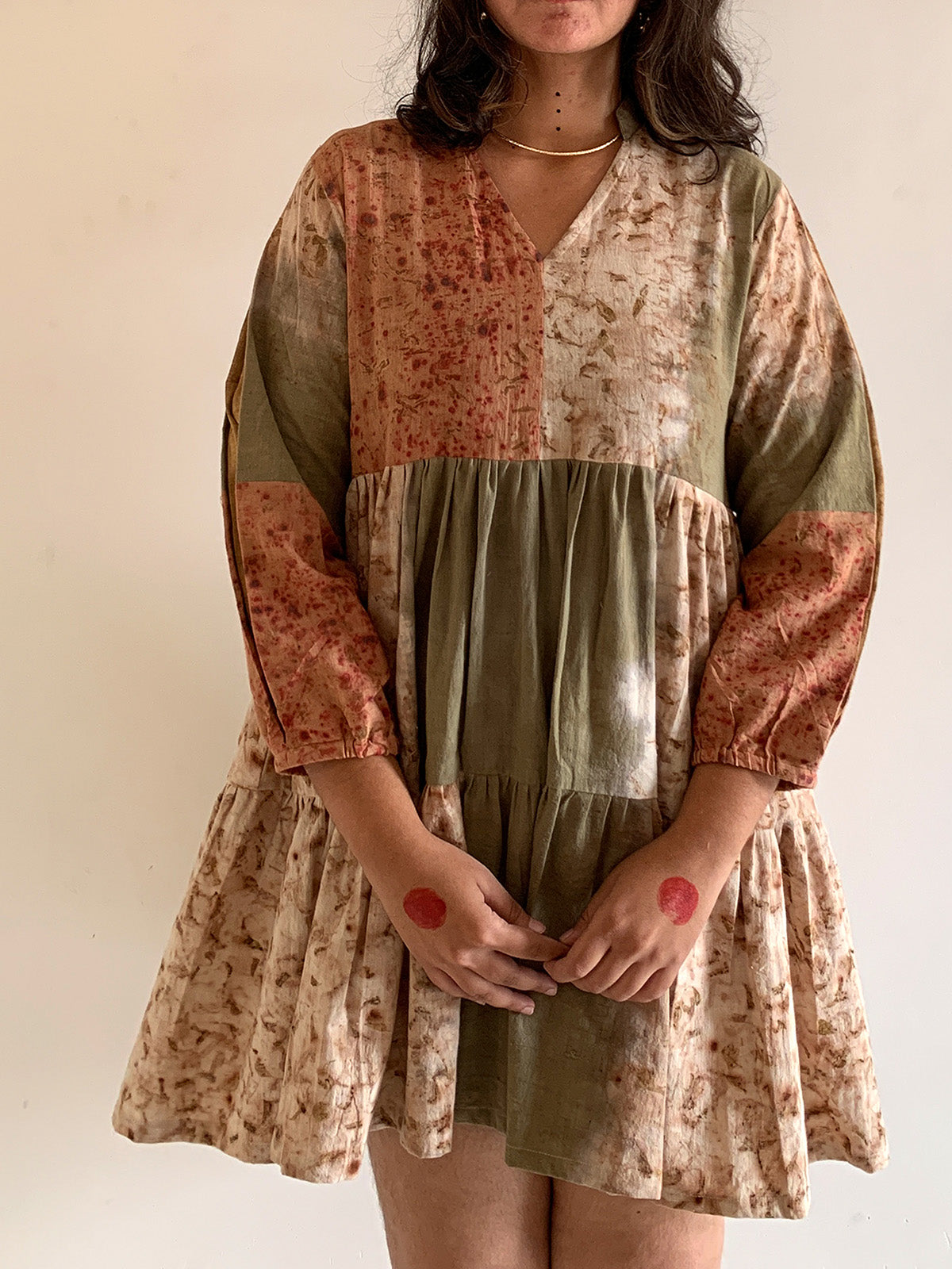 Introducing "Mistletoe," a captivating tiered dress exuding elegance and sustainability. Handcrafted from organic cotton by local weavers in Bihar, it showcases authentic craftsmanship. Dyed with natural ingredients like Harda and marigold petals, with a unique splatter effect from manjistha, each piece embodies tradition and environmental responsibility. The playful yet sophisticated silhouette, coupled with gold zari-detailed balloon sleeves, evokes mistletoe vibes, making it a timeless wardrobe addition suitable for any occasion. Style it with strappy sandals and minimal accessories for a versatile look that effortlessly transitions from day to night.