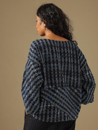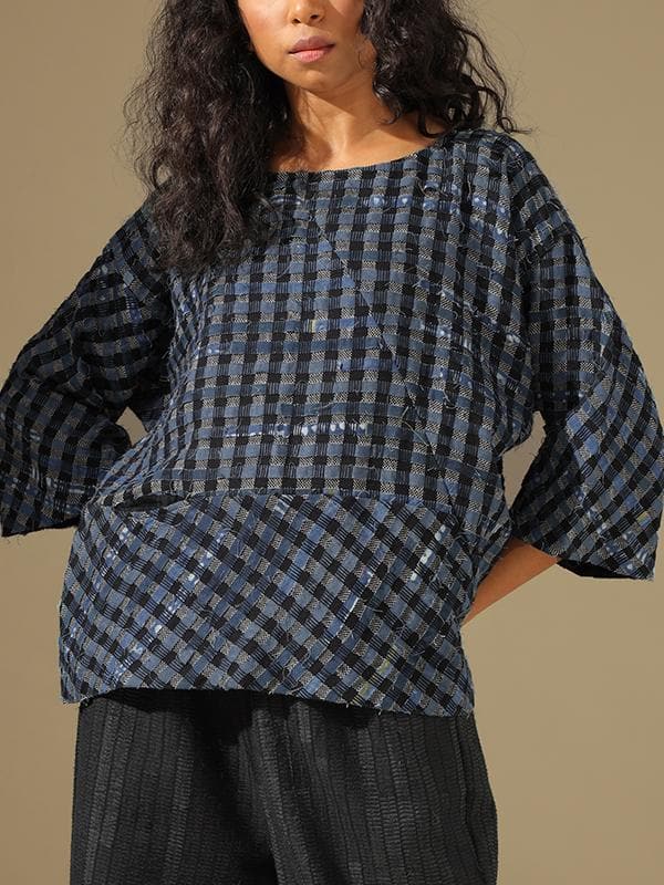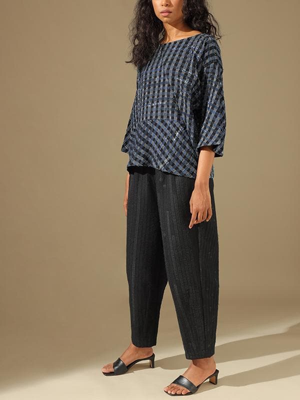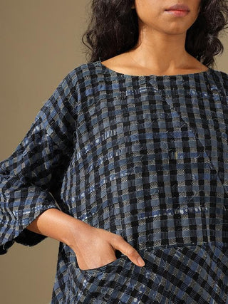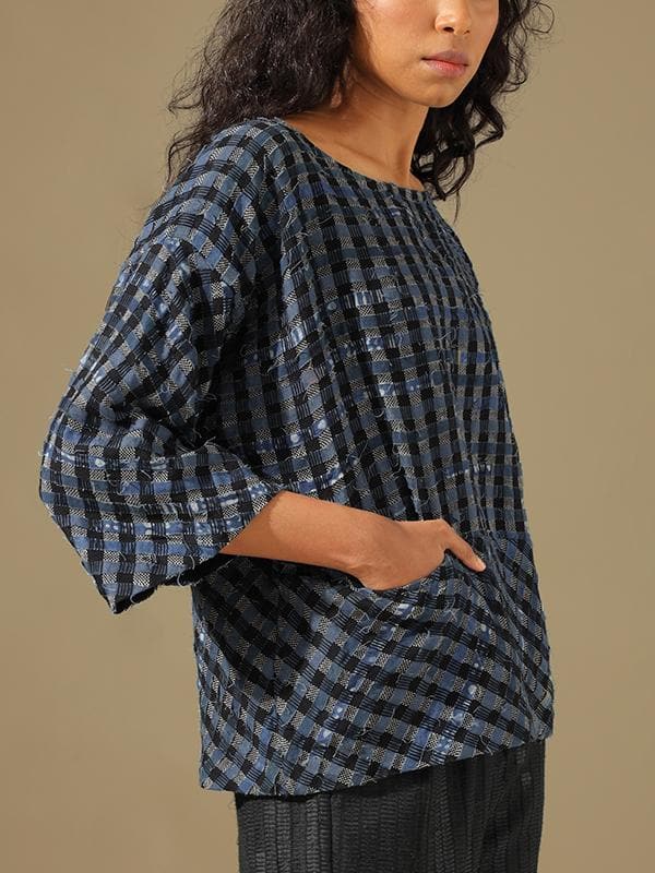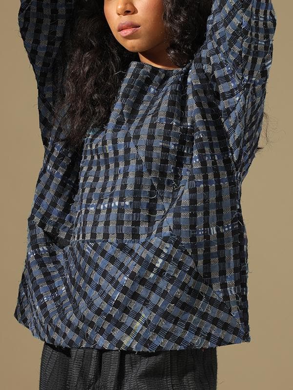 This one size shirt is made from natural dyed indigo cotton waste. The product has been lovingly handwoven and handcrafted by skilled artisans.Once the textile waste arrives at the workshop, it is assorted, washed and ironed, cut into strips, and joined together as per a specific design. Then the pools or bobbins are prepared for weaving. On the loom, weavers insert the prepared textile waste bobbin as weft to create the desired new textile. Each new textile is new life, being recreated into a new product.