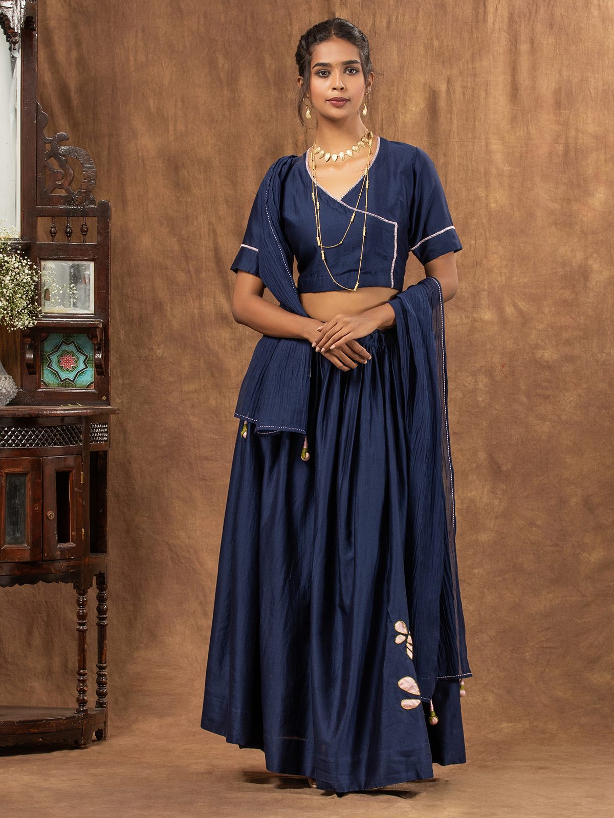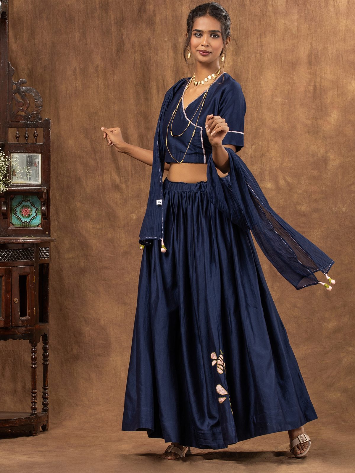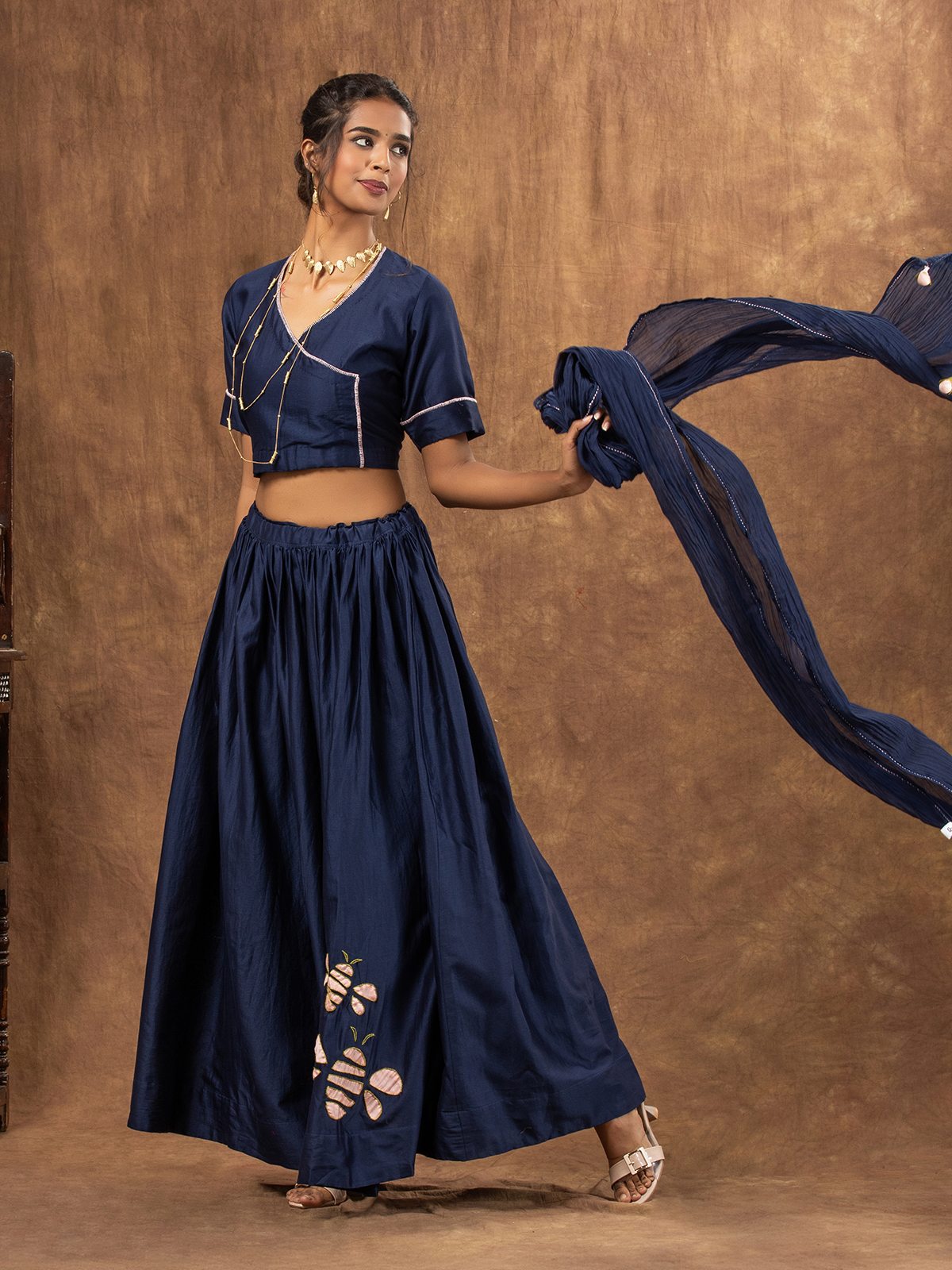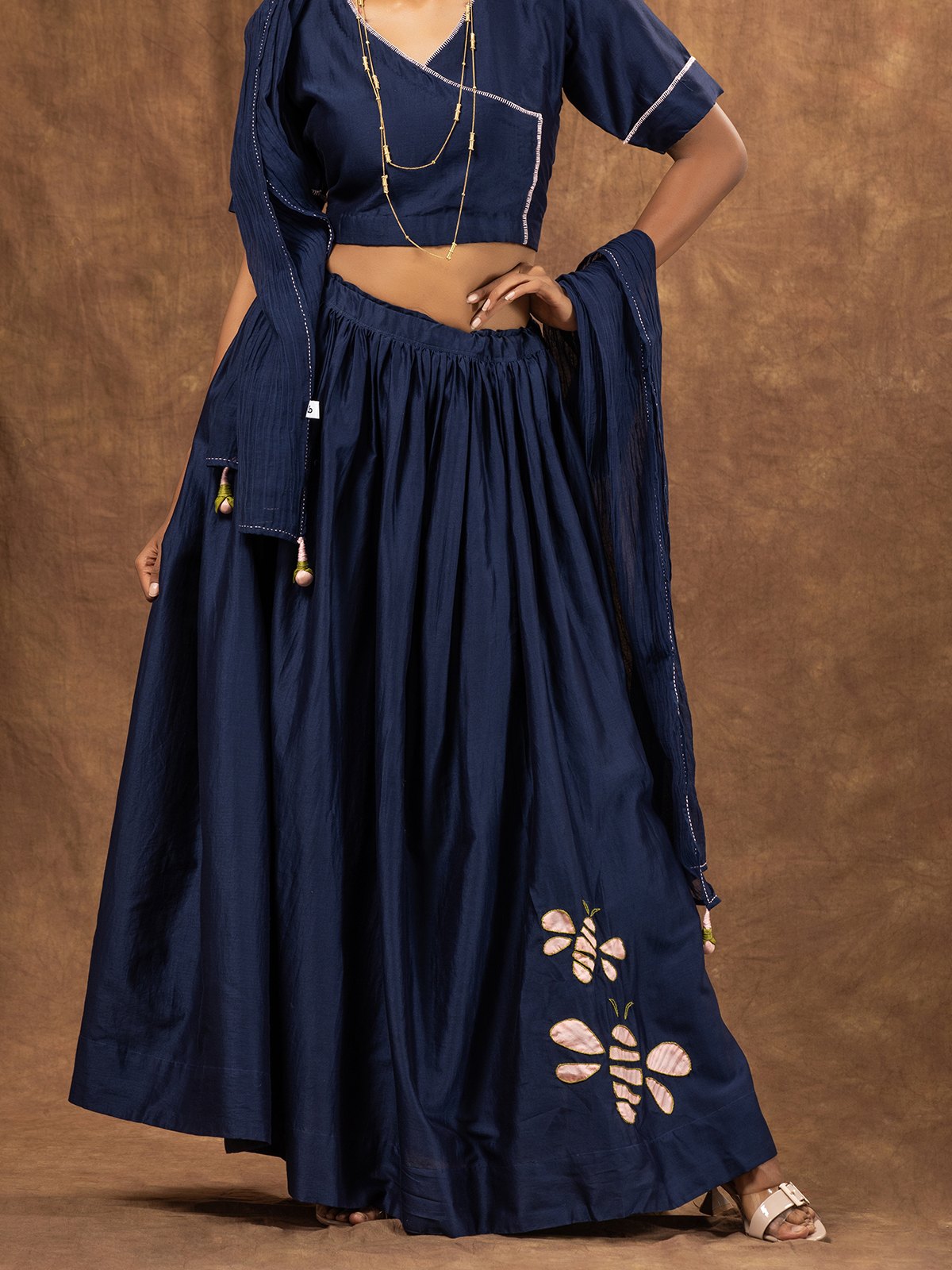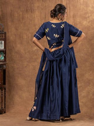 Buzzing with charm, this navy blue skirt set tailored in rich Cotton-silk fabric, the skirt is intricately embroidered in honeybee inspired appliqué motif adding a playful texture to deeply-hued fabric. The skirt has wrap style top with honeybee appliqué embroidered motifs at the back. Paired with sujani embroidered sheer Cotton-silk dupatta has delicate handcrafted tassels on each corner.