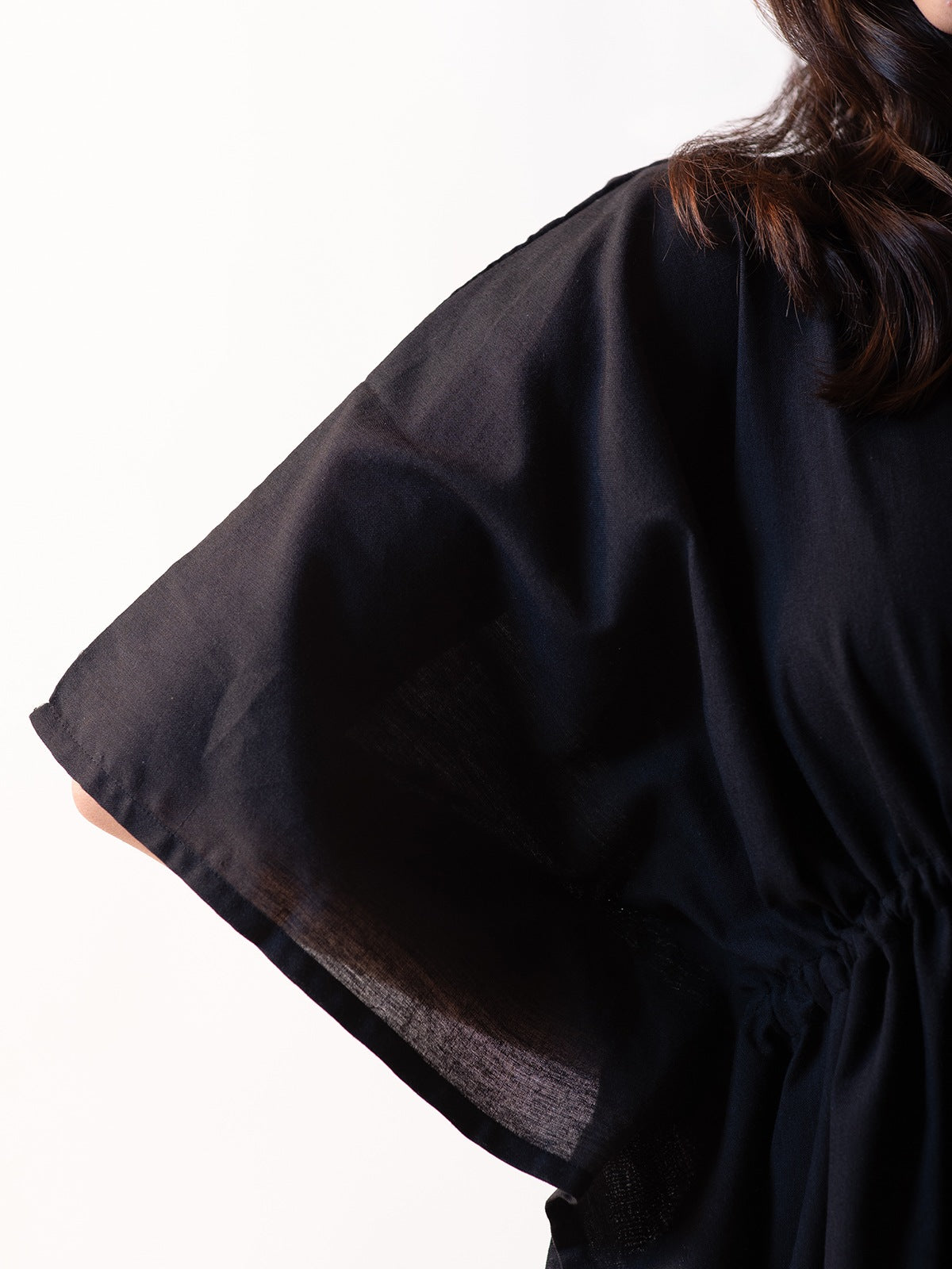 Designed for all body types, this kaftan dress offers comfort without compromising style. Featuring a drawstring detail for a customizable fit that defines your shape. A neutral black hue with subtle striped accents adds an understated edge. Featuring contrast striped weave details to break the neutral of black