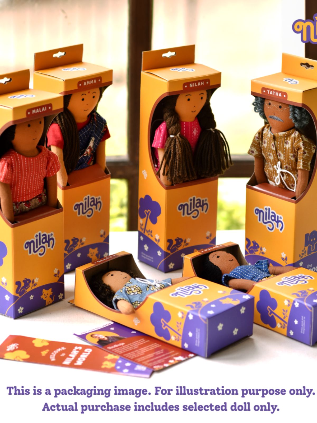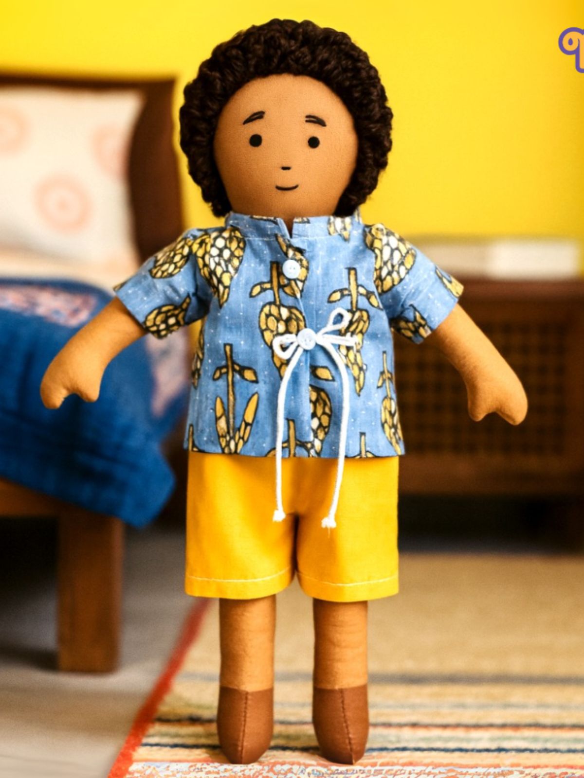 Crafted by hand and thoughtfully packaged, this fabric doll celebrates the spirit of the Nilgiris—India's mystical Blue Mountains. Raagu, Nilah's younger brother, arrives dressed in his signature blue shirt, ready for imaginative play. Both the doll and his garments are fully washable and durable, with interchangeable clothing and styleable hair. Built to last, any wear can be easily repaired at home. This inclusive, body-positive character embodies the gentle strength of his mountain heritage, making him an ideal companion for children who appreciate storytelling rooted in nature and culture.
