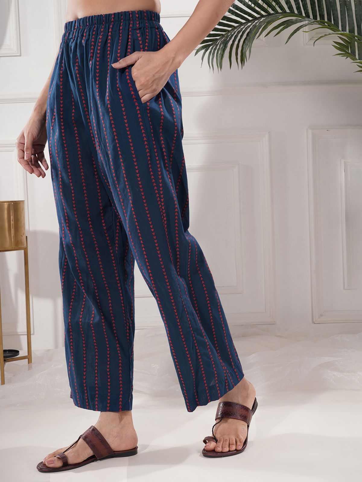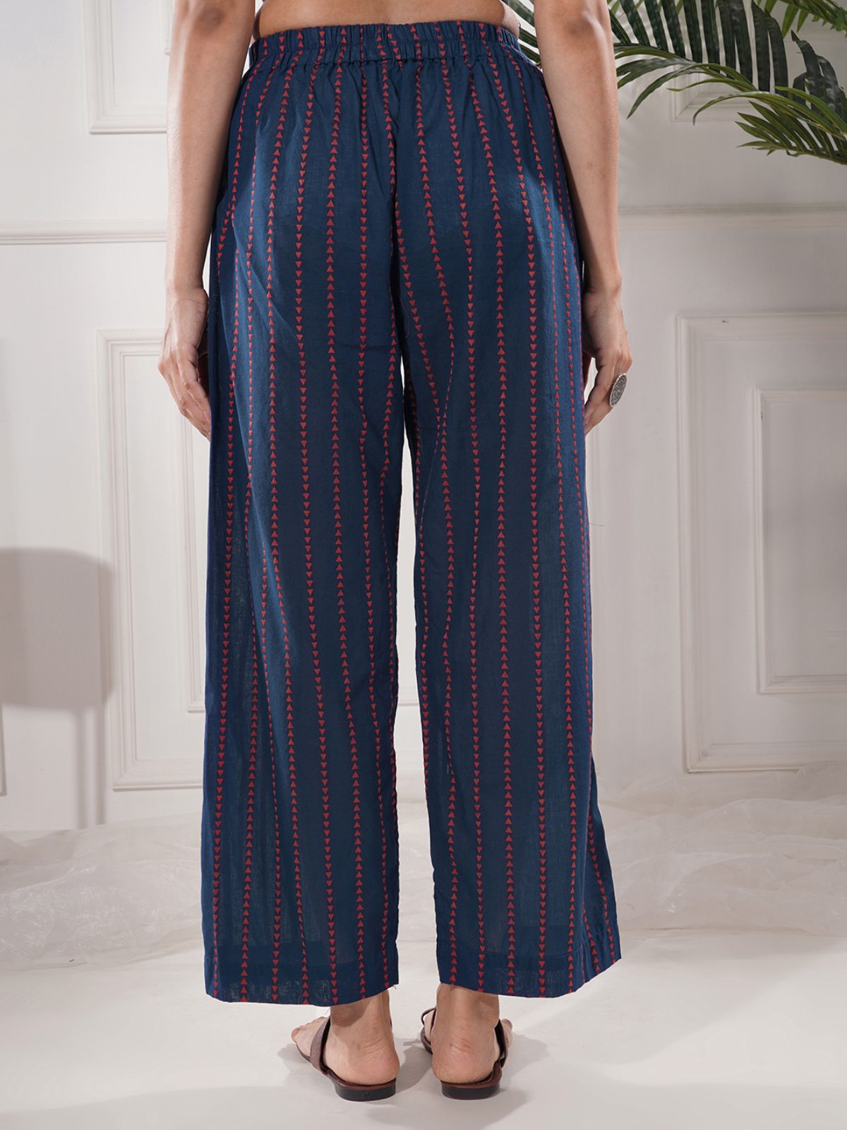 Stay stylish and comfortable with our Noorah Blue pure cotton wide-leg palazzo. Crafted in premium cotton, which features a relaxed fit, an elasticated waist, and handy pockets. It pairs seamlessly with kurtas, crop tops, and tunics, A perfect wardrobe staple bottom for women who love flexible fits and comfort.