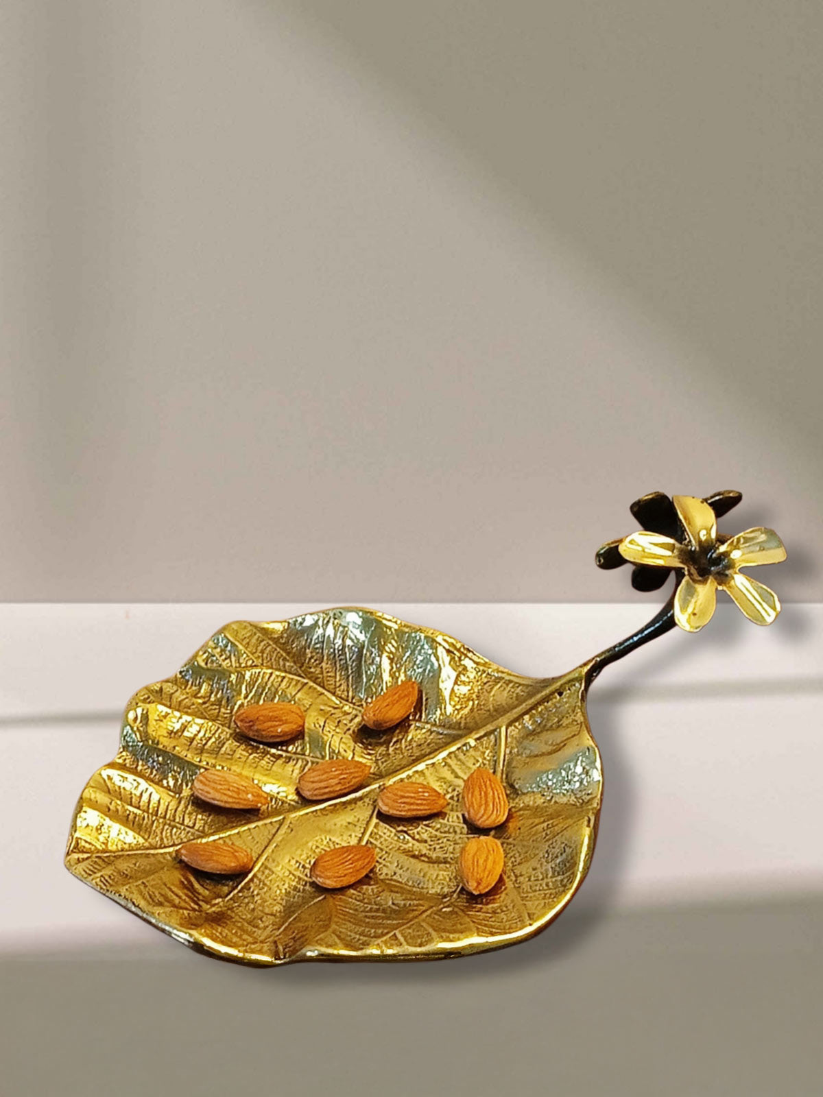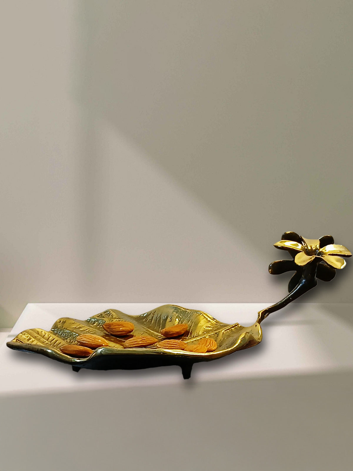 PatrPushp Thaal is a handcrafted brass platter shaped like a delicate leaf adorned with a blooming flower. Showcasing fine Indian metal artistry, it’s perfect for serving dry fruits or as a decorative accent. Its rich golden finish adds elegance and a traditional charm to any festive or everyday setting.