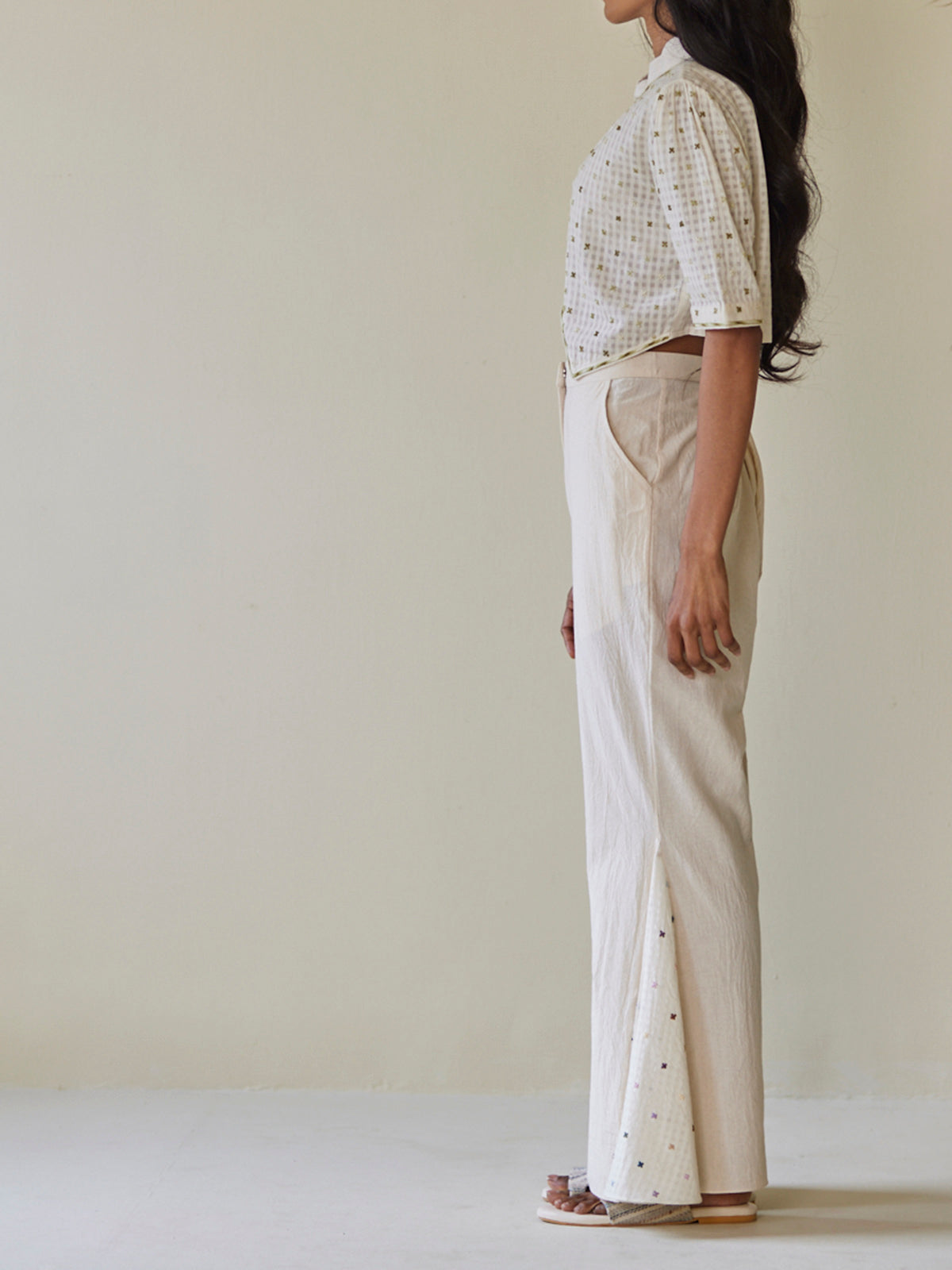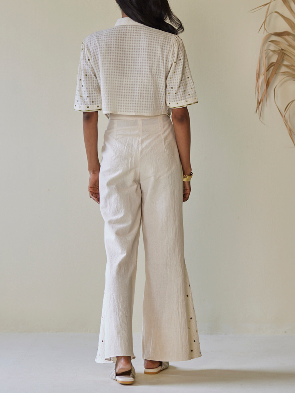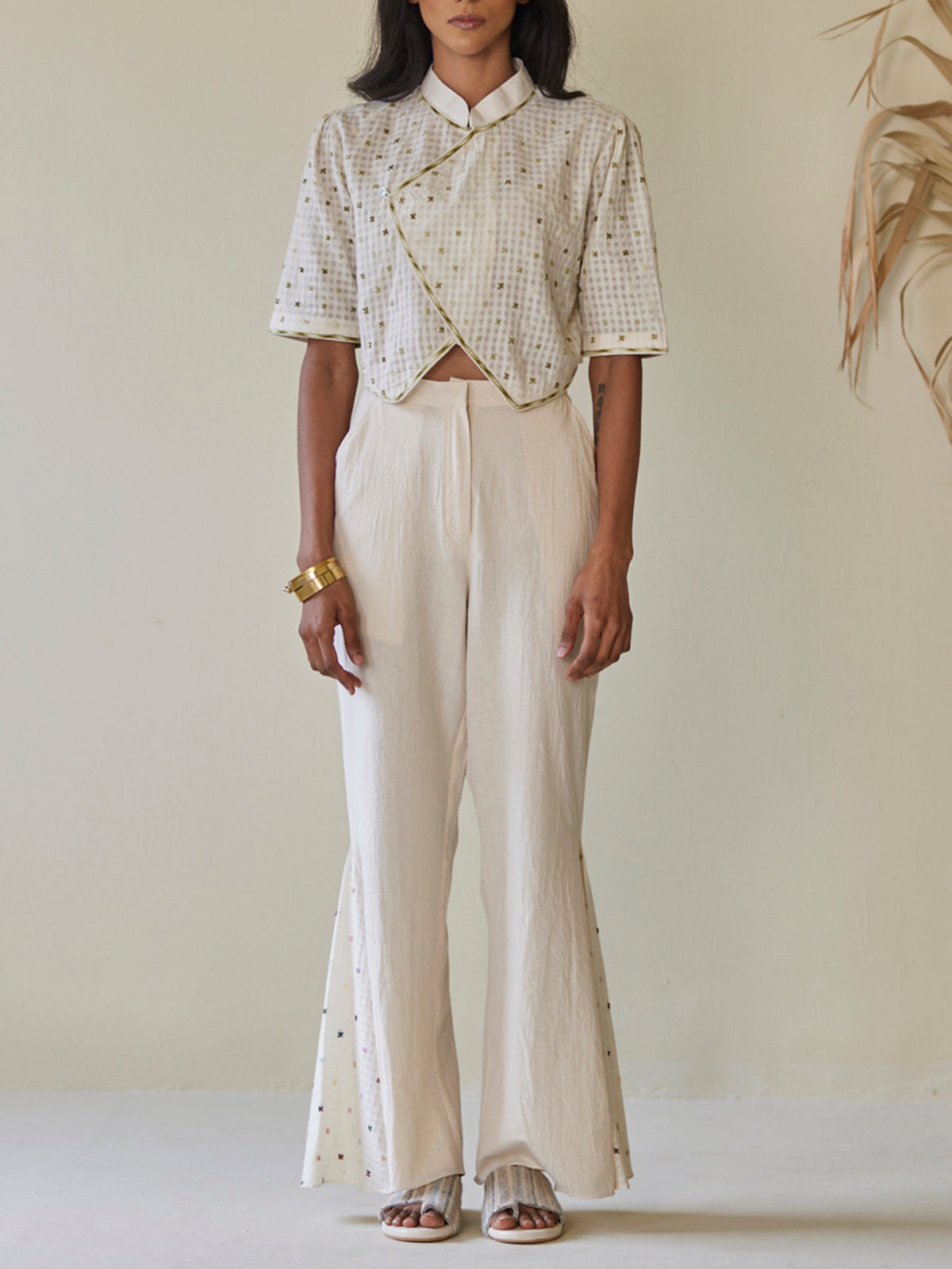 This Petal shirt is the perfect combination of style and comfort. Crafted with hand woven self check cotton fabric and hand embroidered French knots, the shirt features an angular overlap design and a Chinese collar. It's waist length, making it perfect for pairing with flared pants for a dressy look.