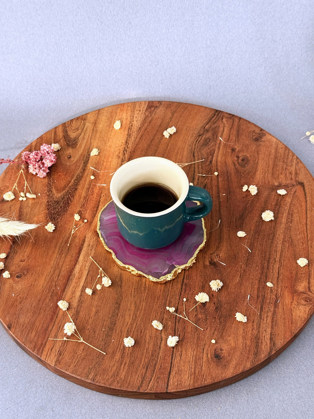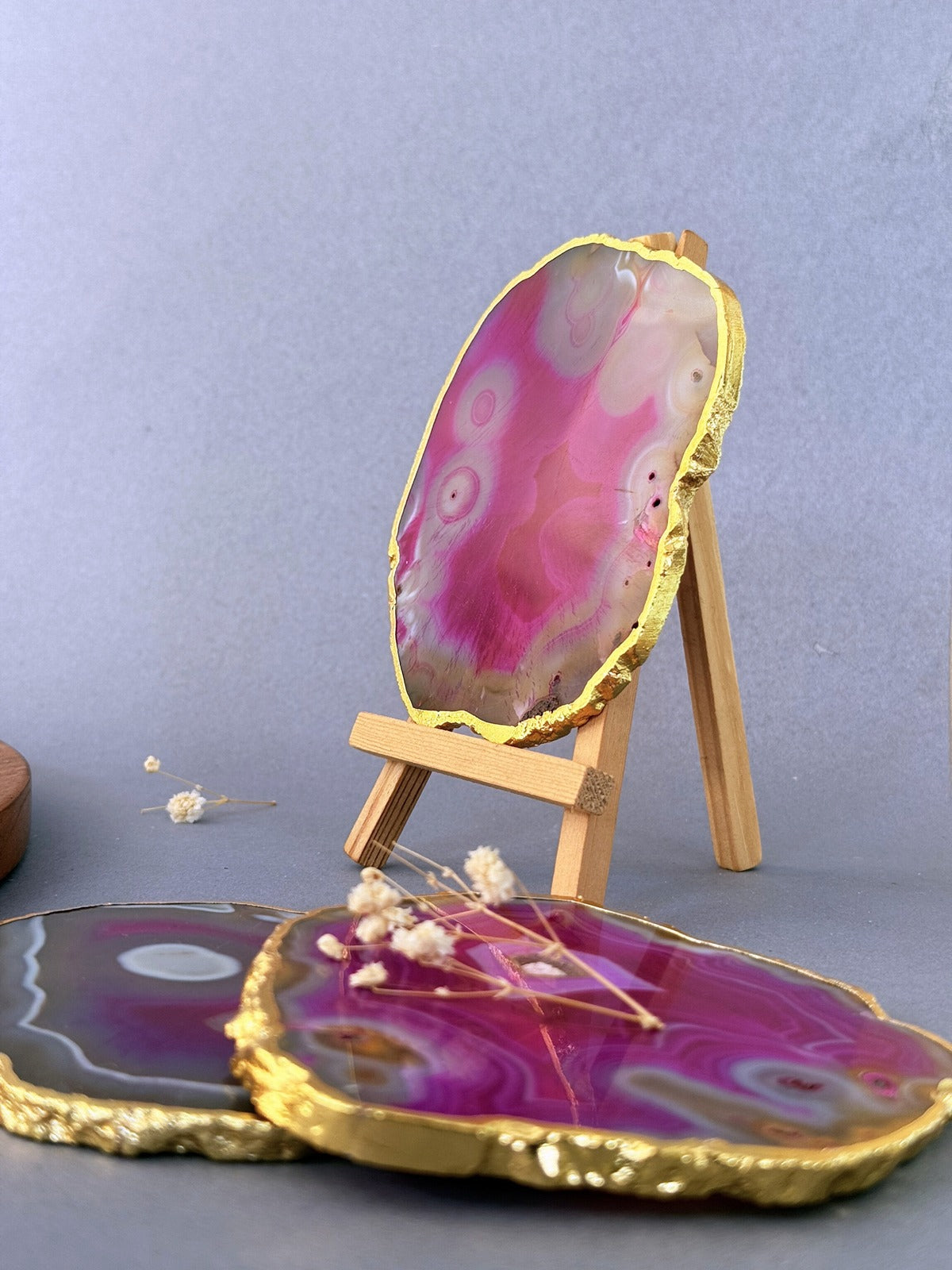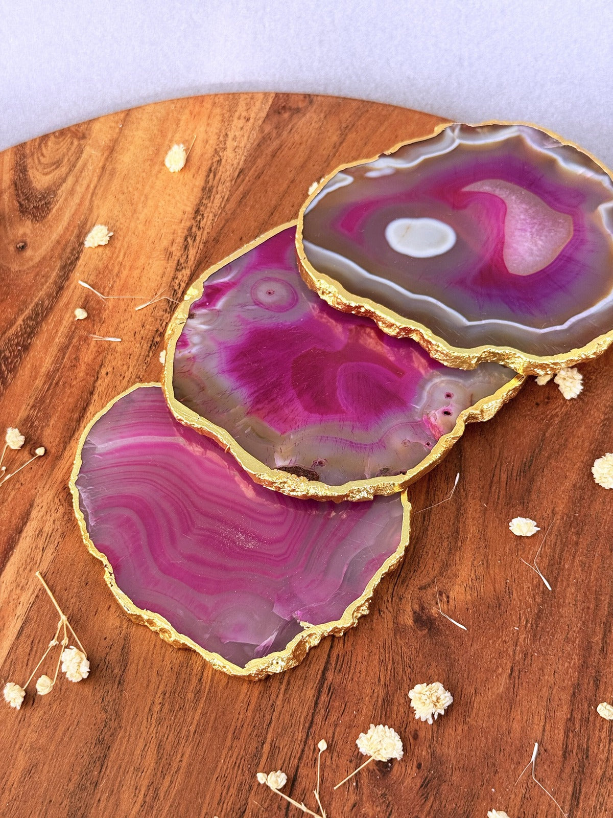 Soft, nurturing, and beautiful—these pink agate coasters radiate warmth and compassion. Gold edging elevates their charm, making them perfect for gifting or personal rituals.