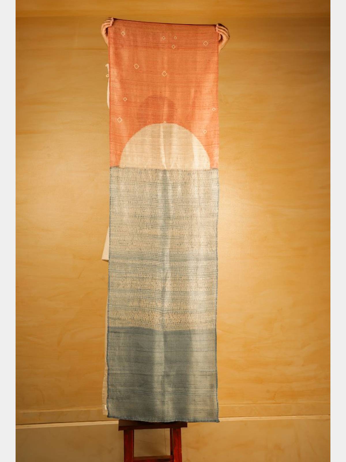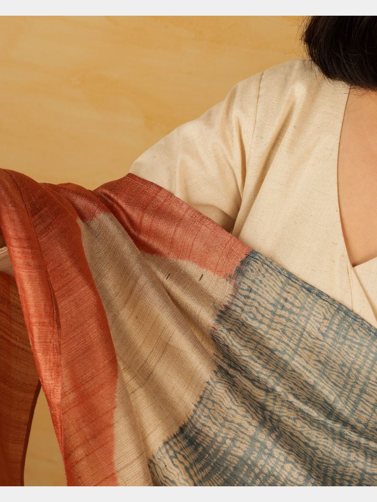 This stole is a subtle tribute to the night sky. Crafted with Shibori techniques on pure tussar silk, it reflects the gentle flow of dusk and the profound hues of night. The tussar’s natural texture and warm beige tone illuminate the undyed areas, creating a delicate interplay of light and shadow with every fold. The dye softly spreads across the silk, emphasizing the fabric’s raw weave and the grace of its untouched sections. Each stole is uniquely marked by slight variations in dye and texture, embodying an exclusive character. Colored with natural Indigo and Manjistha dyes, these pieces may show slight color shifts over time, enriching their individuality.