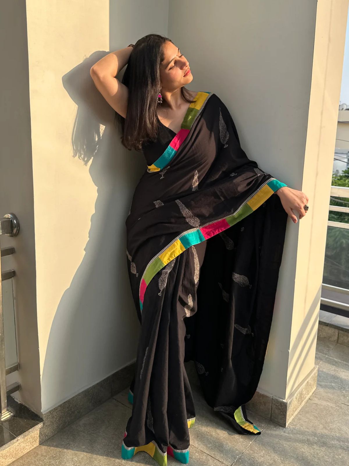 This sophisticated mul cotton saree showcases an arresting black palette enhanced by artisanal hand block printing and distinctive patchwork construction. The fabric's inherent lightness delivers comfort without compromising on visual impact, making it an ideal choice for those seeking refined ethnic wear that bridges traditional craftsmanship with modern sensibilities. Perfect for curated occasions, relaxed evening gatherings, and discerning fashion enthusiasts who appreciate textile artistry.