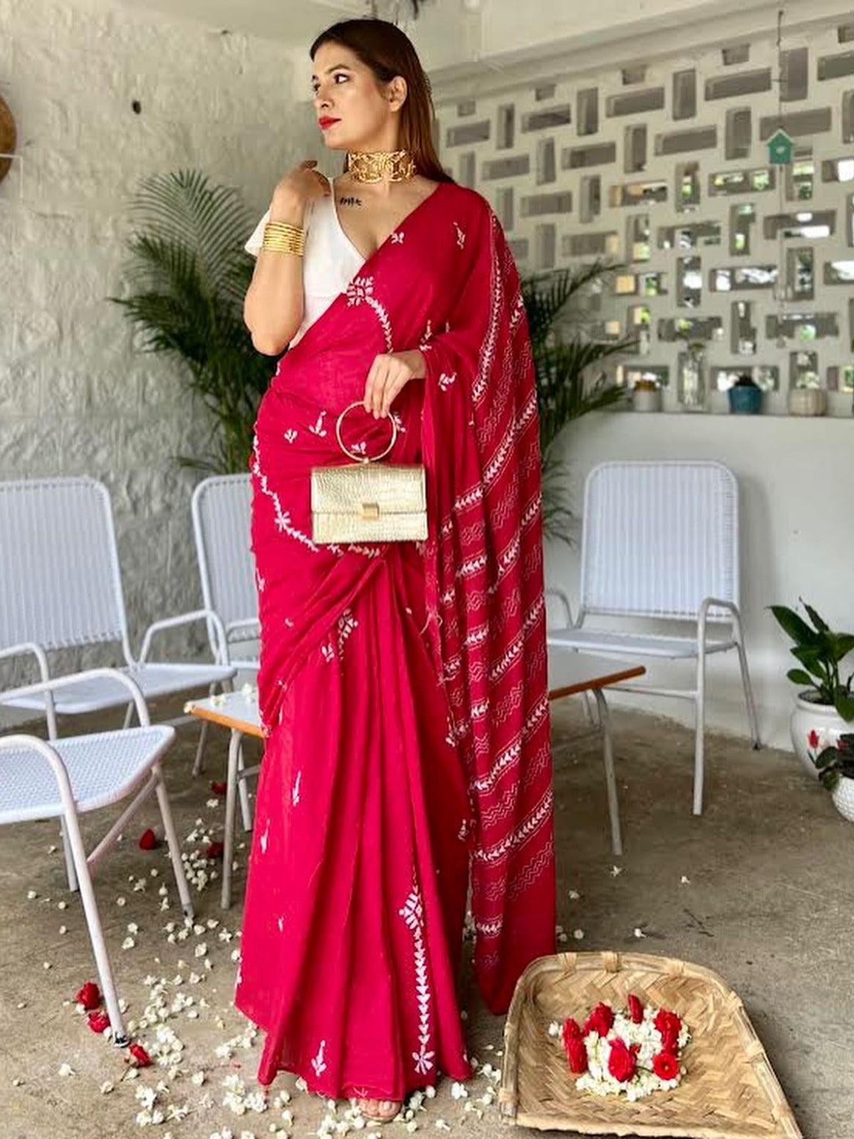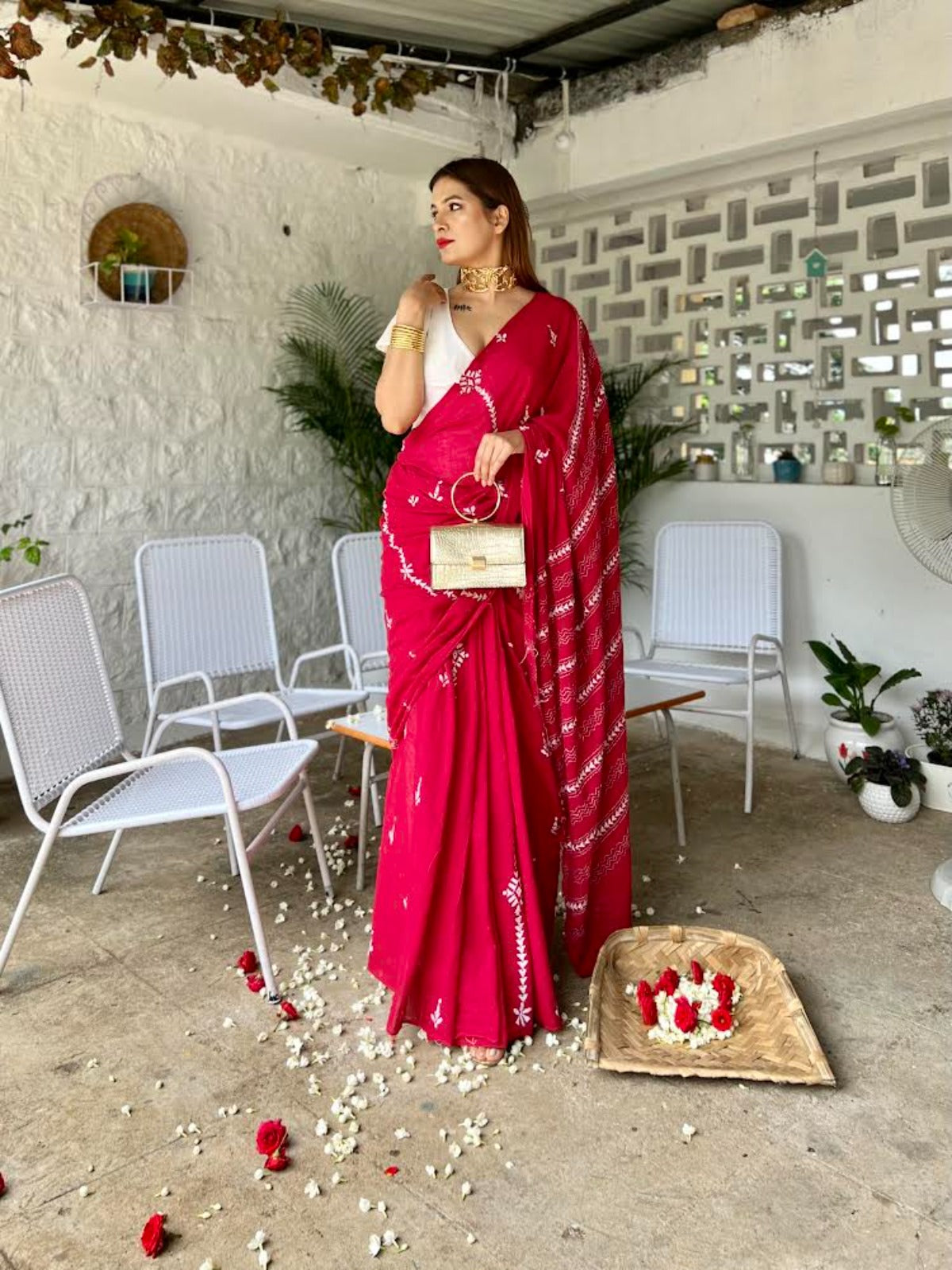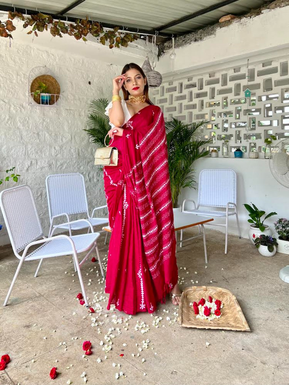 Discover understated artistry in the Red Kantha Saree, hand-embroidered on soft Mul Cotton by Shantiniketan women artisans. Lightweight and versatile, it’s perfect for everyday elegance or intimate occasions. Celebrate cultural heritage and support artisan livelihoods while elevating your wardrobe with this sophisticated, handcrafted piece.