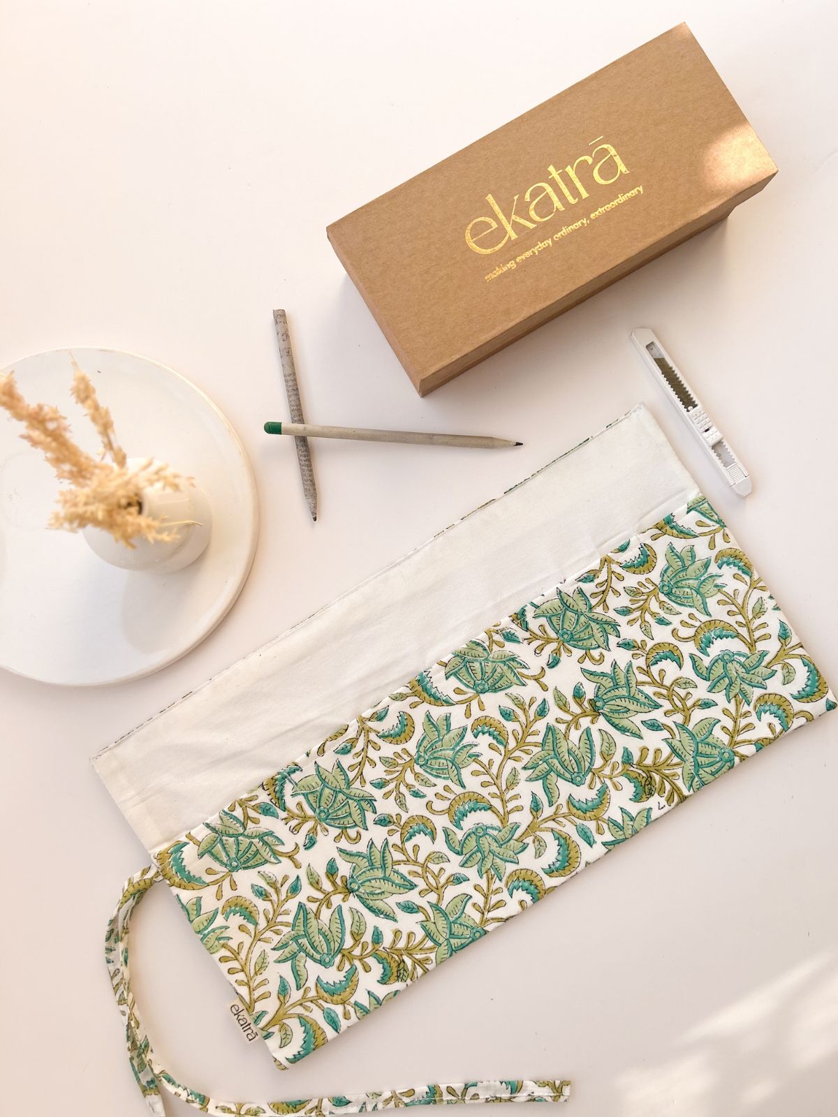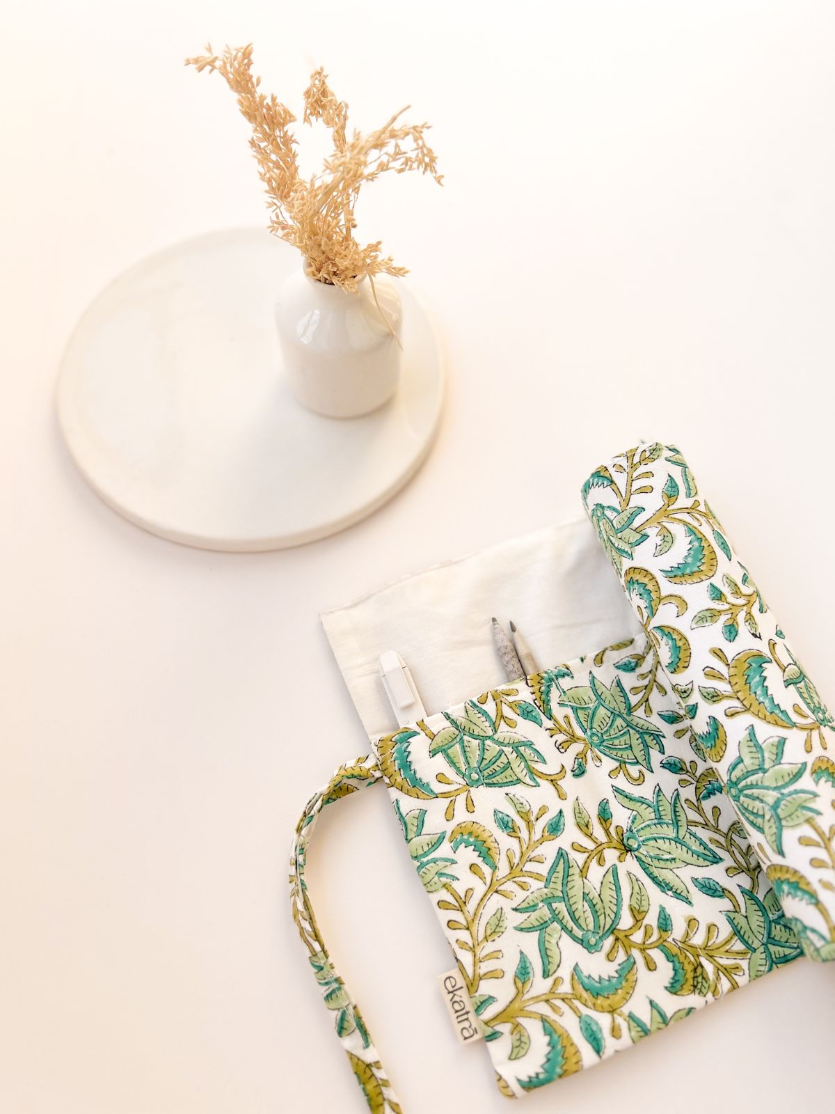 A handcrafted storage solution for daily life, for travel or for a gift for your favourite makeup hoarder or artist, these brush rolls are a perfect fit. Ekatra's Handstitched Fabric Roll Up Cases are made of durable Cotton fabric, these roll-up cases are lightweight and long lasting. It can easily fit into your purse or suitcase when you go out or travel.