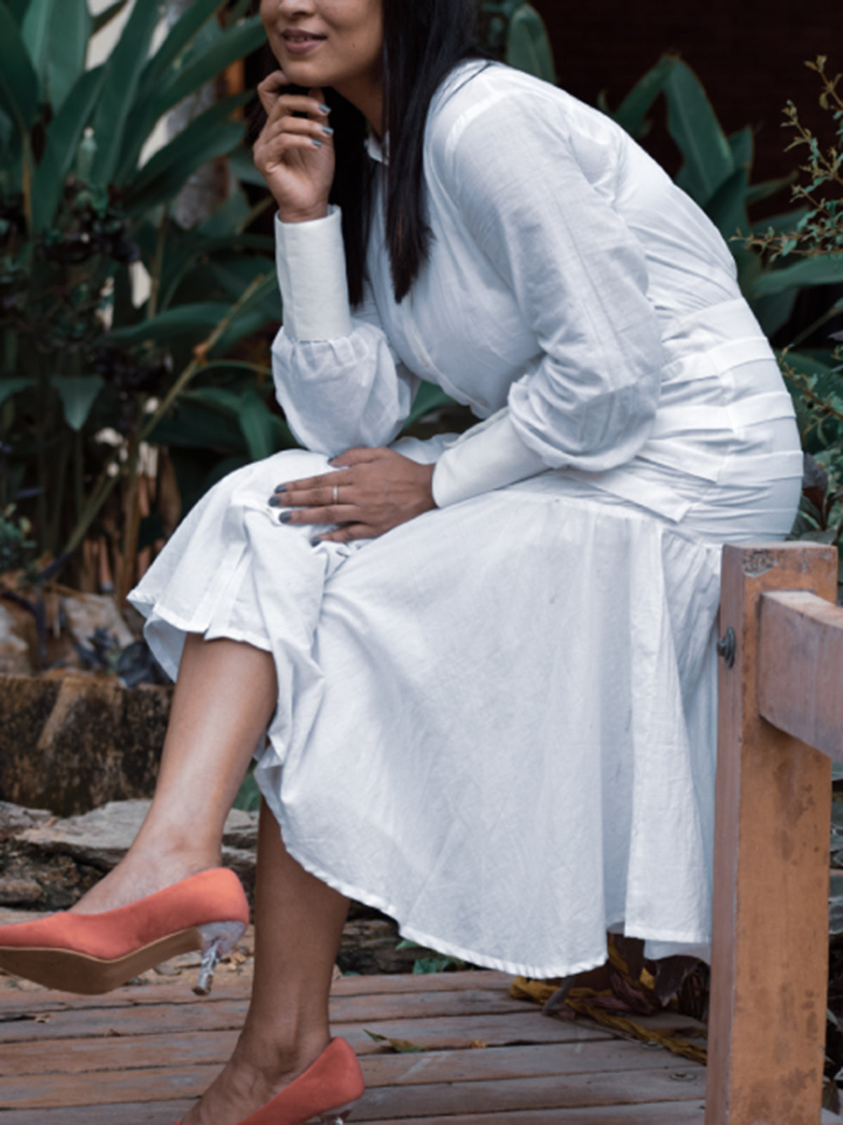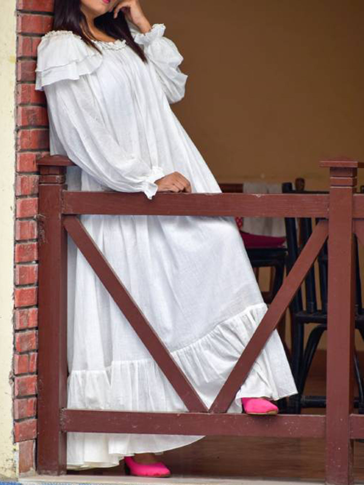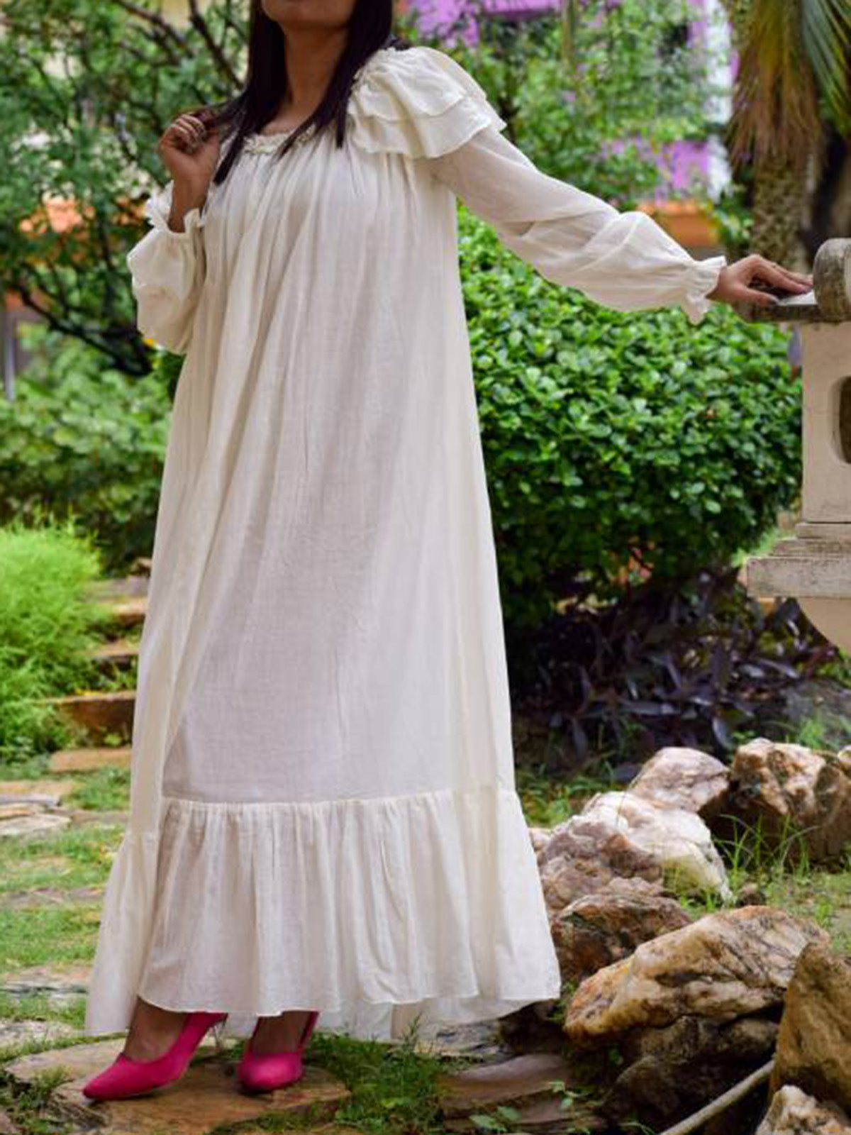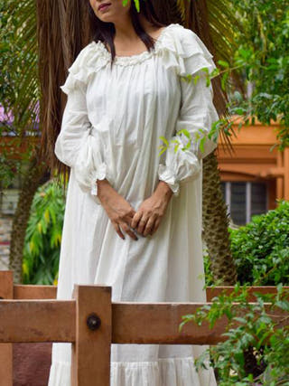 Enter the enchanting realm of Aeolian Fantasy, where intricate craftsmanship meets delicate elegance. This collection showcases meticulous attention to detail, ensuring each piece boasts a perfect fit and flattering silhouette. Crafted from eco-friendly Muslin Cotton, the Long & Loose Maxi Dress features long ruffled sleeves for added charm. Proudly Made in India, this creation embodies sustainability and timeless sophistication, making it a must-have addition to your wardrobe.